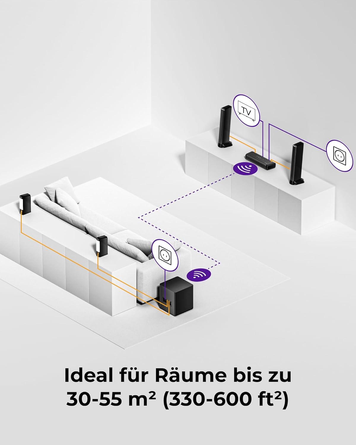 • Безпроблемна съвместимост с връзка - Саундбарът има двойни опции за кабелна и безжична връзка, включително ARC, оптичен, AUX и USB портове (всички кабели са включени). Технологията Bluetooth 5.3 осигурява по-високи скорости и обхват до 15 метра.