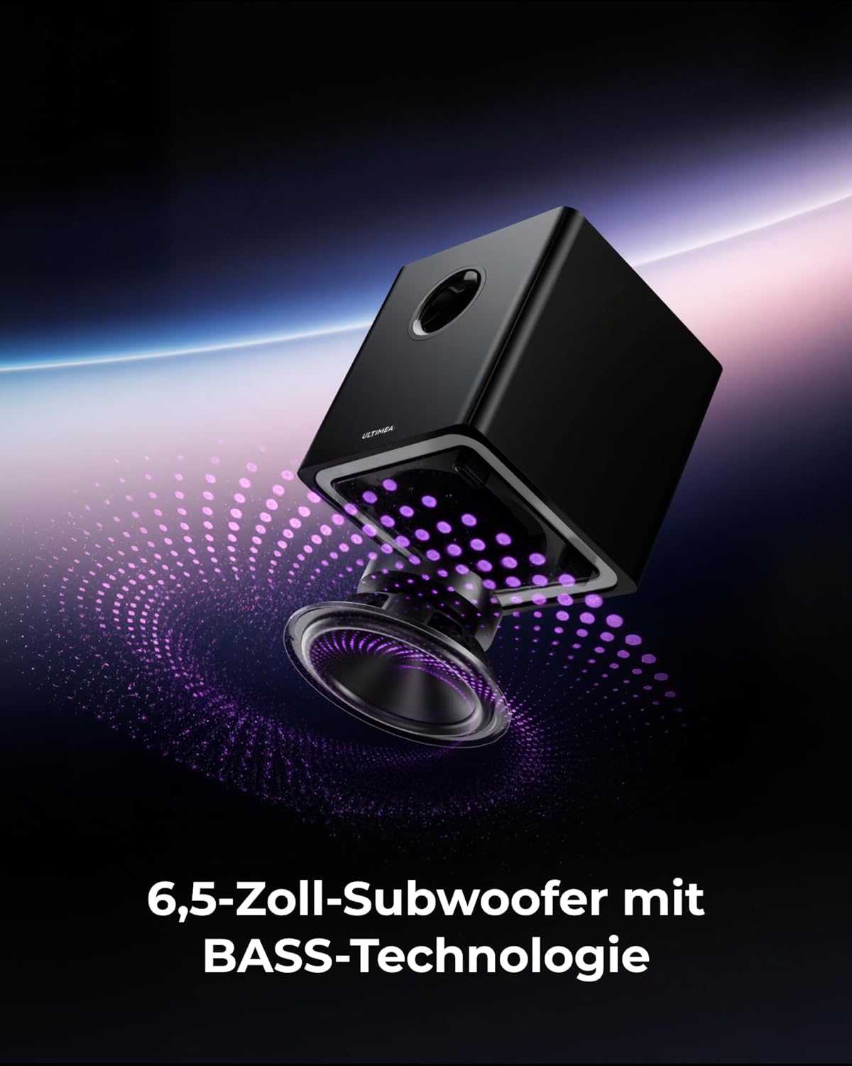 • Персонализирано звуково изживяване - Подобрете качеството на звука с 3 режима на еквалайзер за музика, филми и игри. Ексклузивната технология BassMX на Ultimea разширява ниските честоти и позволява регулируем бас за пулсиращ, бумтящ бас. Всички режими се избират лесно с натискане на бутон чрез настройките на еквалайзера.
