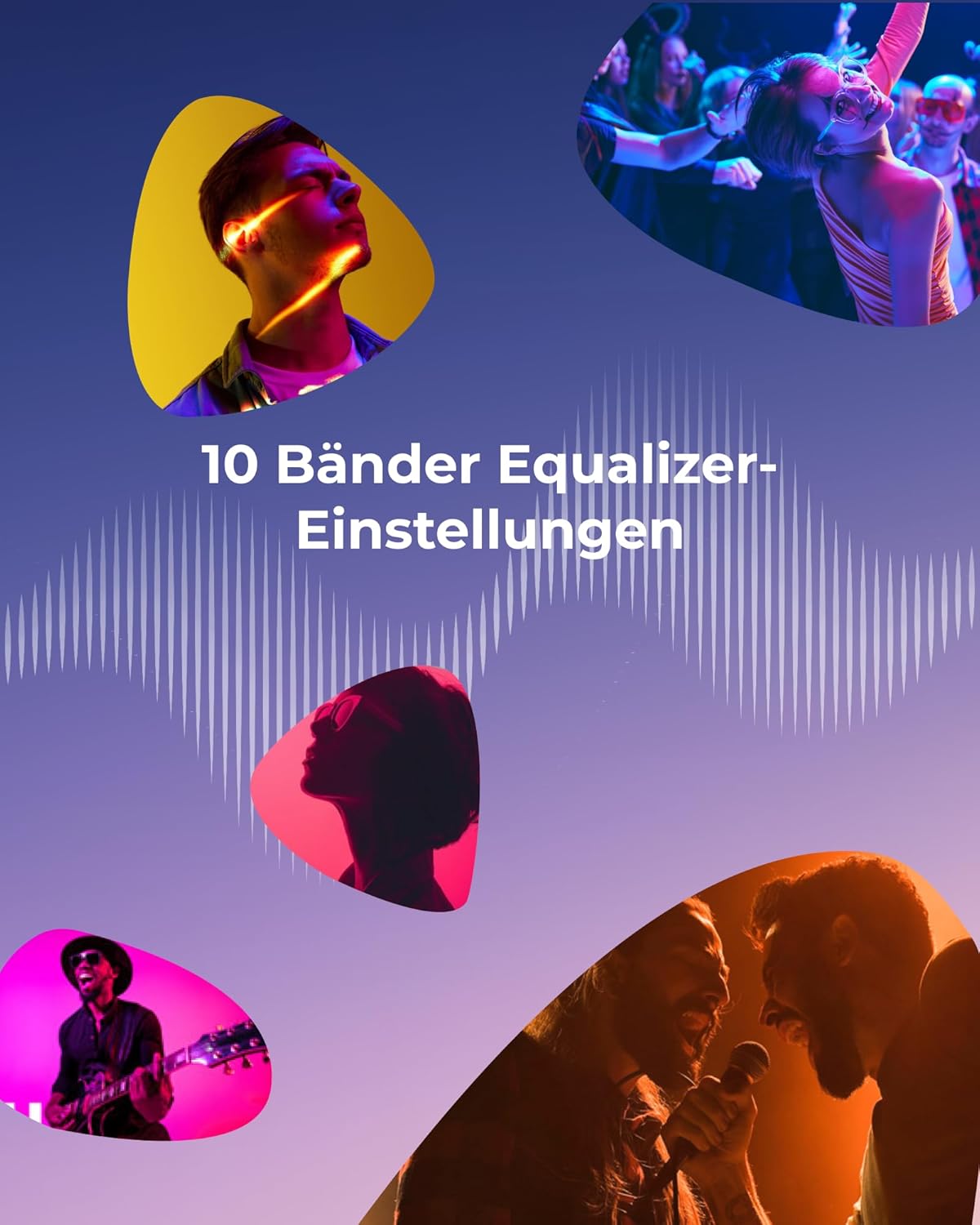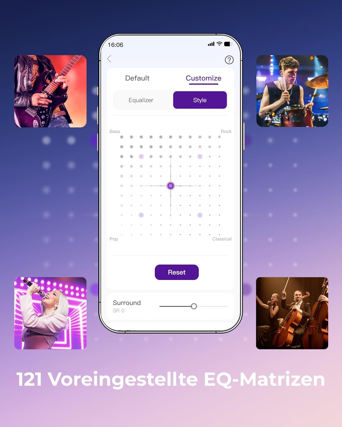 • Прецизна аудио настройка с управление чрез приложението Ultimea – персонализирайте аудио изживяването си както никога досега с приложението Ultimea. То предлага 121 експертни EQ предварително зададени настройки за жанрове като бас, поп, класическа музика и рок, както и 10-лентов и 6 персонализирани EQ режима, включително филм, музика, глас, спорт, игра и нощ. С усъвършенстваната функция „Adjust“ можете да настроите звука си точно според предпочитанията си, като гарантирате, че всяка нота е точно такава, каквато ви харесва.
