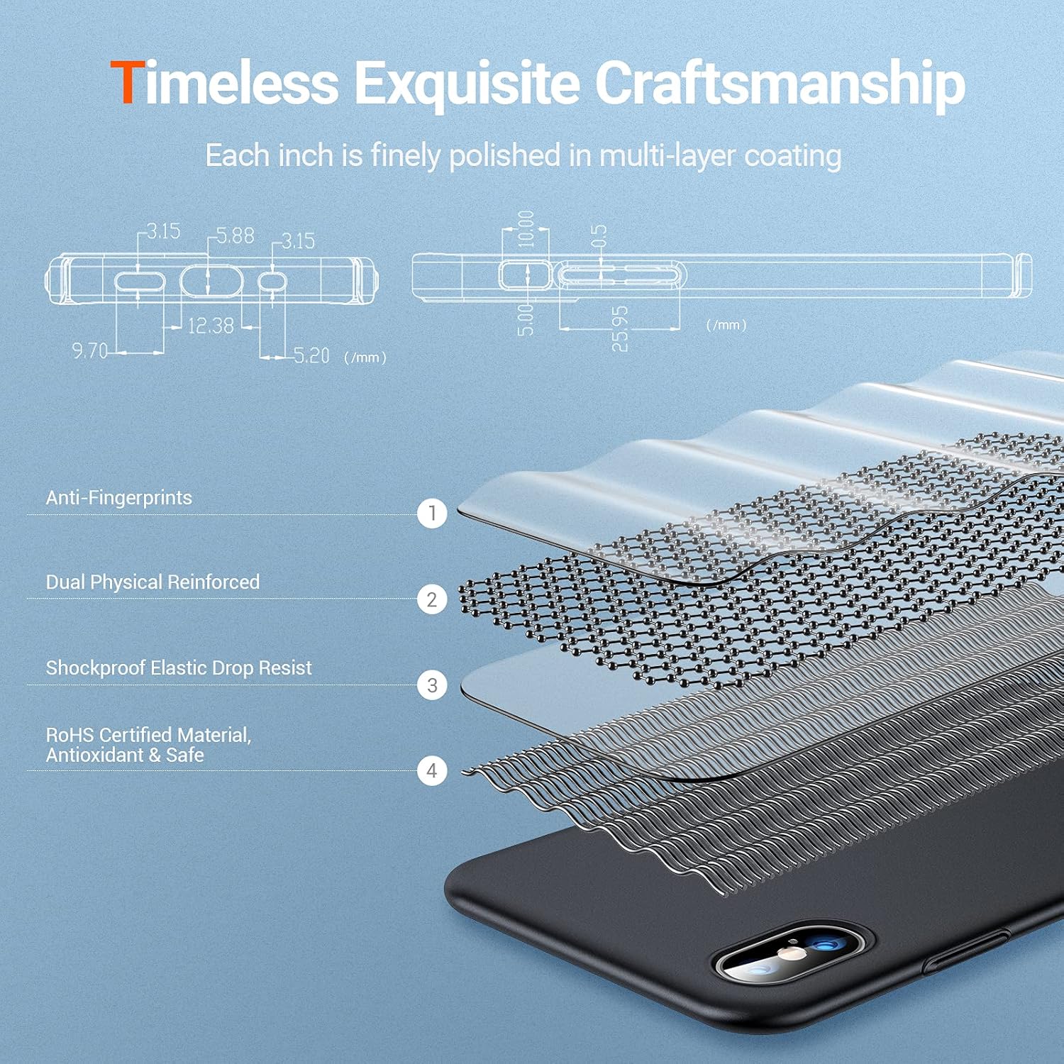 • Тънък, но предлагащ силна защита: Този калъф за iPhone 17 Pro е изработен от високоякостен материал Bayer, който е 1,5 пъти по-здрав от обикновения поликарбонат (PC). Независимо дали е в ежедневието или по време на неочаквани инциденти, този калъф надеждно защитава телефона ви. Защитата на камерата с височина 1,5 мм и защитата на ръбовете с височина 1,2 мм предпазват телефона ви от драскотини и удари.