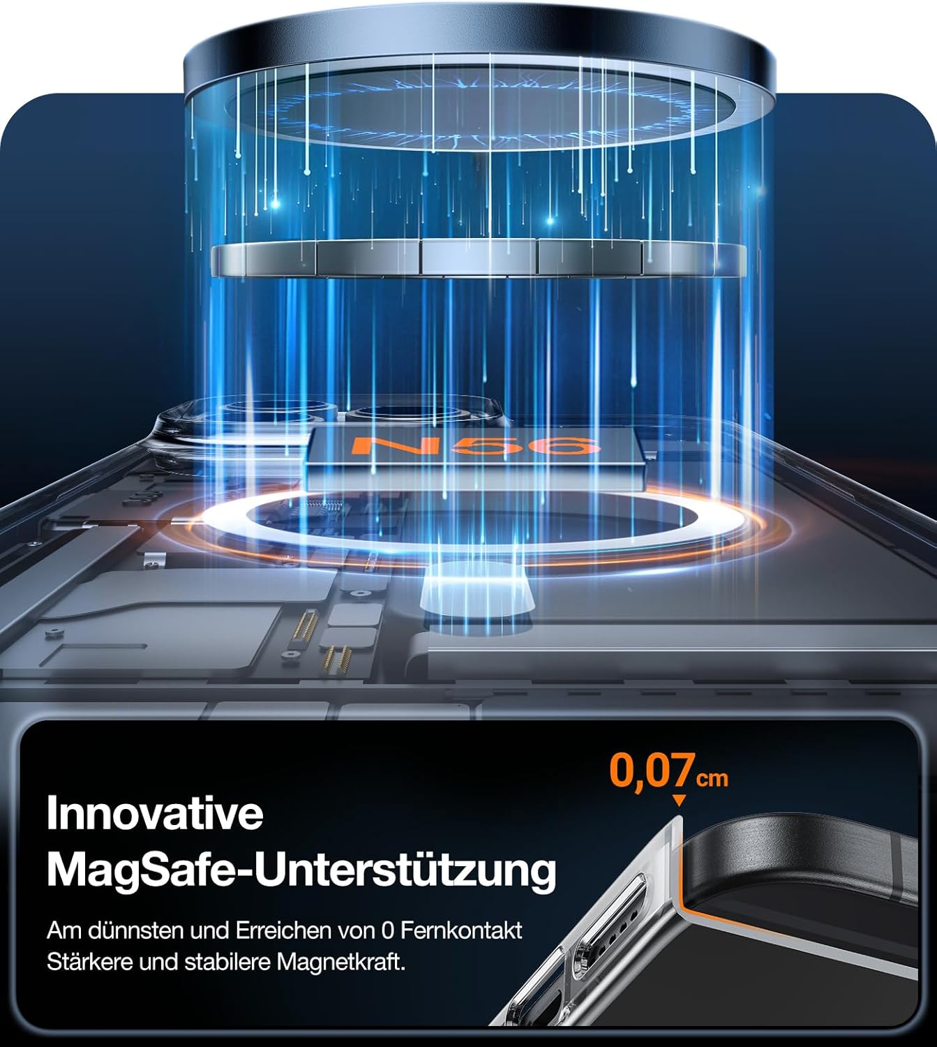 • Ултратънък и следователно с най-силна магнитна сила: TORRAS е запазил сложното лазерно гравиране, както и технологията за CNC шлифоване, и е намалил дебелината на калъфа за iPhone 17 Pro до само 0,07 см. Гърбът приляга почти безпроблемно към телефона. Благодарение на най-силните магнити N56 и технологията Halbach array, калъфът постига магнитна сила от 19 N, което е много силно и е напълно съвместимо с аксесоарите MagSafe, като същевременно е ултратънък.