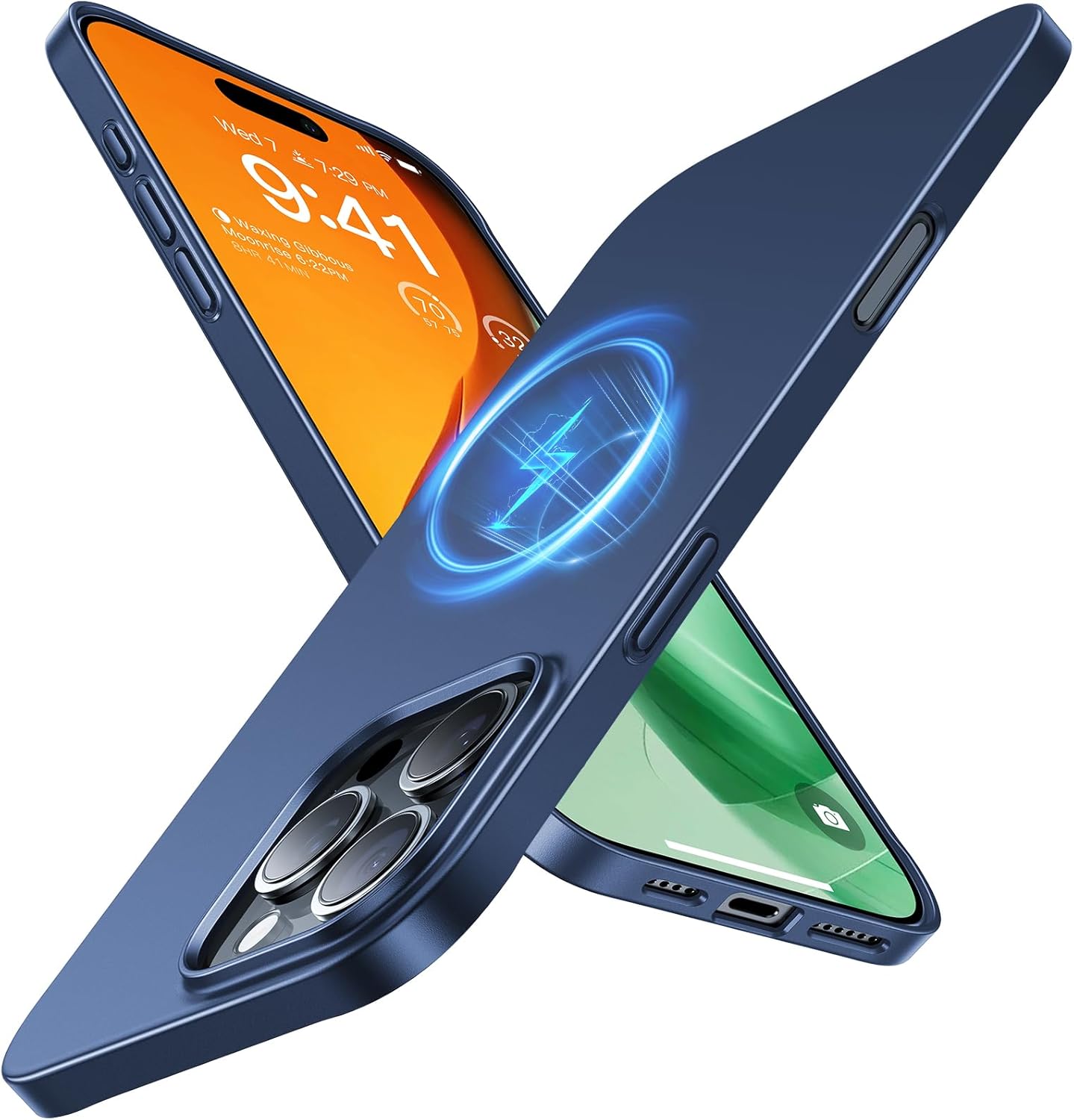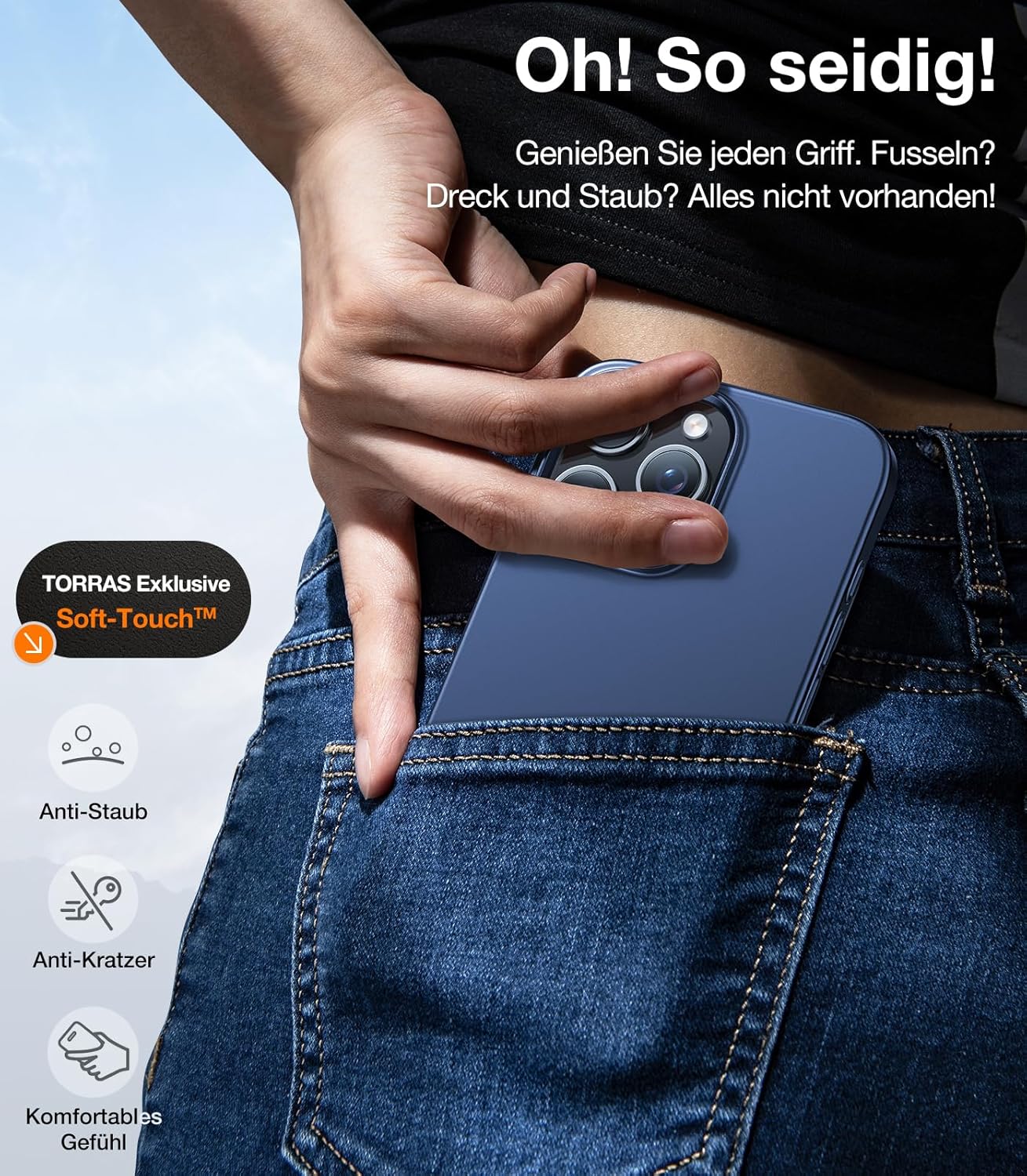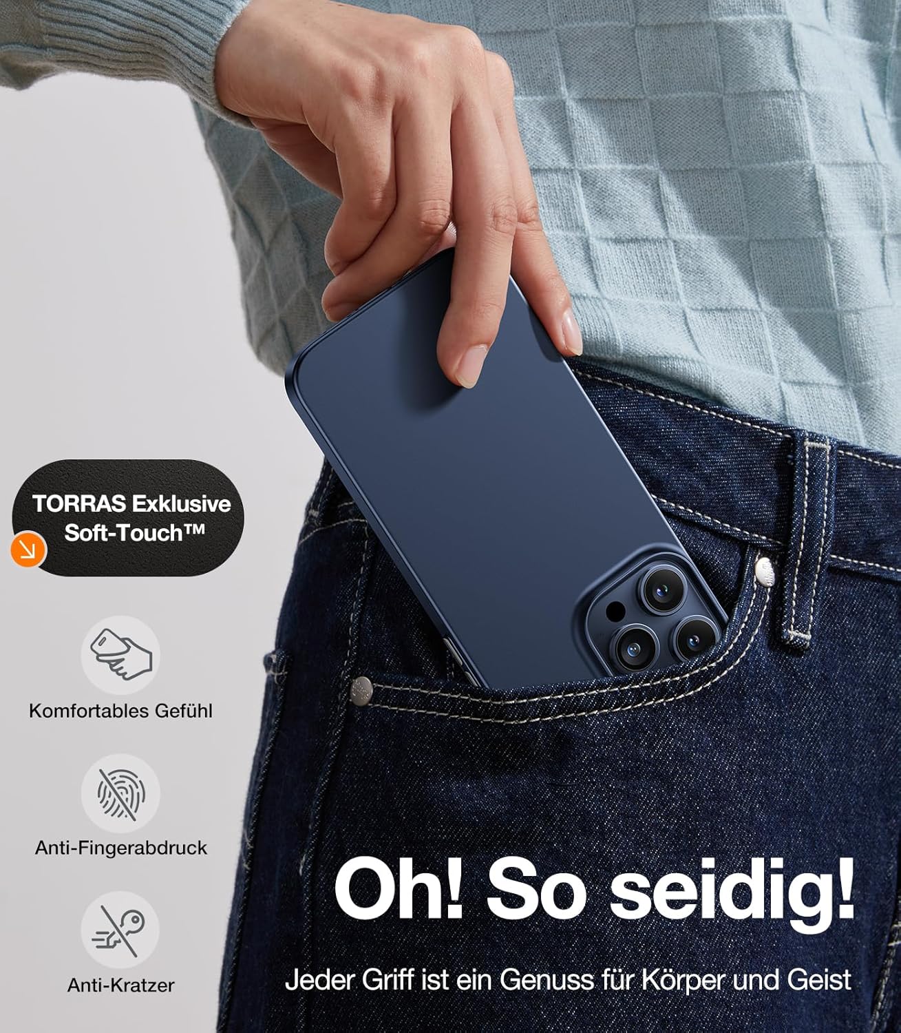 Ултратънък калъф за телефон TORRAS за iPhone 16 Pro, за MagSafe, № 1 с магнитна сила, удароустойчив, устойчив на надраскване, кадифен захват, тънък, със стойка за камера, син