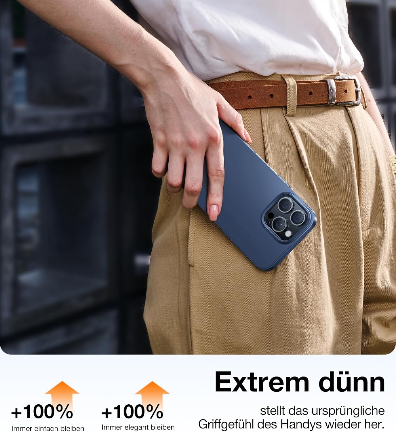 • По-тънък за по-добър захват: Този калъф за iPhone 17 Pro възпроизвежда 1:1 тънките линии на телефона. За да осигурим най-добър комфорт при захващане, избрахме леко извит дизайн, който осигурява удобно усещане в ръката със заоблени ръбове. Гърбът на калъфа е снабден с нашето иновативно меко нано покритие, което прави пръстовите отпечатъци и мазните петна лесни за изтриване и винаги осигурява изчистен и семпъл вид.