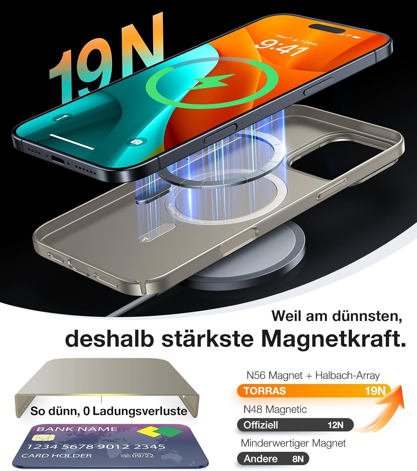 • Ултратънък и следователно с най-силна магнитна сила: TORRAS е запазил сложното лазерно гравиране, както и технологията за CNC шлифоване, и е намалил дебелината на калъфа за iPhone 17 Pro до само 0,07 см. Гърбът приляга почти безпроблемно към телефона. Благодарение на най-силните магнити N56 и технологията Halbach array, калъфът постига магнитна сила от 19 N, което е много силно и е напълно съвместимо с аксесоарите MagSafe, като същевременно е ултратънък.
