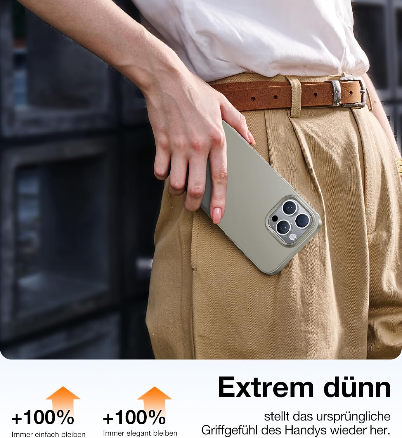 • По-тънък за по-добър захват: Този калъф за iPhone 17 Pro възпроизвежда 1:1 тънките линии на телефона. За да осигурим най-добър комфорт при захващане, избрахме леко извит дизайн, който осигурява удобно усещане в ръката със заоблени ръбове. Гърбът на калъфа е снабден с нашето иновативно меко нано покритие, което прави пръстовите отпечатъци и мазните петна лесни за изтриване и винаги осигурява изчистен и семпъл вид.