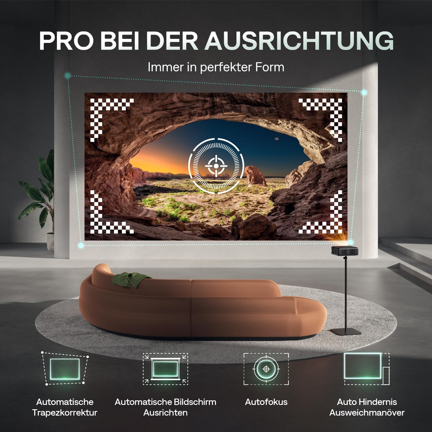 • 【Автоматично фокусиране и корекция на трапецовидно изкривяване】С подобрените функции за автоматично фокусиране с изкуствен интелект в реално време и корекция на трапецовидно изкривяване, той ви освобождава от необходимостта от ръчни настройки и осигурява перфектно ясно и подравнено изображение за секунди, независимо къде е поставен преносимият проектор. Освен това, той има уникални функции за автоматично избягване на препятствия и автоматично подравняване на екрана, за да гарантира, че изображението пасва перфектно на платното. Когато бъде открита пречка, проекторът автоматично настройва изображението, за да осигури оптимално зрително изживяване.