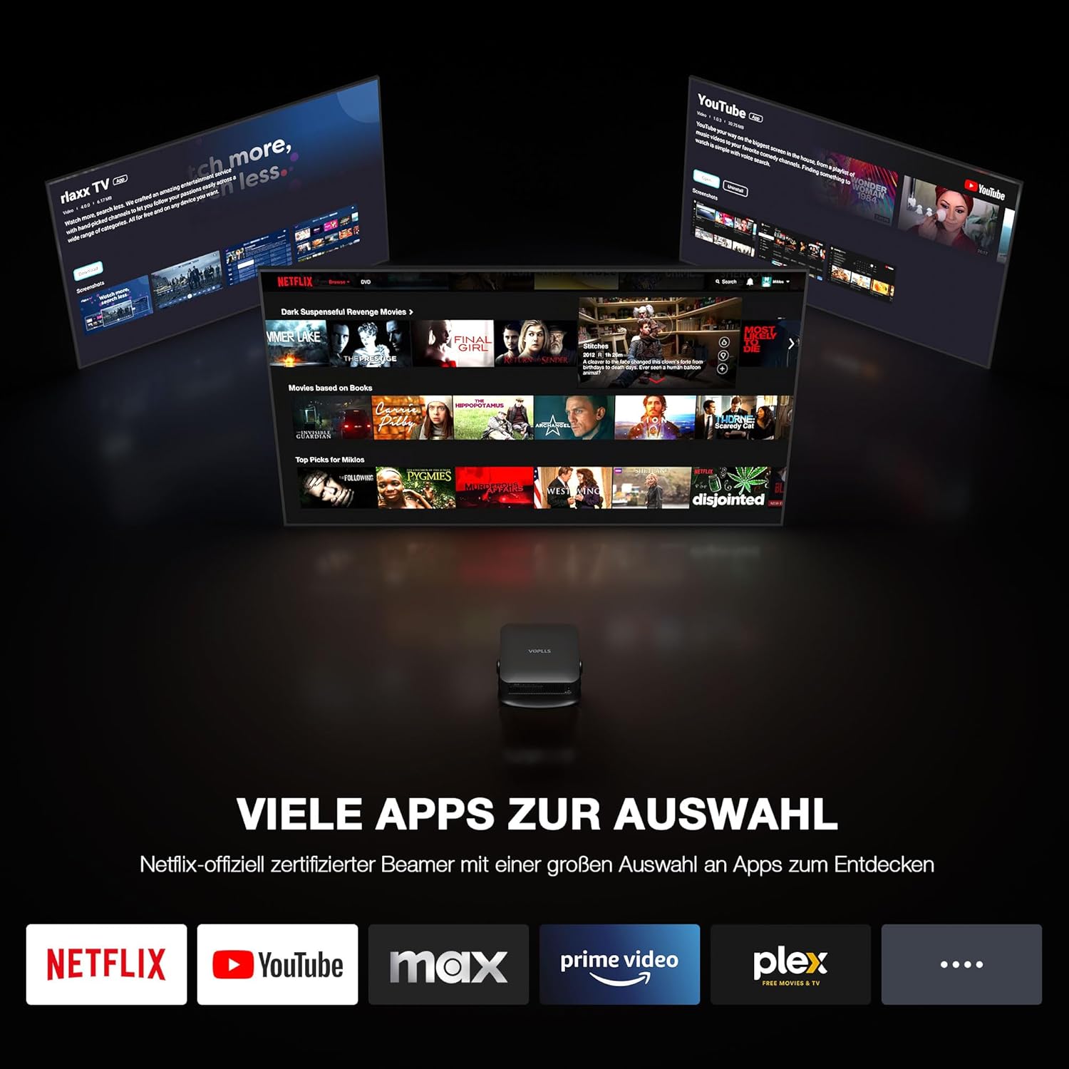 • Официално лицензиран Netflix и интегрирани стрийминг приложения: Превърнете хола си в кино рай с официално лицензирания мини проектор VOPLLS ​​​​Q5 Netflix. Предварително конфигуриран с Netflix и поддържа изтегляне на допълнителни приложения като YouTube, Prime Video + и други чрез функцията „Приложения“. Този 4K Netflix проектор осигурява незабавен достъп до обширна библиотека от FHD/4K филми и телевизионни предавания - без да са необходими допълнителни устройства.