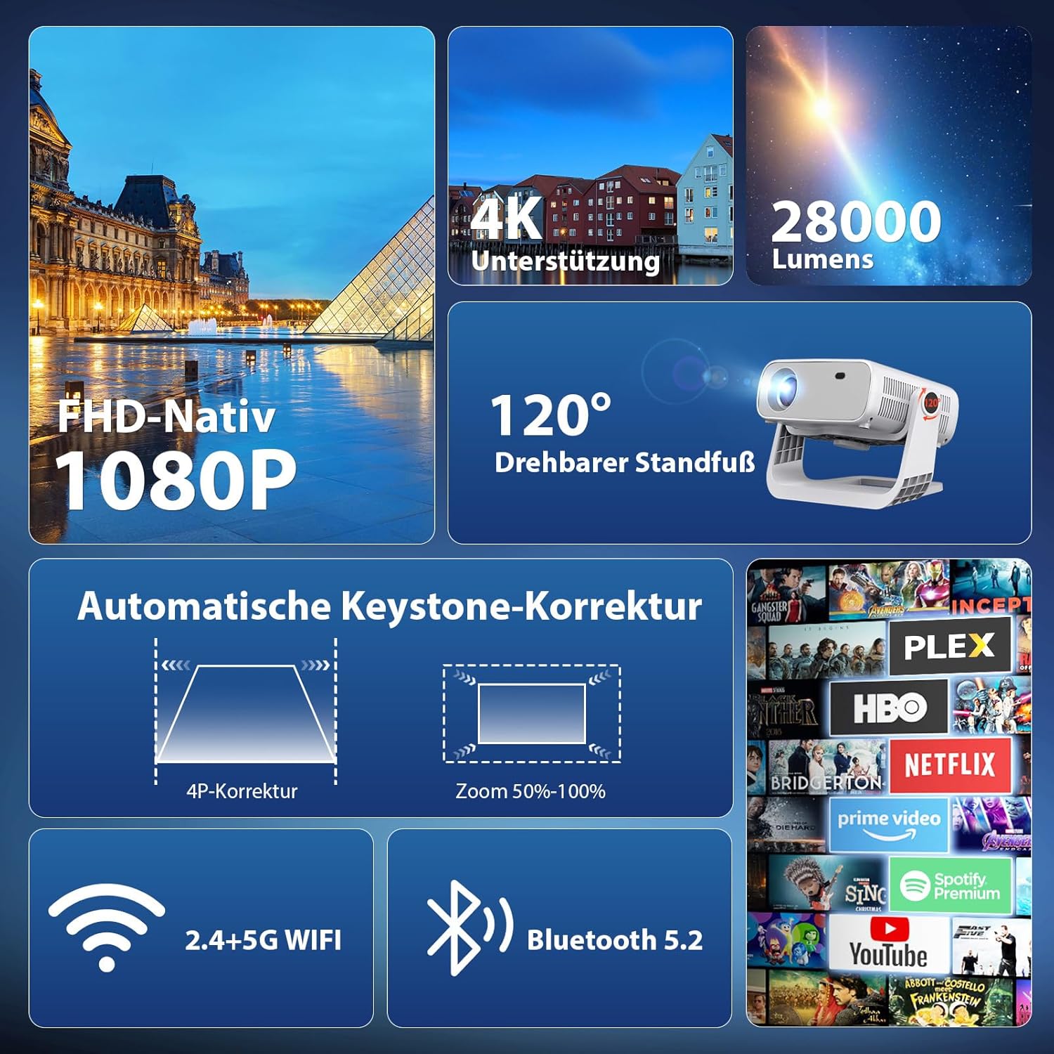 • Поддръжка на оригинална 1080P и 4K резолюция - впечатляващо качество на изображението: този проектор с оригинална резолюция 1920 x 1080 и HDR10+ декодиране показва 4K съдържание с всички детайли. Професионално калибрирана технология с 6-сегментно цветно колело за реалистично възпроизвеждане на цветовете, всяко изображение изглежда реалистично.