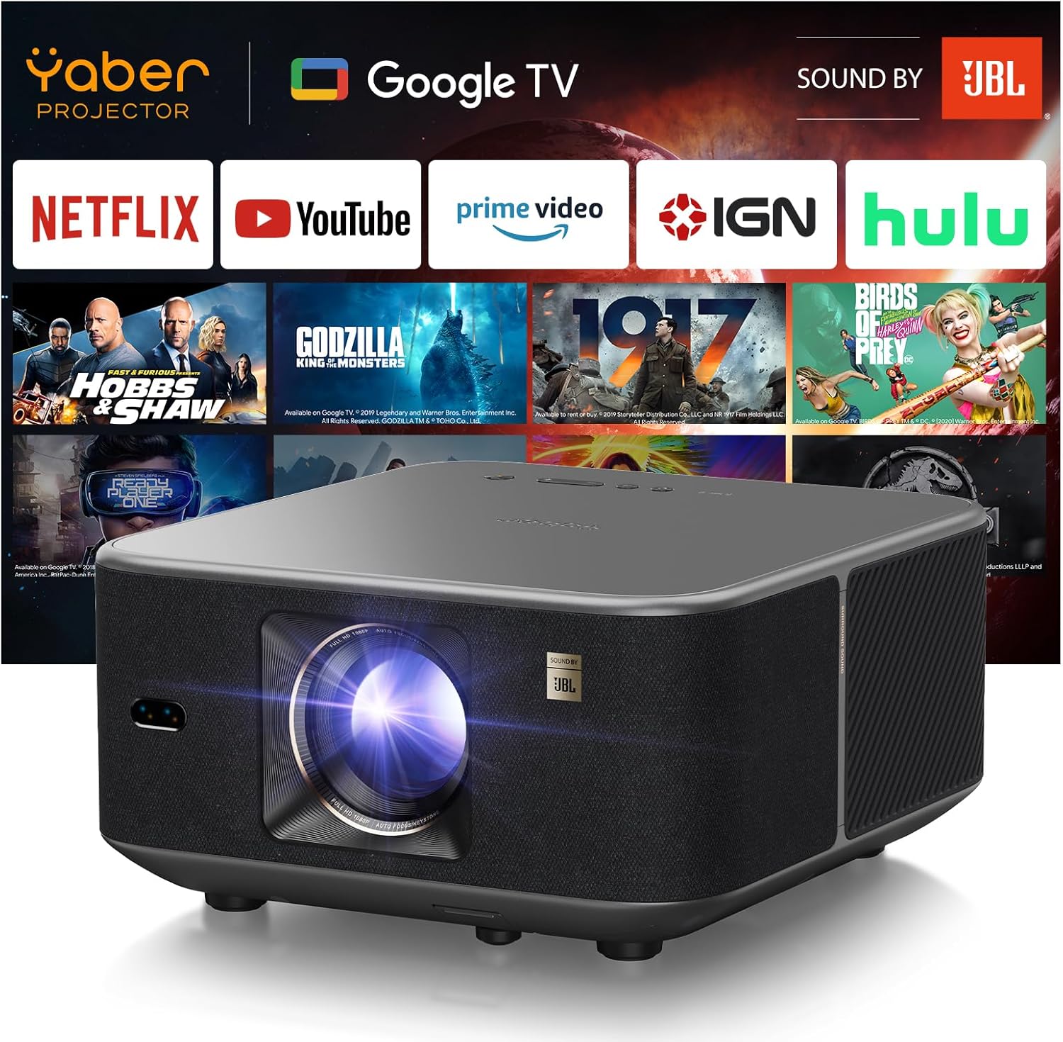 Умен проектор Yaber K3 с Google TV и звук от JBL: Проектор за дневна светлина с WiFi 6 и Bluetooth, проектор за мобилен телефон за 4K домашно кино и открито, Dolby Audio/настройка на картината в колата, Netflix и 7000+