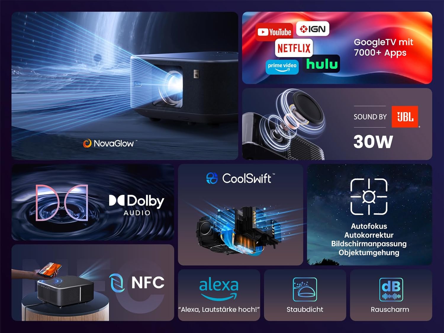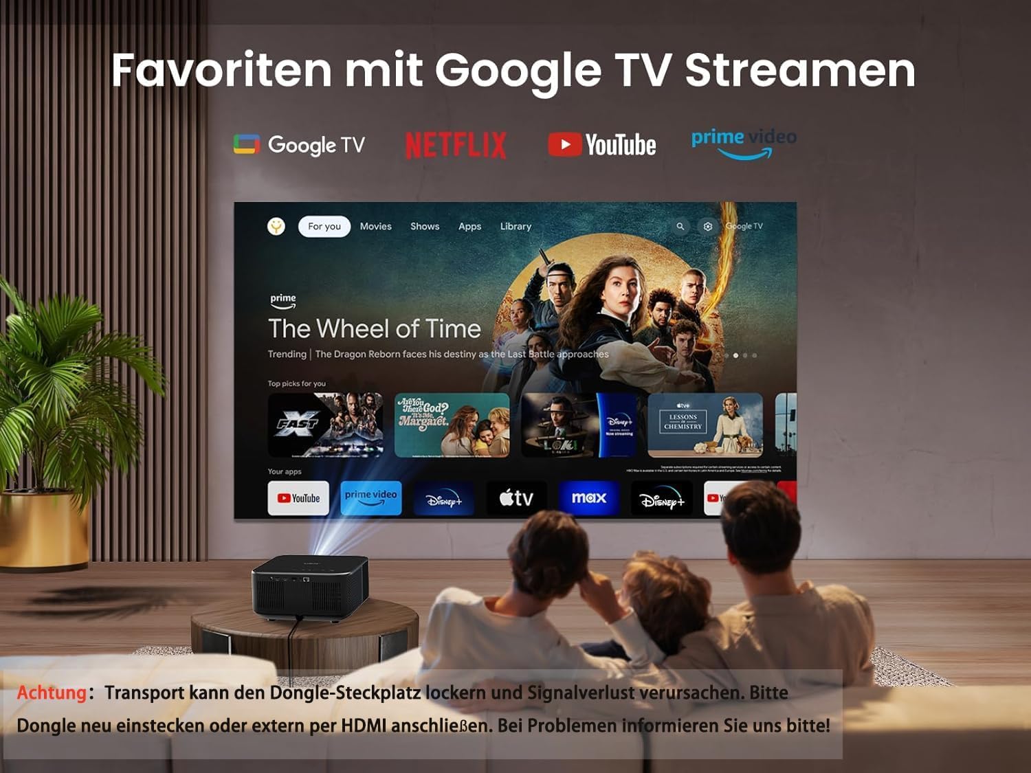 • Google TV с над 7000 приложения - вашето забавление „всичко в едно“: Стриймвайте, гледайте, наслаждавайте се: интелигентният проектор Yaber K3 пренася Google TV директно в хола. Над 7000 приложения, като Netflix, +, Prime Video и YouTube, са незабавно достъпни. Независимо дали става въпрос за блокбъстъри, спортни събития, детски сериали или презентации: само с едно щракване всяка стая се превръща в кино или място за срещи. Просто. Почти. Универсално.
