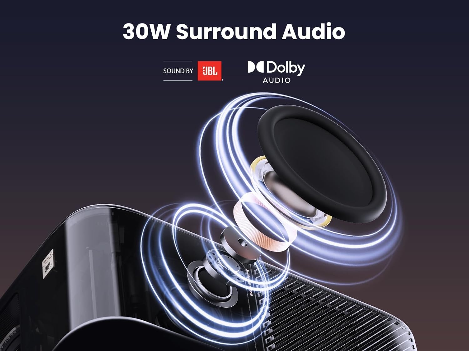 • 30 W JBL звук с Dolby аудио: проекторът за домашно кино Yaber K3 има два 15 W JBL високоговорителя и Dolby аудио поддръжка за ясен, изпълващ стаята звук. Специални NdFeB драйвери и пасивен радиатор осигуряват мощен бас без изкривяване. Вграденият аудио DSP автоматично оптимизира всички честоти - от ясен диалог до дълбок бас. Идеален за филми, сериали и игри с кинематографично звуково изживяване. Перфектен като интелигентен проектор за взискателно качество на звука в домашното кино.