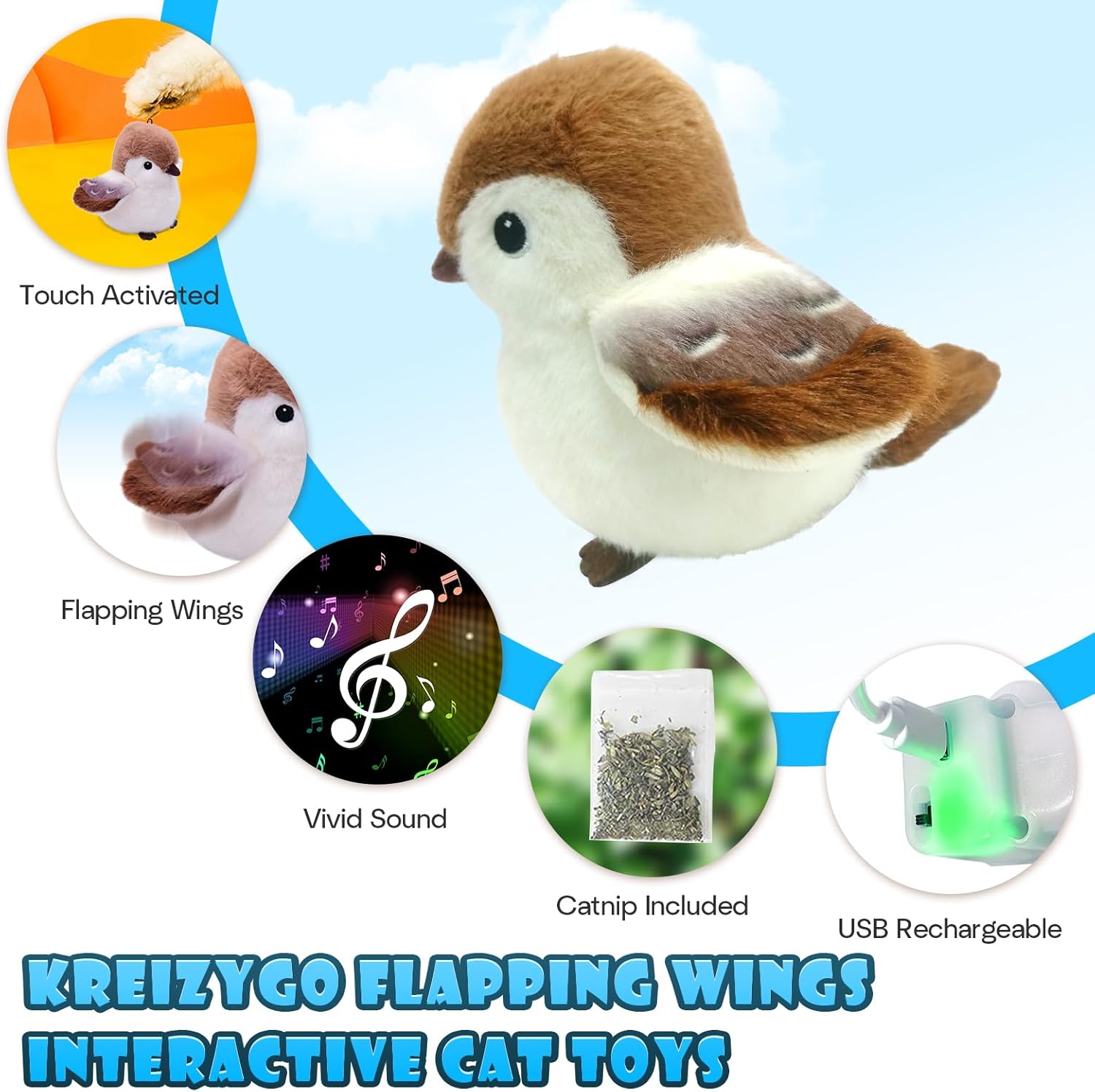 • Интерактивна играчка за котки: щом вашият пухкав нослещ домашен любимец докосне играчката, вграденият сензор за движение се активира. Врабчето започва да пърха с криле и да чурулика реалистично - така забавлението за вашата котка се поддържа постоянно.