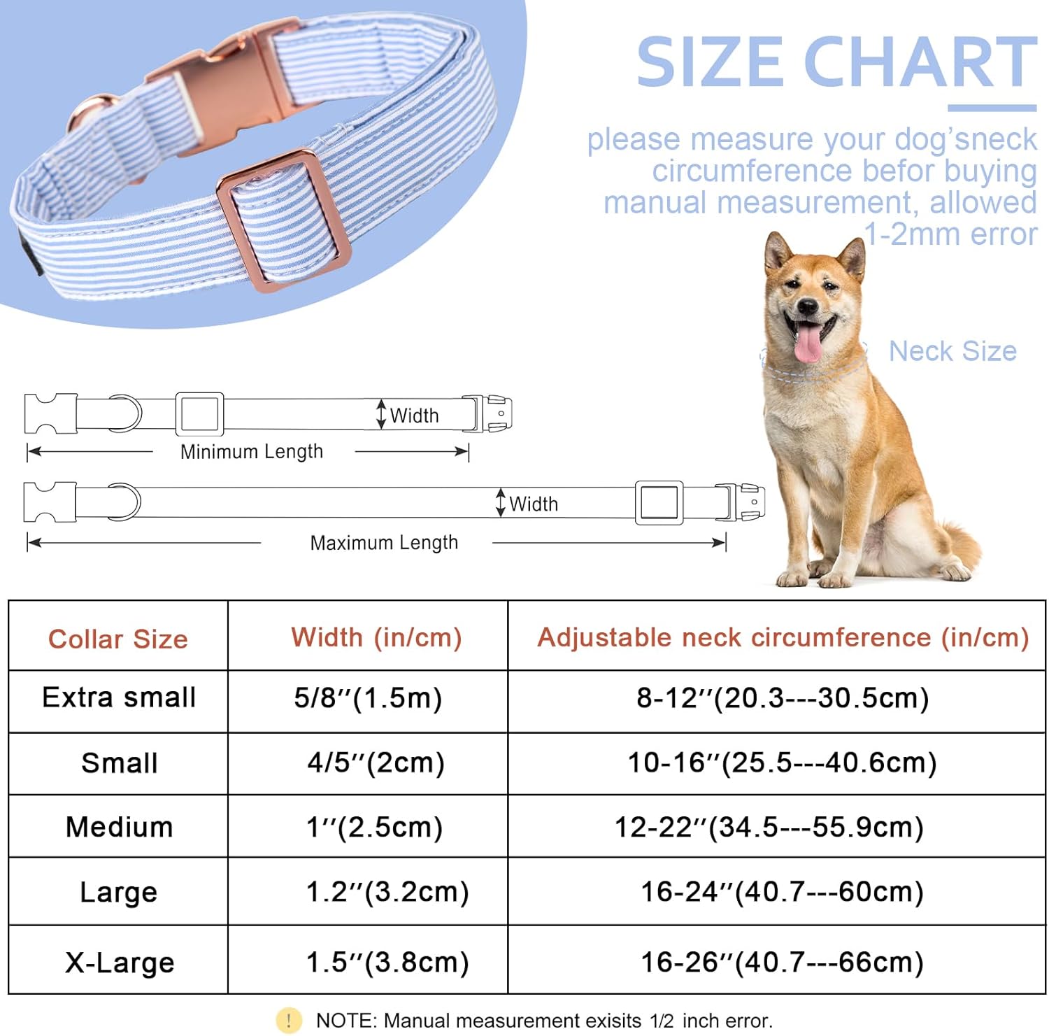 Горните насоки са само общи препоръки за размер. Всяко куче е различно по размер и тегло. Преди покупка, измерете обиколката на врата на кучето си, докато то седи. Моля, уверете се, че ролетката не е нито твърде стегната, нито твърде хлабава и се държи на мястото, където обикновено се намира нашийникът на кучето ви.