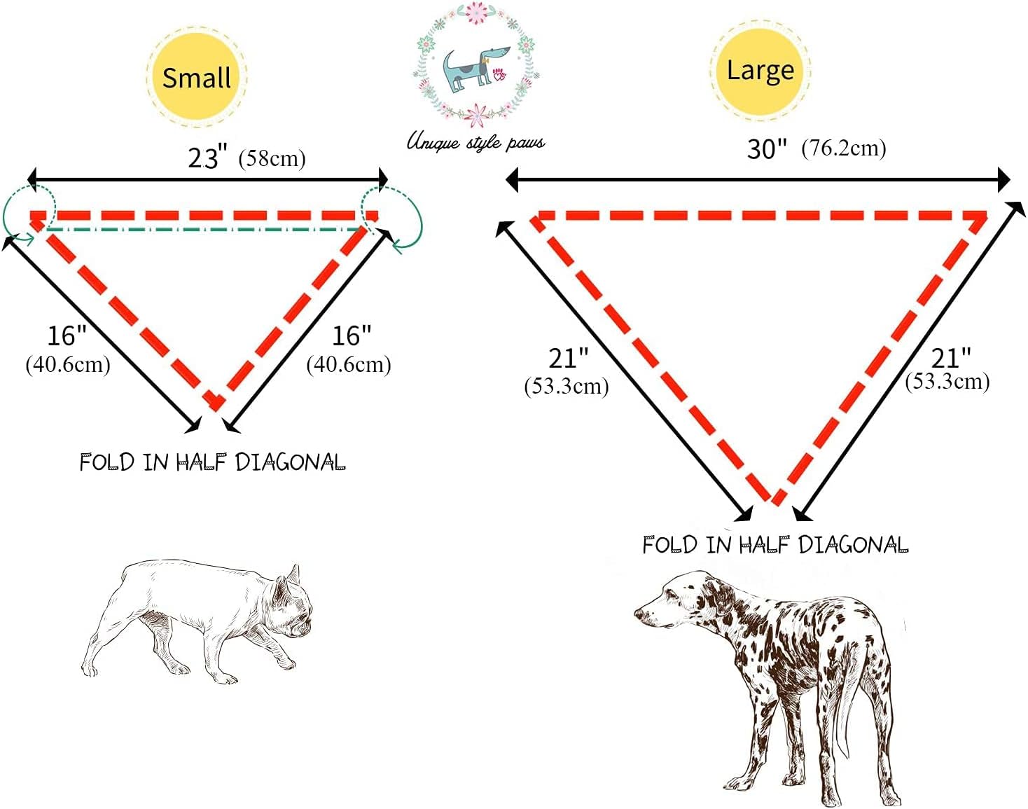 • Триъгълни размери: малък = 58 см x 40,6 см x 40,6 см, голям = 76,2 см x 53,3 см x 53,3 см. Моля, измерете врата на вашия домашен любимец и предвидете място за връзване (малките размери са подходящи за обиколка на врата 40 см, големите размери са подходящи за обиколка на врата 58 см).