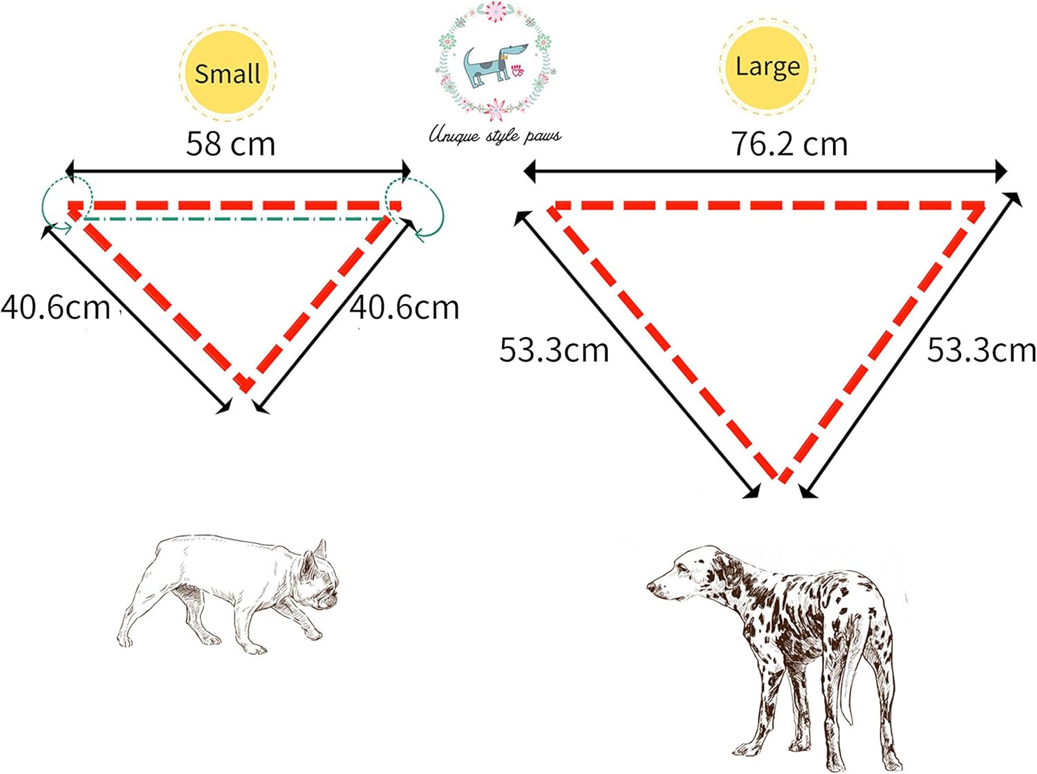 • Триъгълни размери: малък = 58 см x 40,6 см x 40,6 см, голям = 76,2 см x 53,3 см x 53,3 см. Моля, измерете врата на вашия домашен любимец и предвидете място за връзване (малките размери са подходящи за обиколка на врата 40 см, големите размери са подходящи за обиколка на врата 58 см).