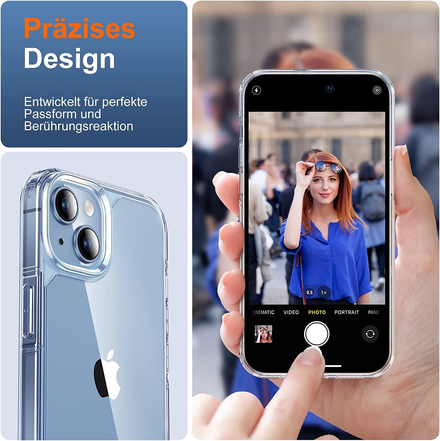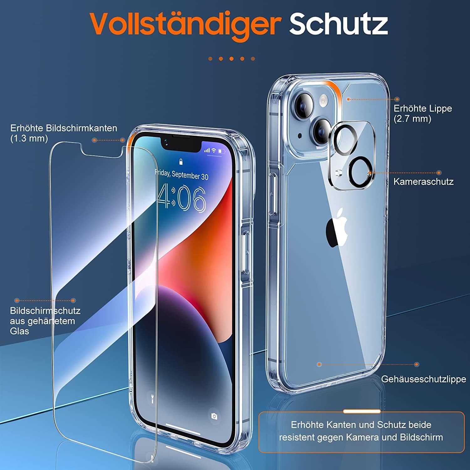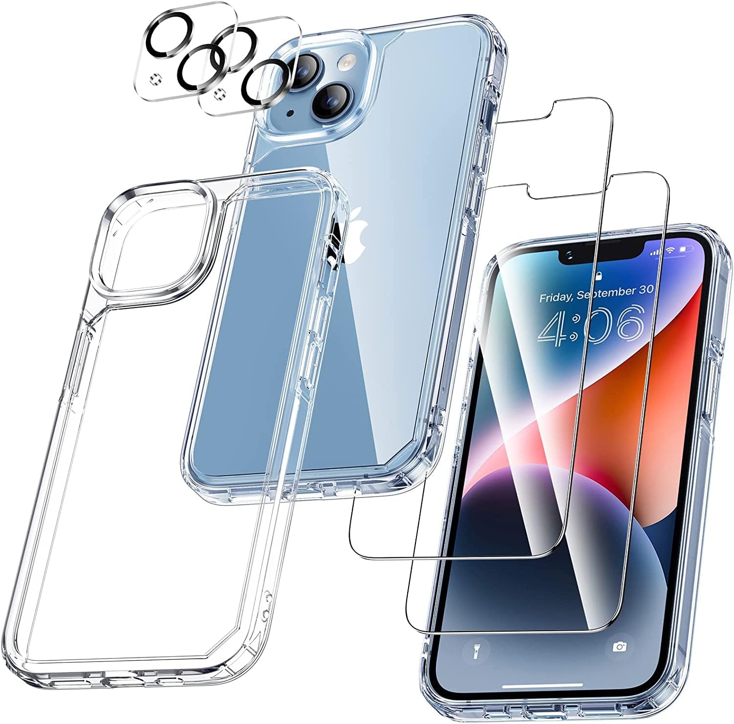 UniqueMe калъф за iPhone 14 Plus, комплект 5 в 1, калъф за мобилен телефон за iPhone 14 Plus, защитен калъф от всички страни, 1 калъф за мобилен телефон и 2 протектора за екран и 2 протектора за камера, прозрачен