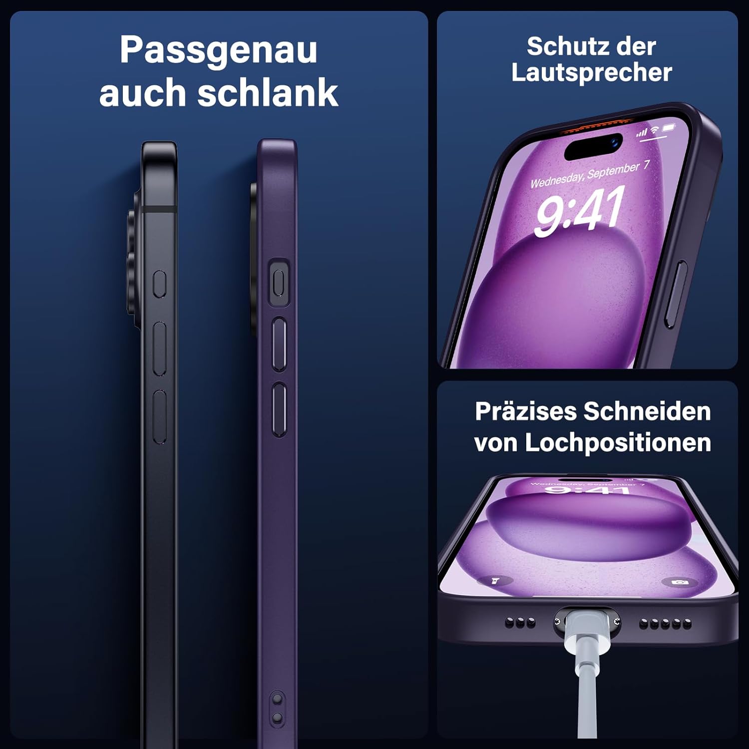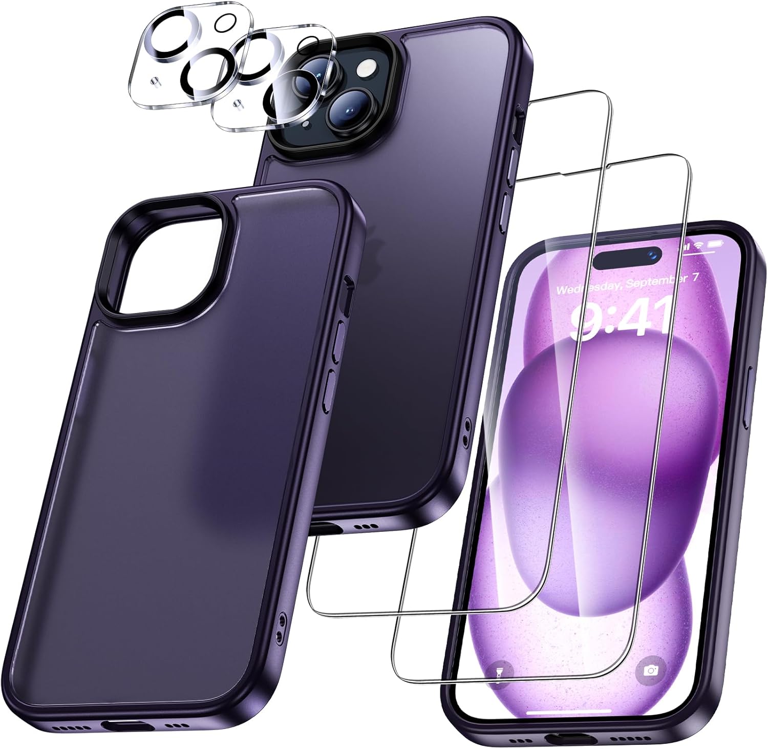 UniqueMe калъф за iPhone 15, комплект 5 в 1, калъф за мобилен телефон за iPhone 15, защитен калъф от всички страни, 1 калъф за мобилен телефон и 2 протектора за екран и 2 протектора за камера, матово лилав