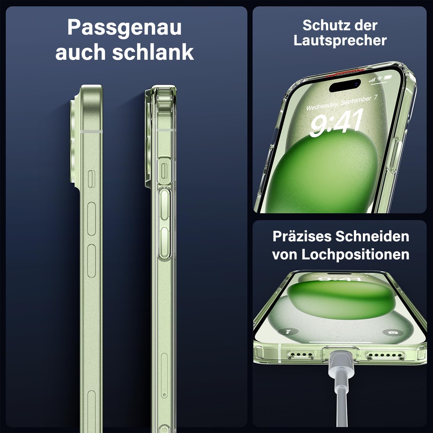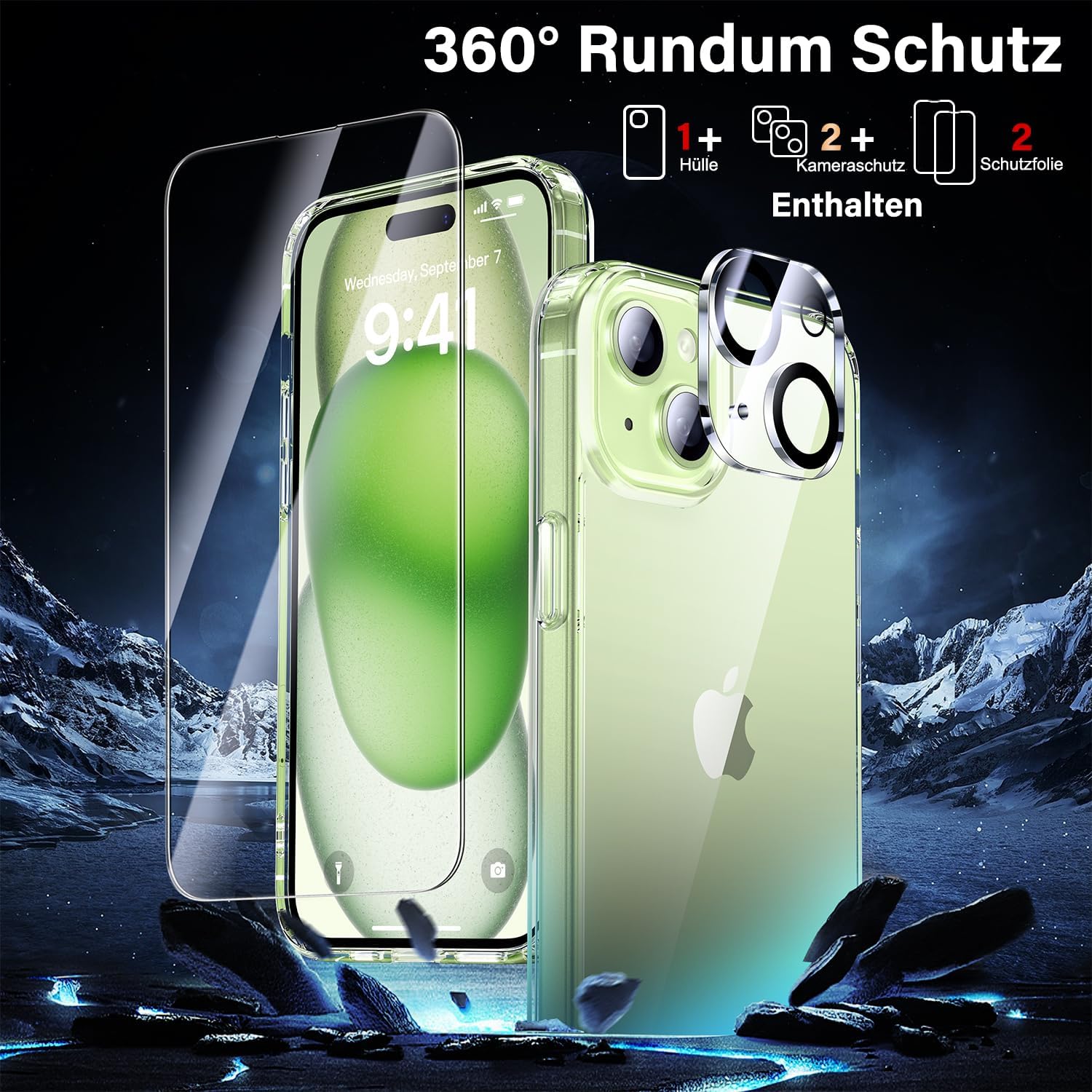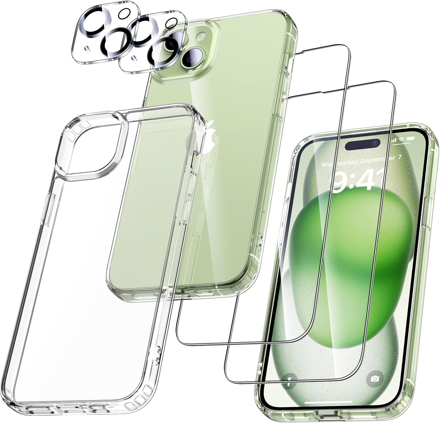 UniqueMe калъф за iPhone 15, комплект 5 в 1, калъф за мобилен телефон за iPhone 15, защитен калъф от всички страни, 1 калъф за мобилен телефон и 2 протектора за екран и 2 протектора за камера, прозрачен