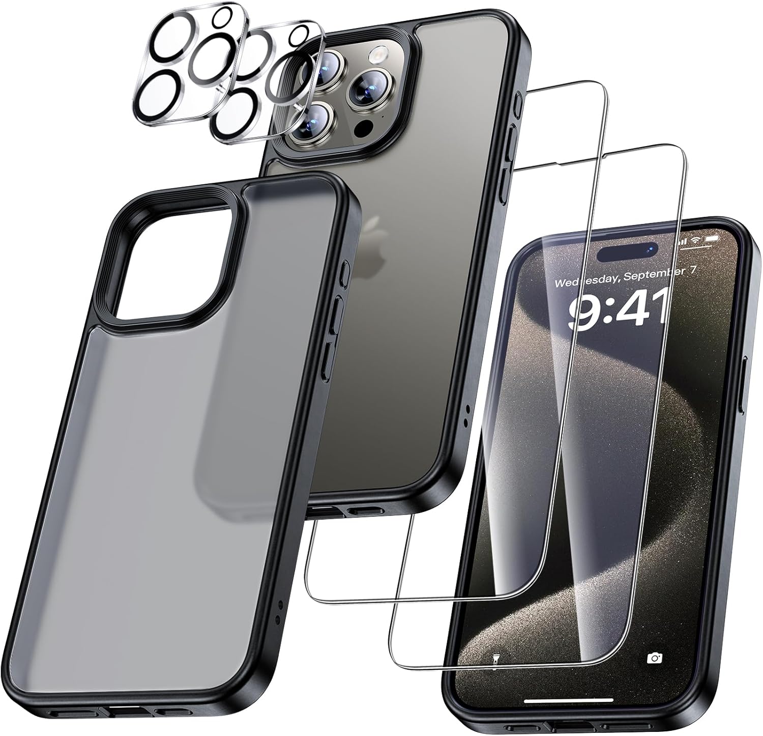 UniqueMe калъф за iPhone 15 Pro, комплект 5 в 1, калъф за мобилен телефон за iPhone 15 Pro, защитен калъф от всички страни, 1 калъф за мобилен телефон, 2 протектора за екран и 2 протектора за камера, черен