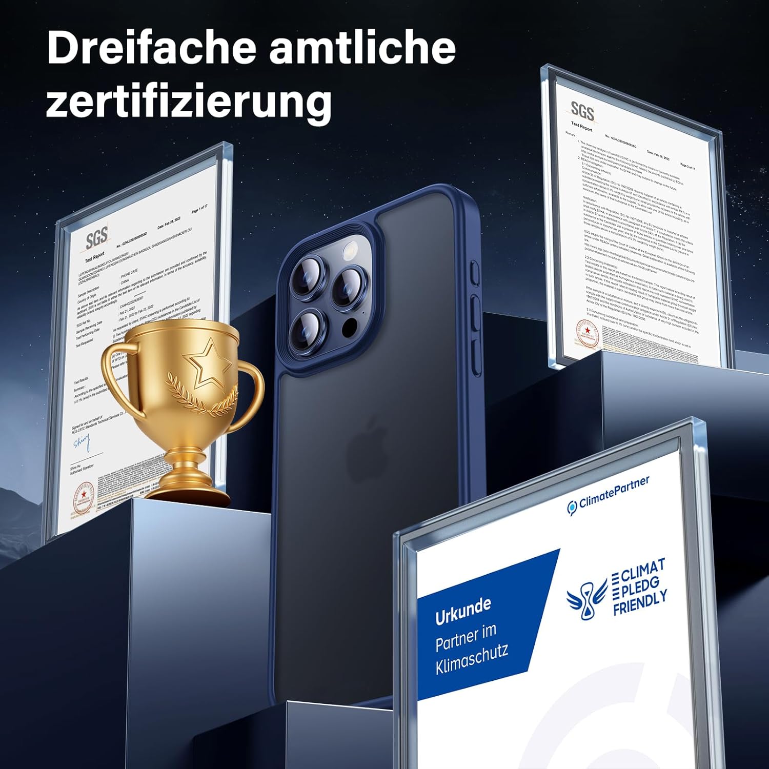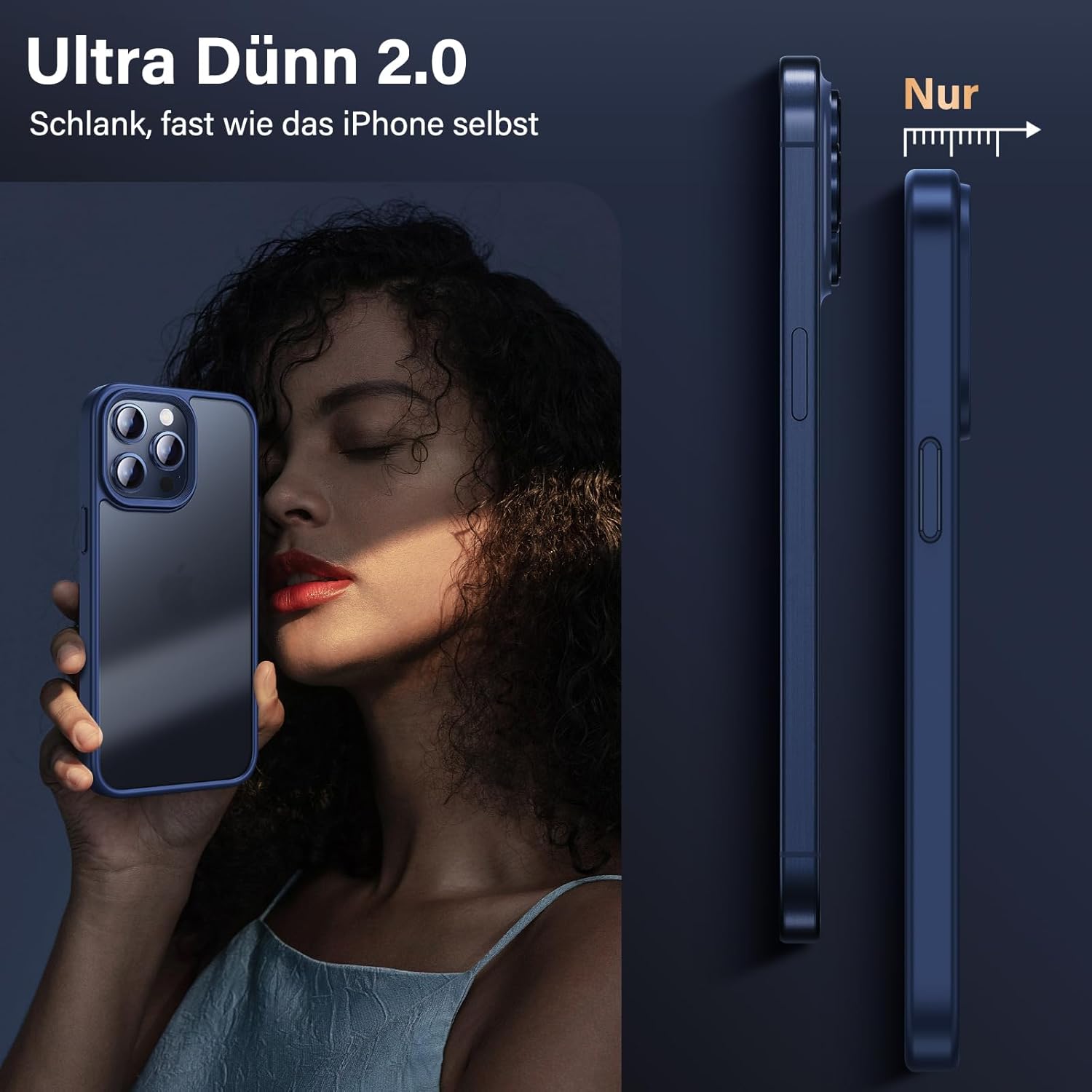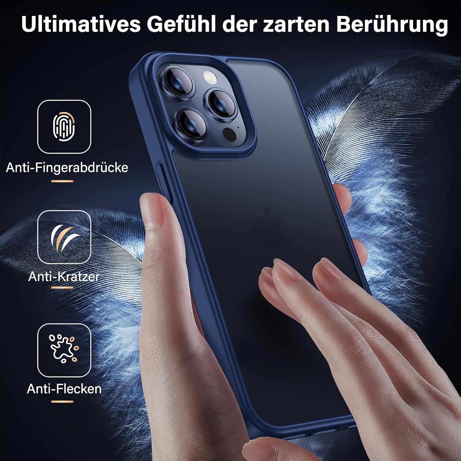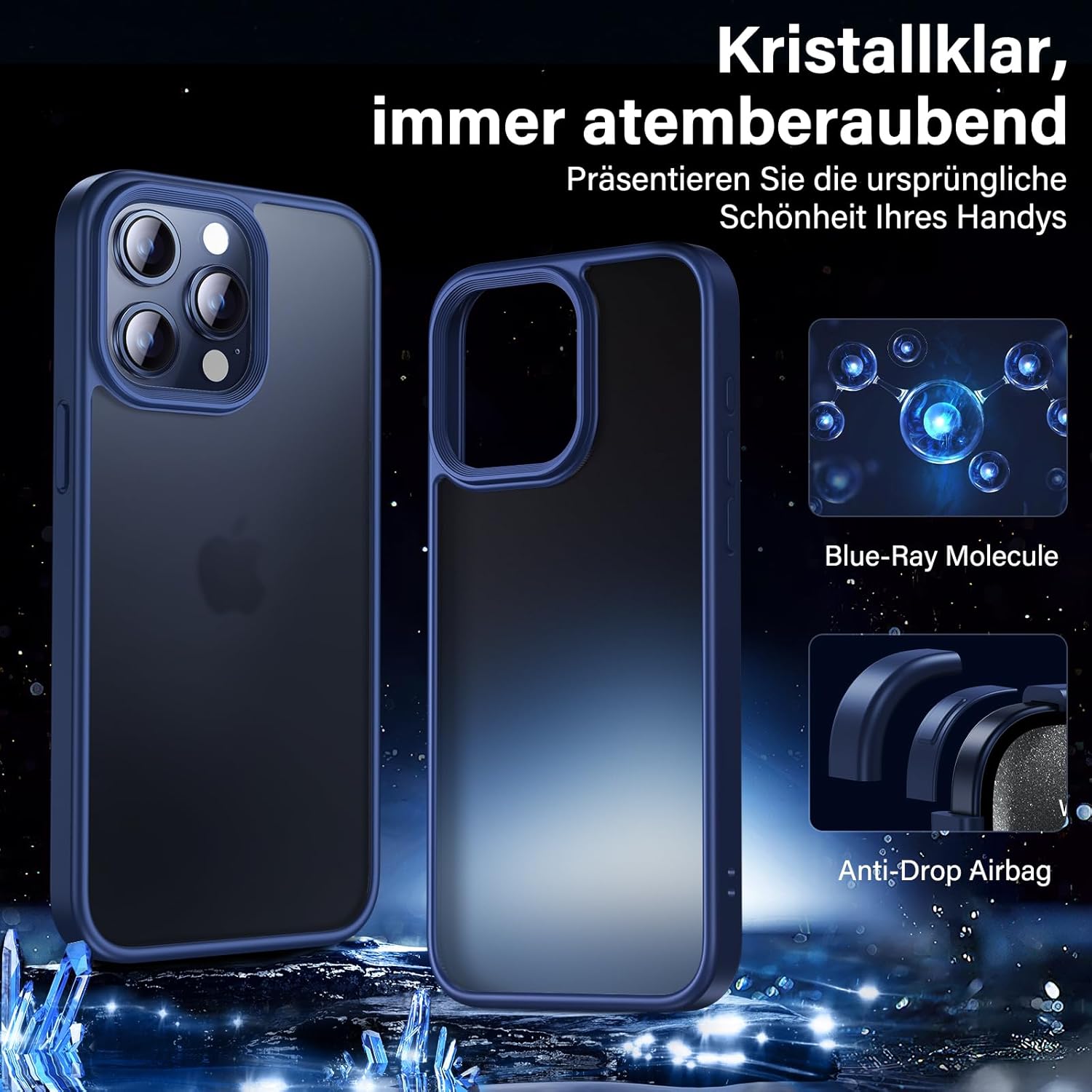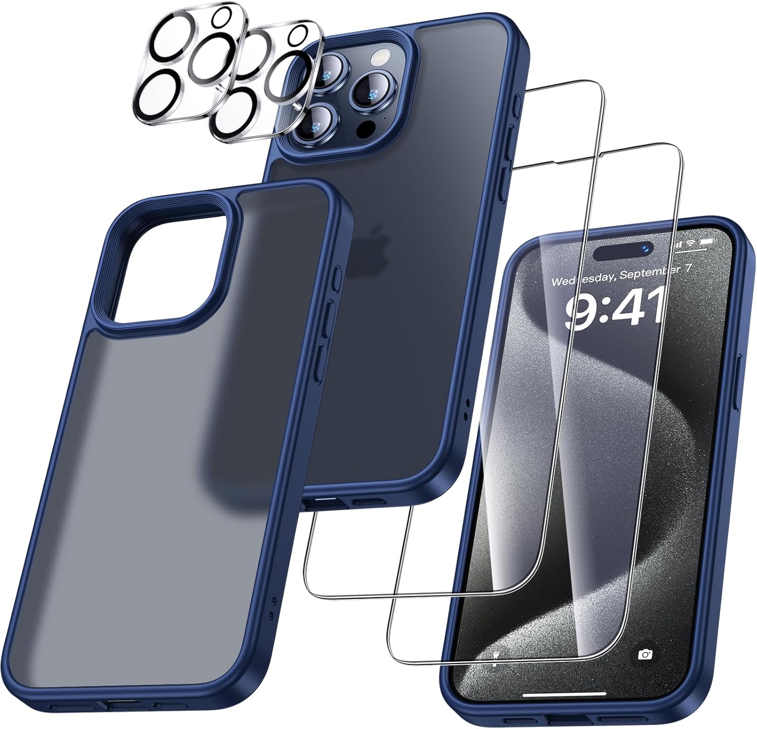 UniqueMe калъф за iPhone 15 Pro, комплект 5 в 1, калъф за мобилен телефон за iPhone 15 Pro, защитен калъф от всички страни, 1 калъф за мобилен телефон и 2 протектора за екран и 2 протектора за камера, син