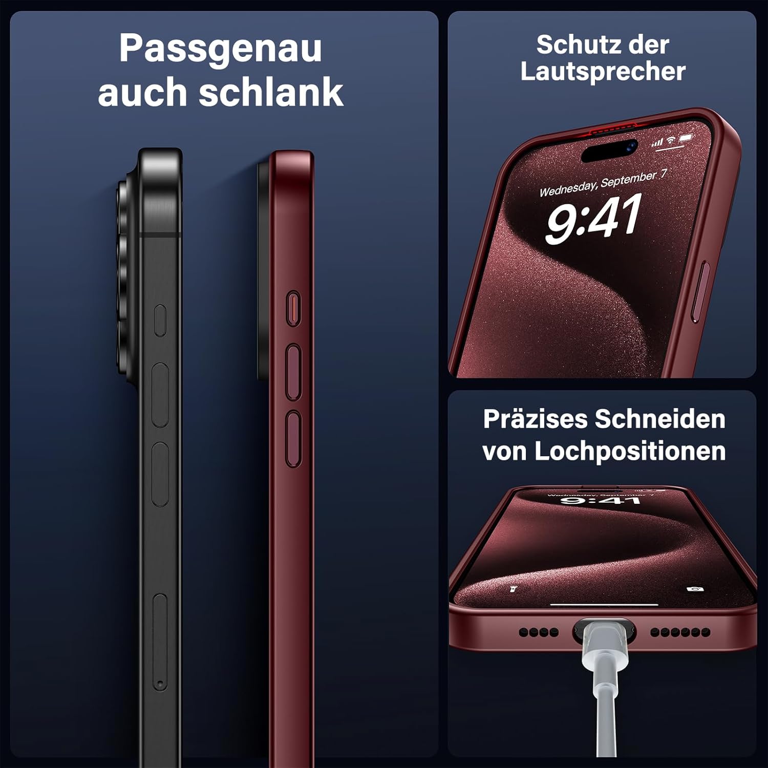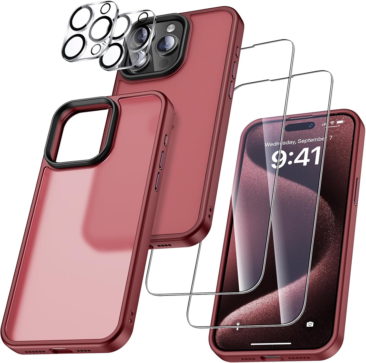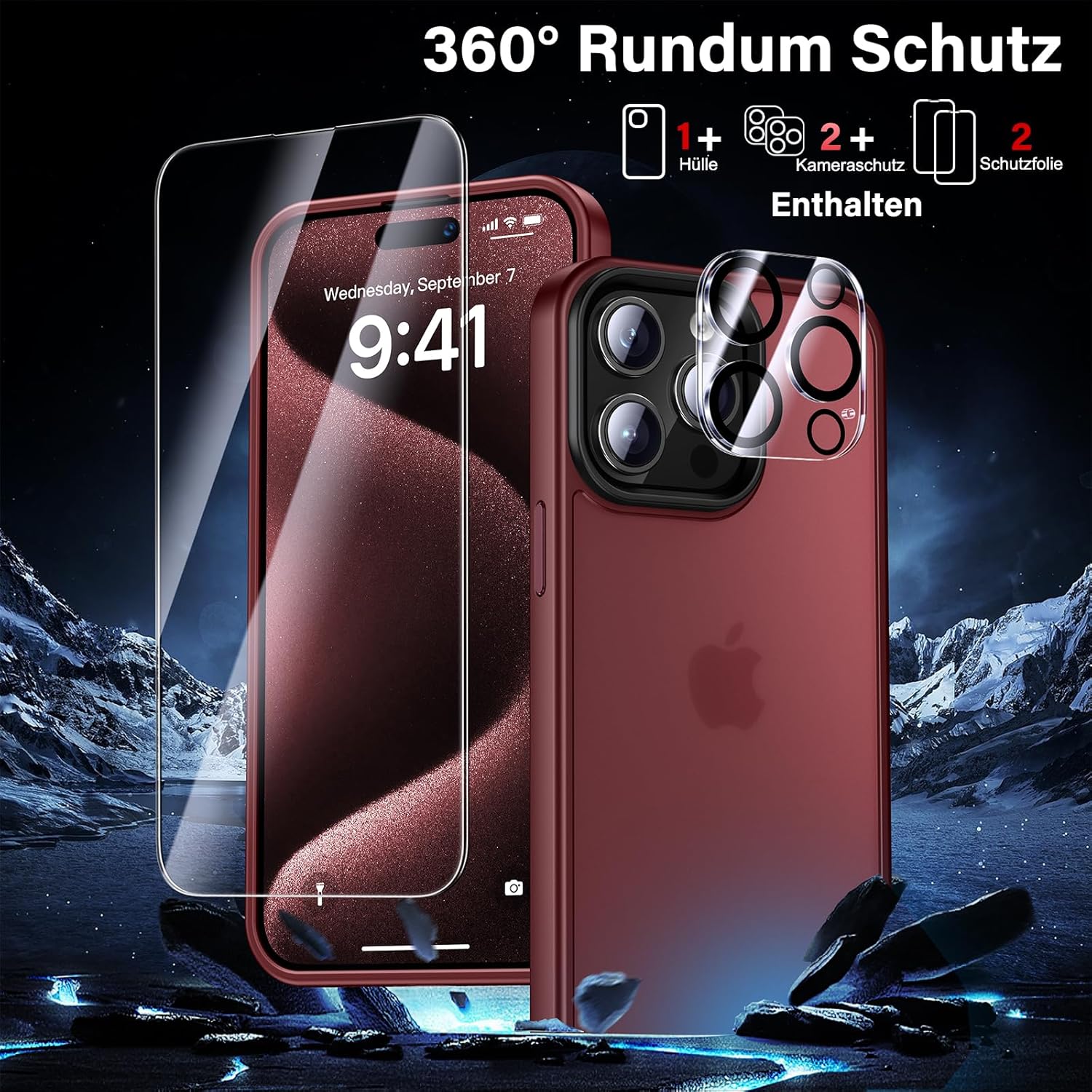 UniqueMe калъф за iPhone 15 Pro Max, комплект 5 в 1, калъф за мобилен телефон за iPhone 15 Pro Max, защитен калъф от всички страни, 1 калъф за мобилен телефон и 2 протектора за екран и 2 протектора за камера, матово червен