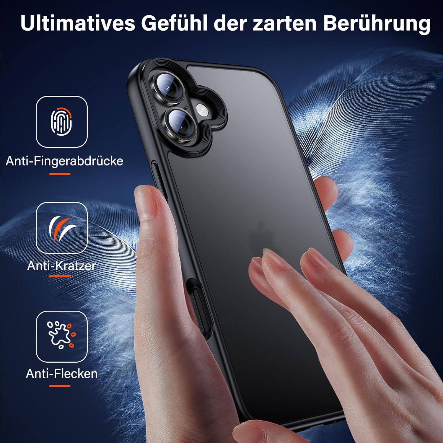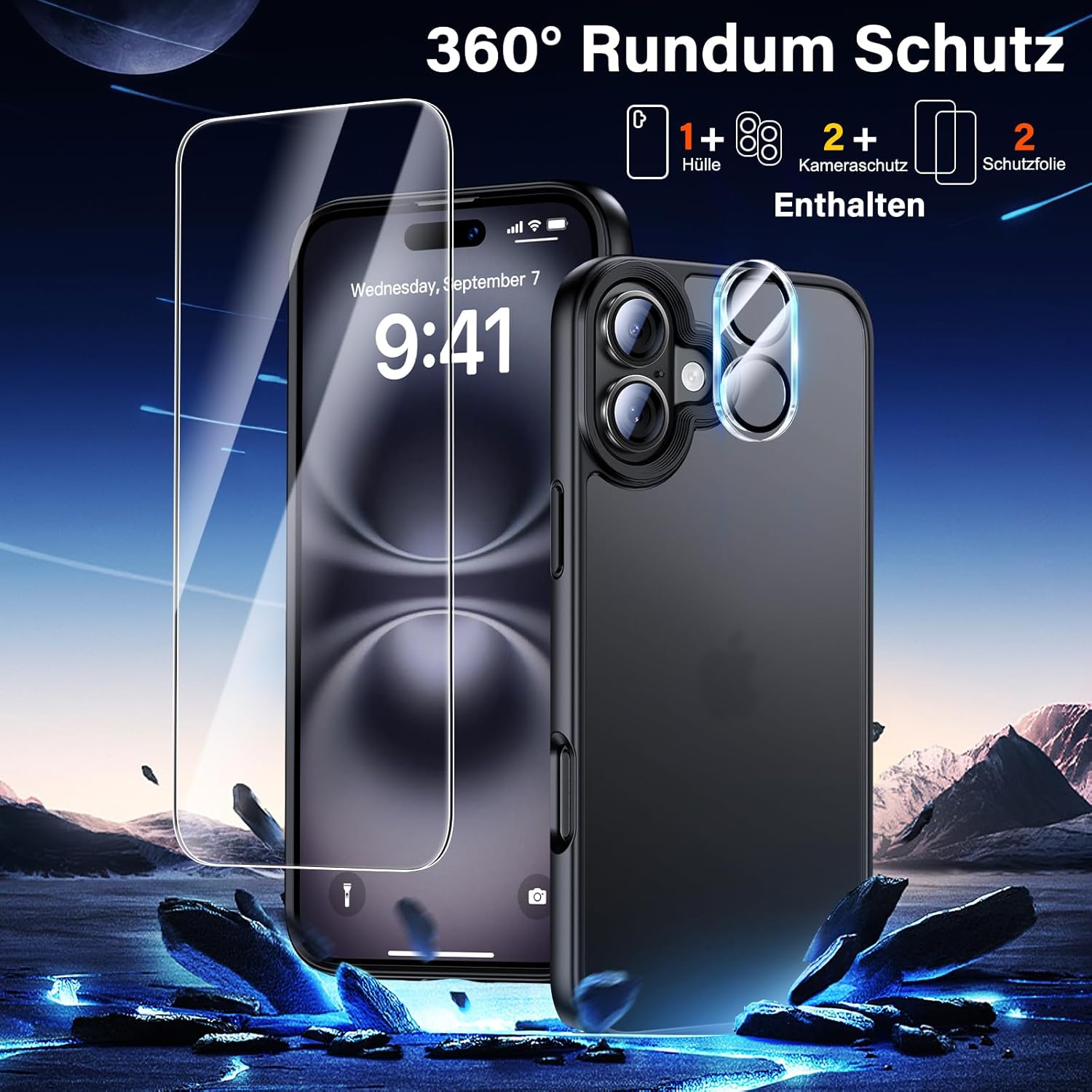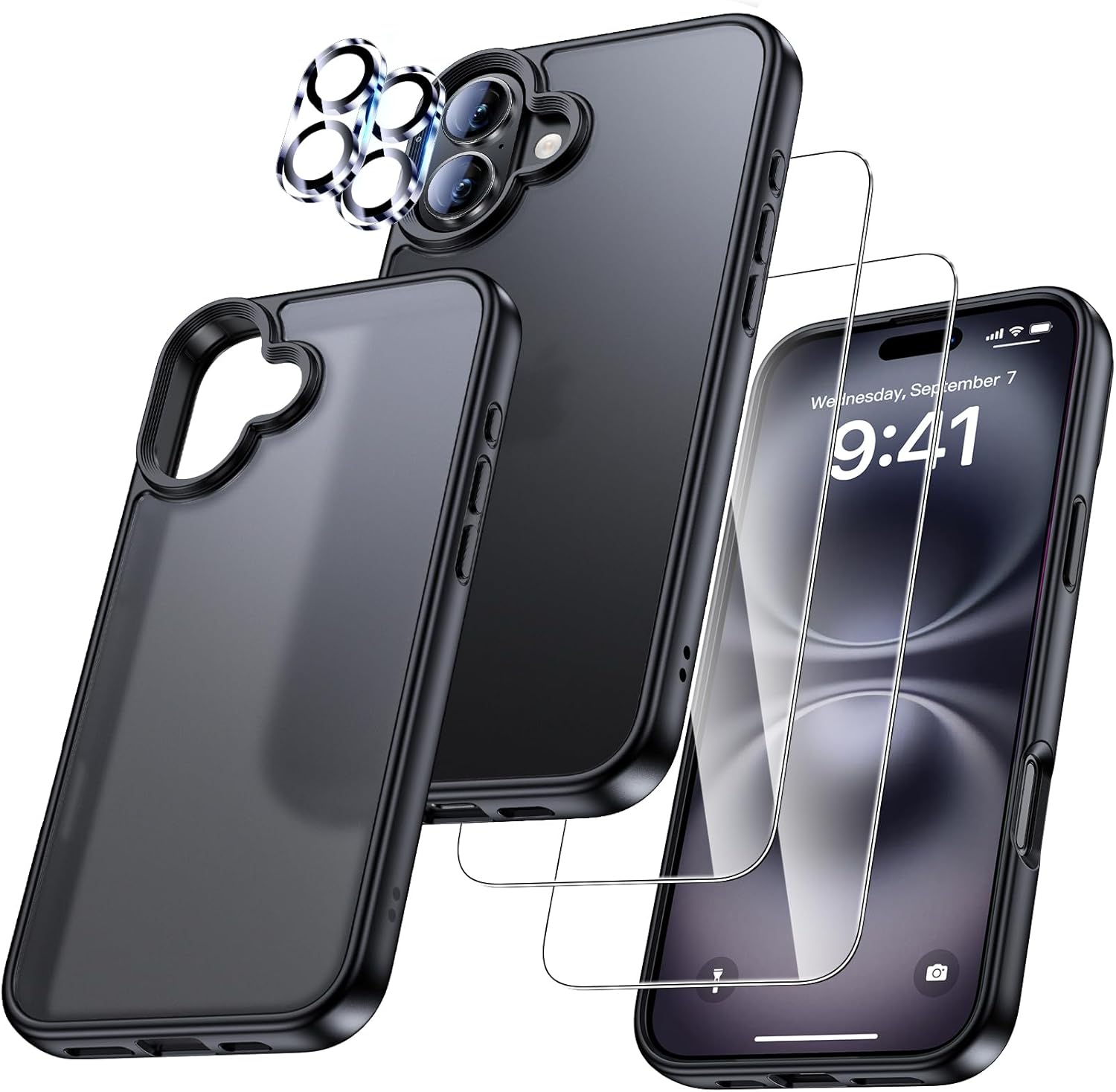 UniqueMe калъф за iPhone 16, комплект 5 в 1, калъф за мобилен телефон за iPhone 16, защитен калъф от всички страни, 1 калъф за мобилен телефон и 2 протектора за екран и 2 протектора за камера, черен