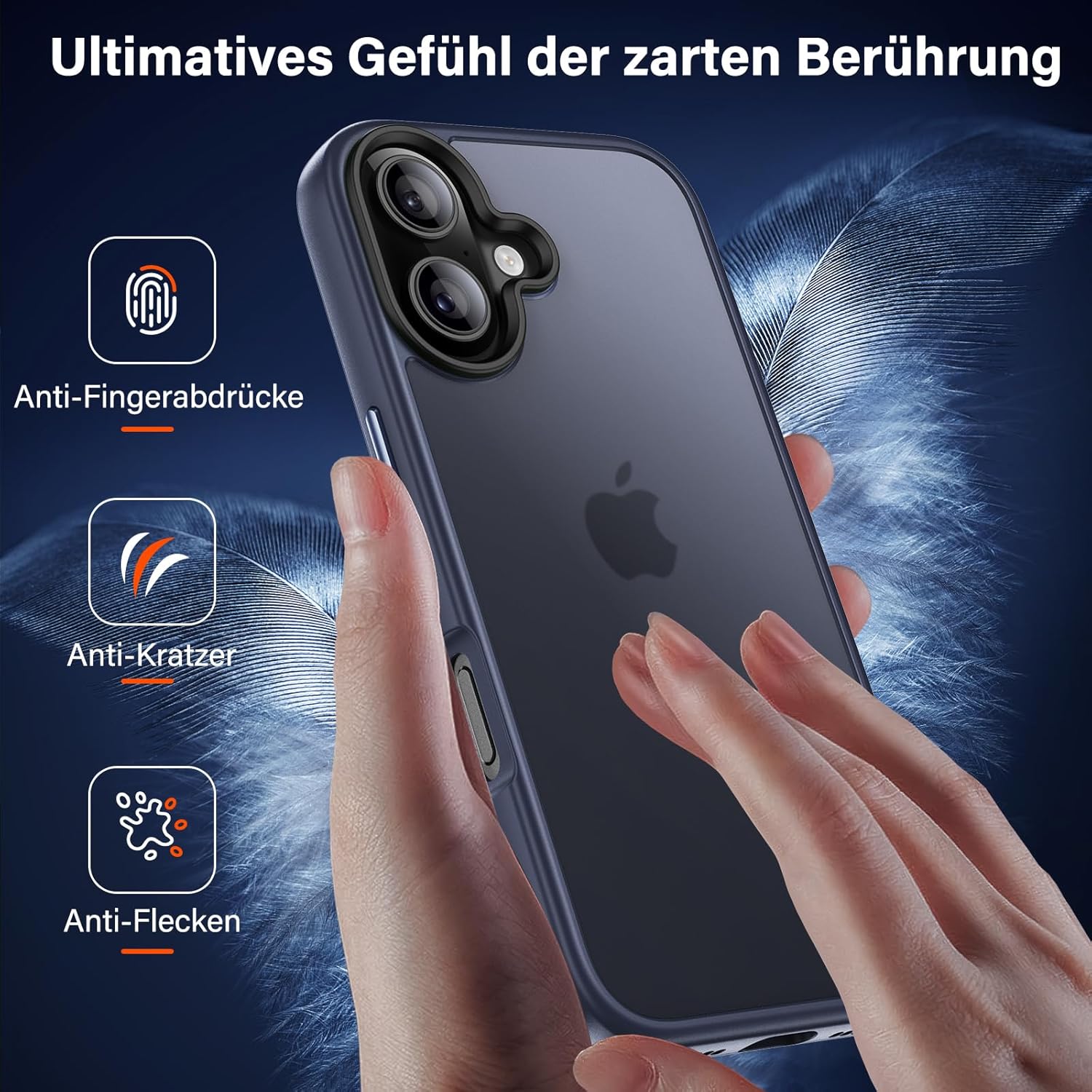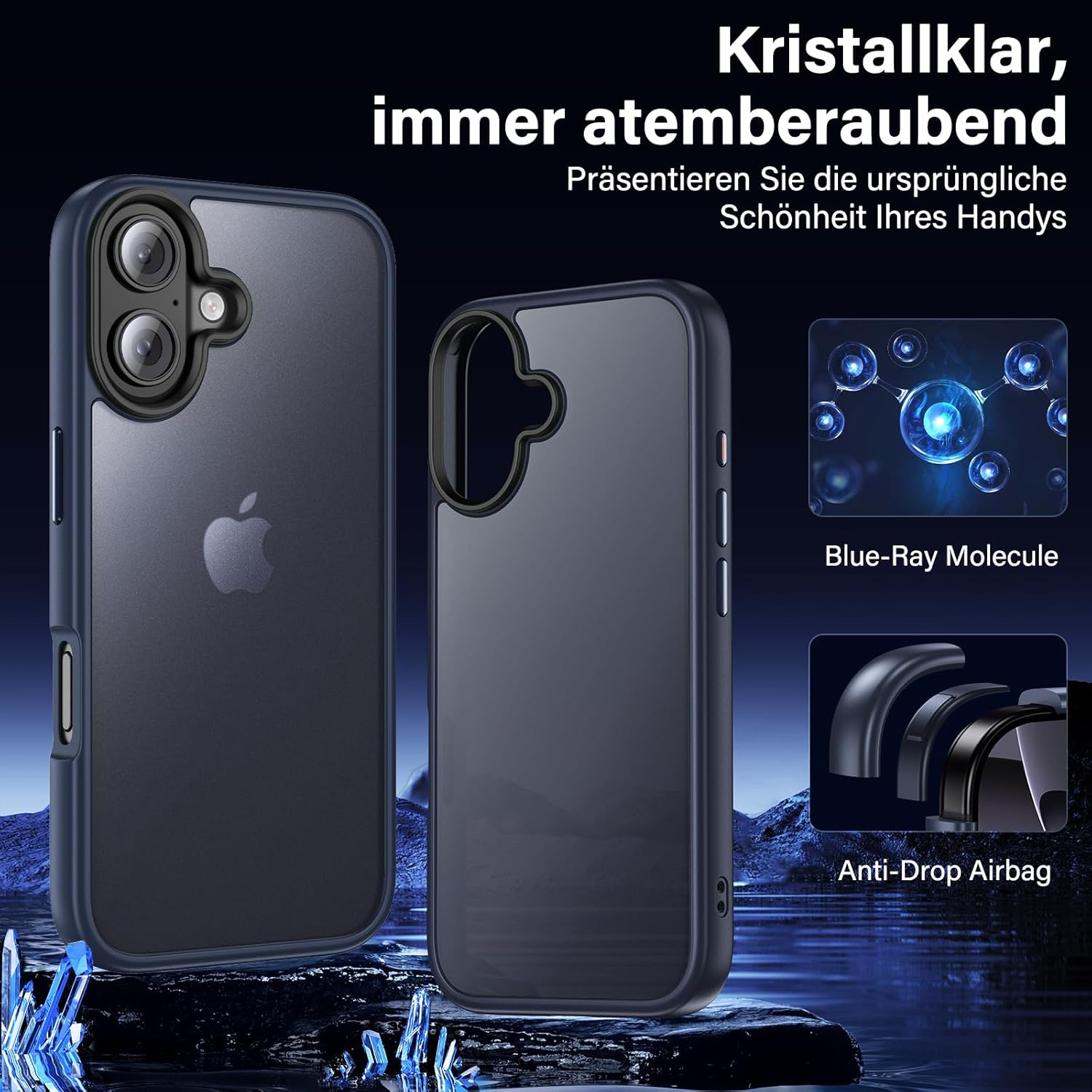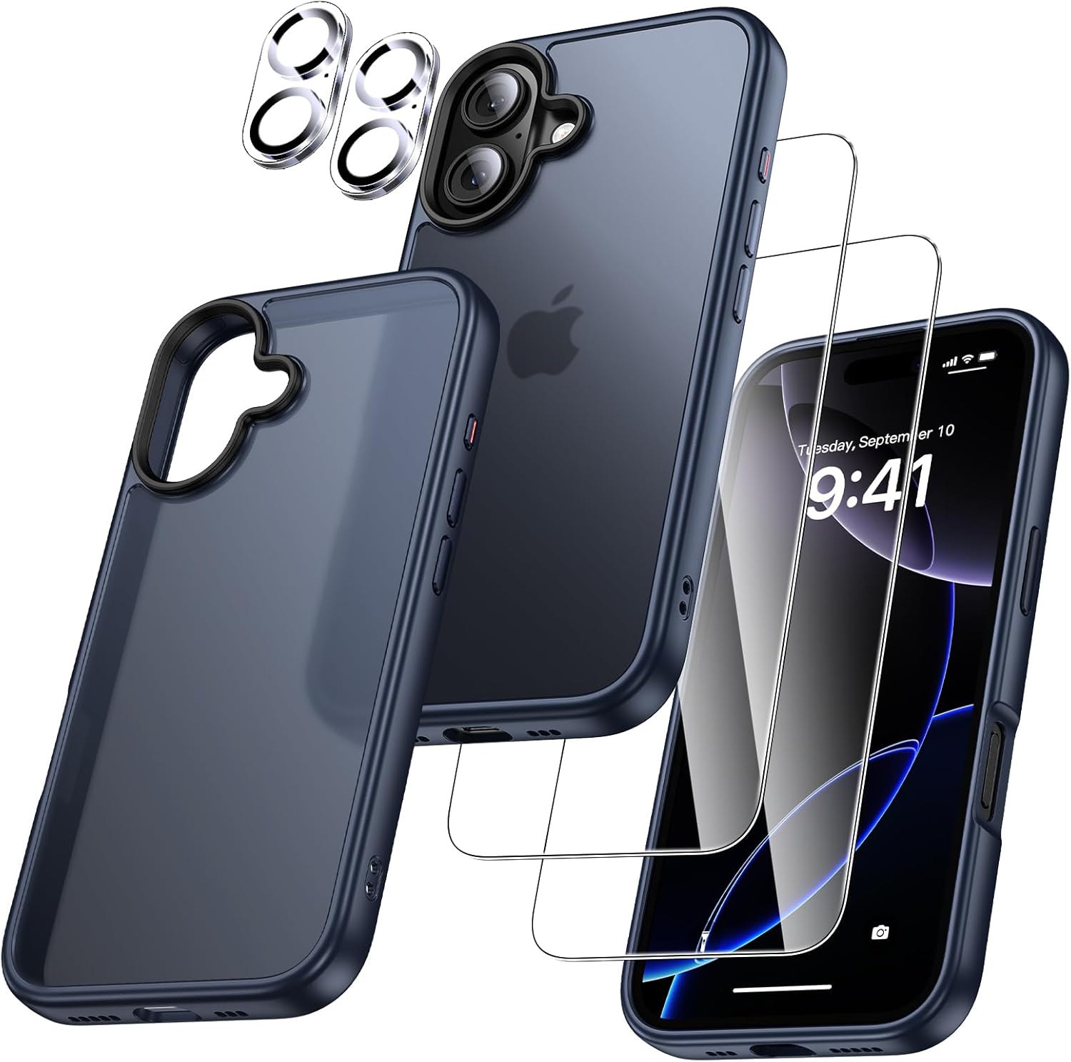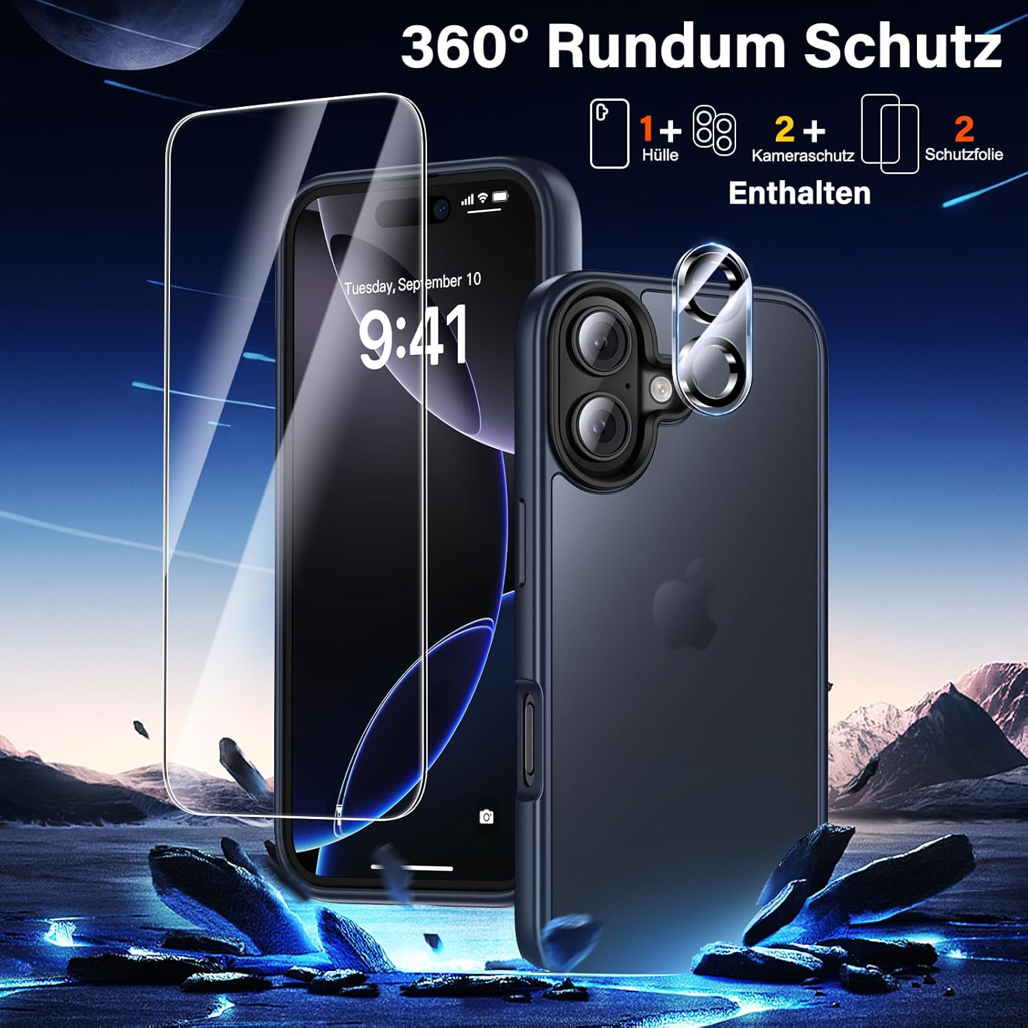 UniqueMe калъф за iPhone 16, комплект 5 в 1, калъф за мобилен телефон за iPhone 16, защитен калъф от всички страни, 1 калъф за мобилен телефон и 2 протектора за екран и 2 протектора за камера, матово син