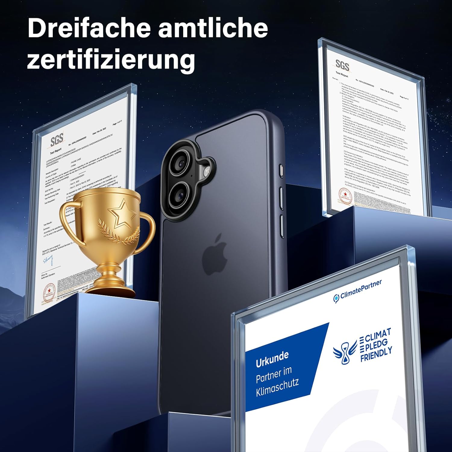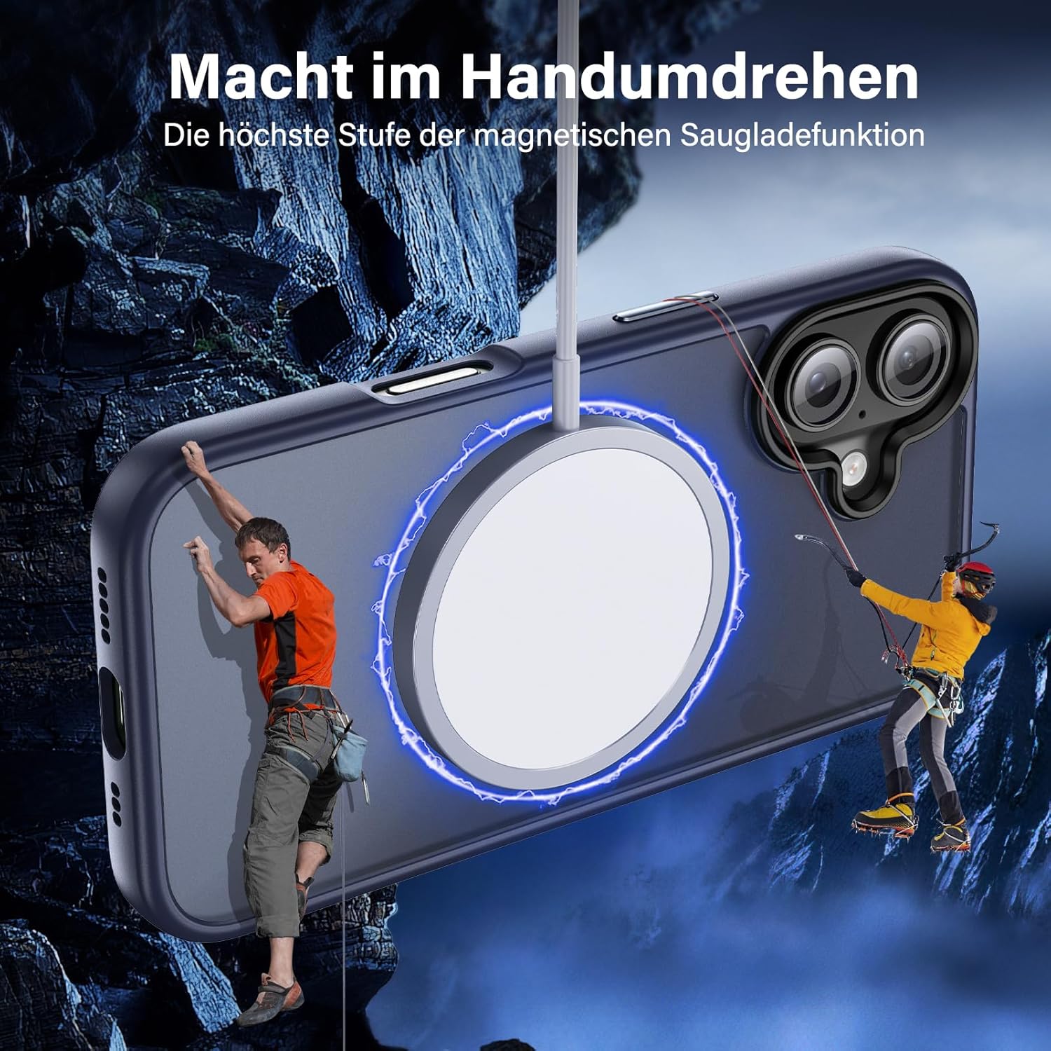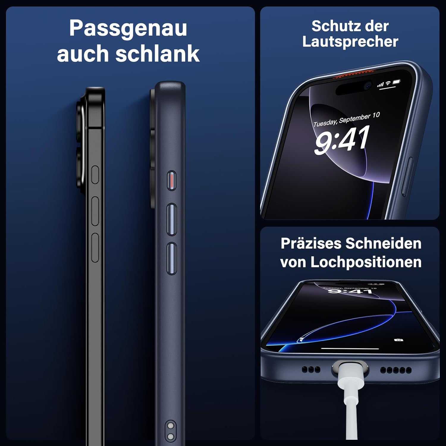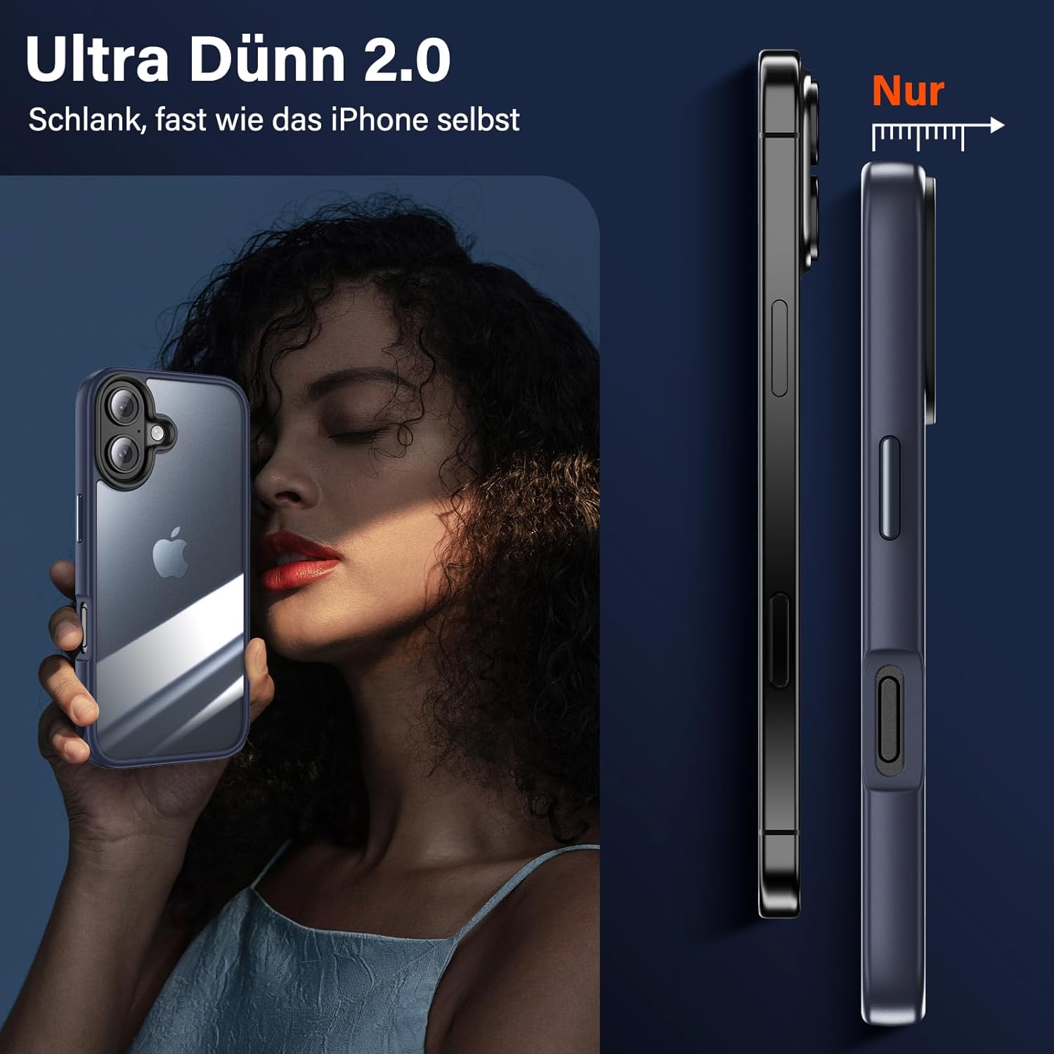 UniqueMe калъф за iPhone 16, комплект 5 в 1, калъф за мобилен телефон за iPhone 16, защитен калъф от всички страни, 1 калъф за мобилен телефон и 2 протектора за екран и 2 протектора за камера, матово син
