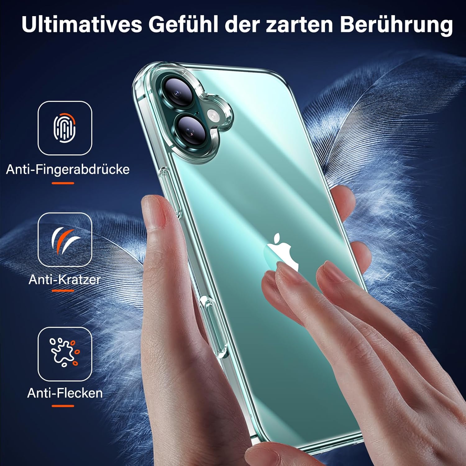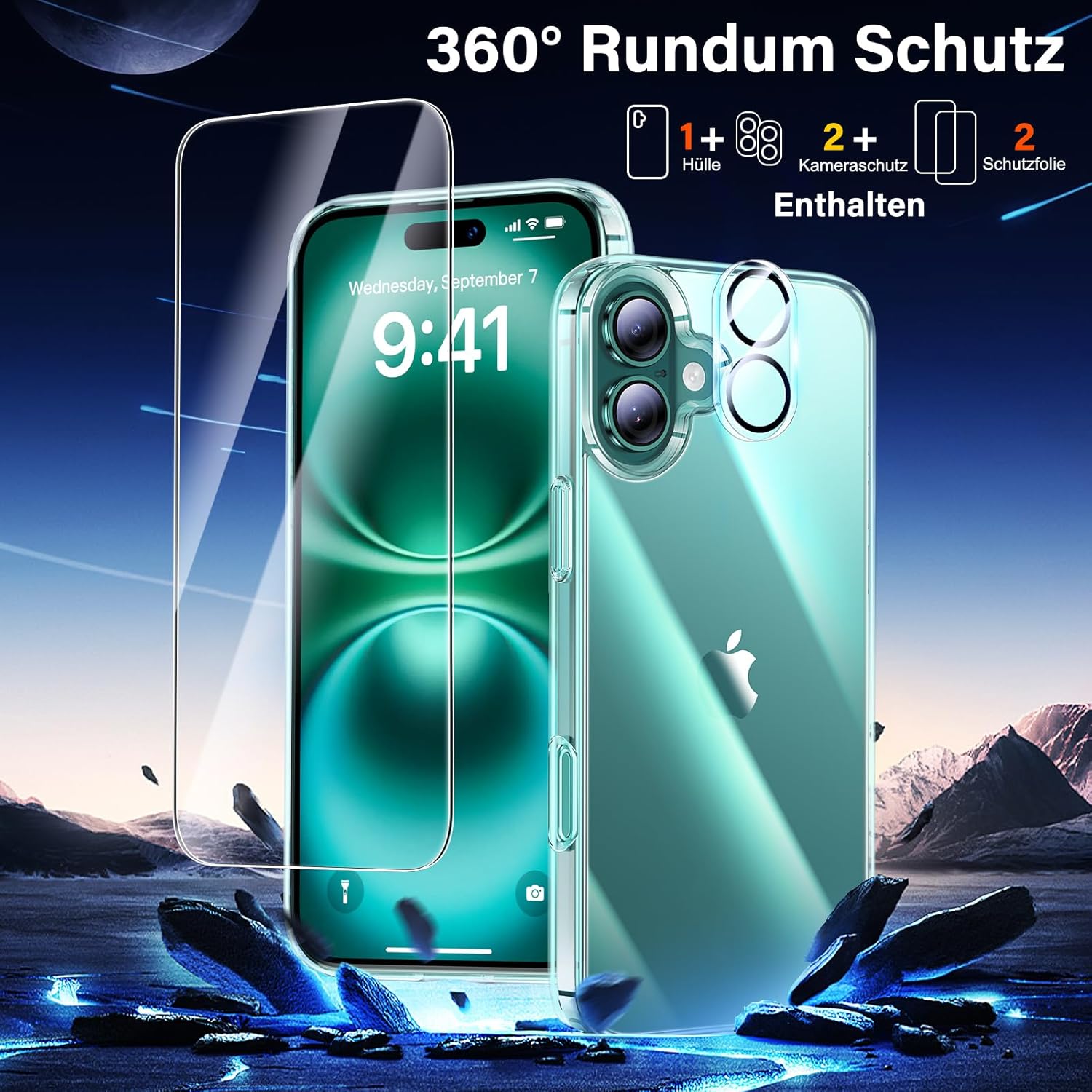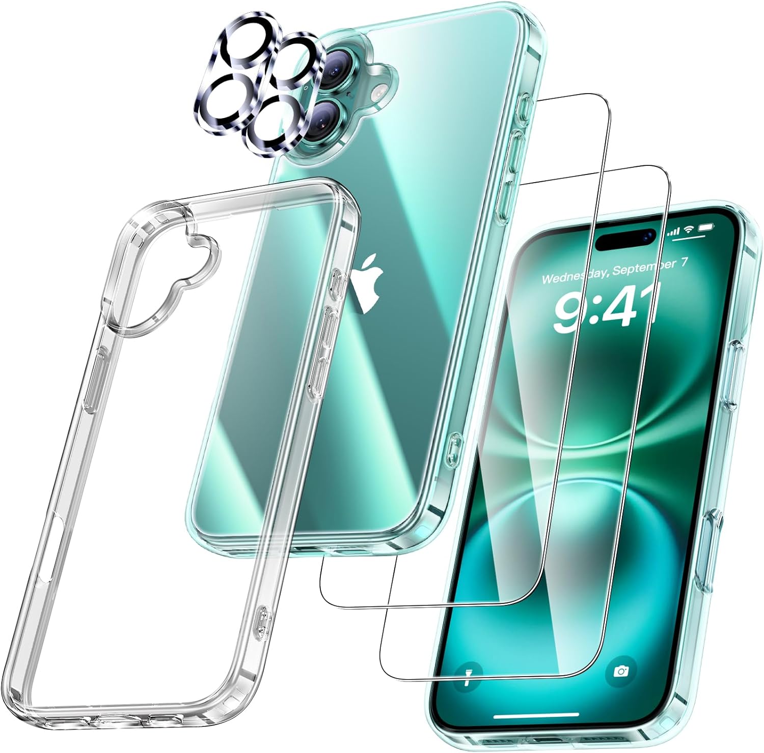 UniqueMe калъф за iPhone 16, комплект 5 в 1, калъф за мобилен телефон за iPhone 16, защитен калъф от всички страни, 1 калъф за мобилен телефон и 2 протектора за екран и 2 протектора за камера, прозрачен