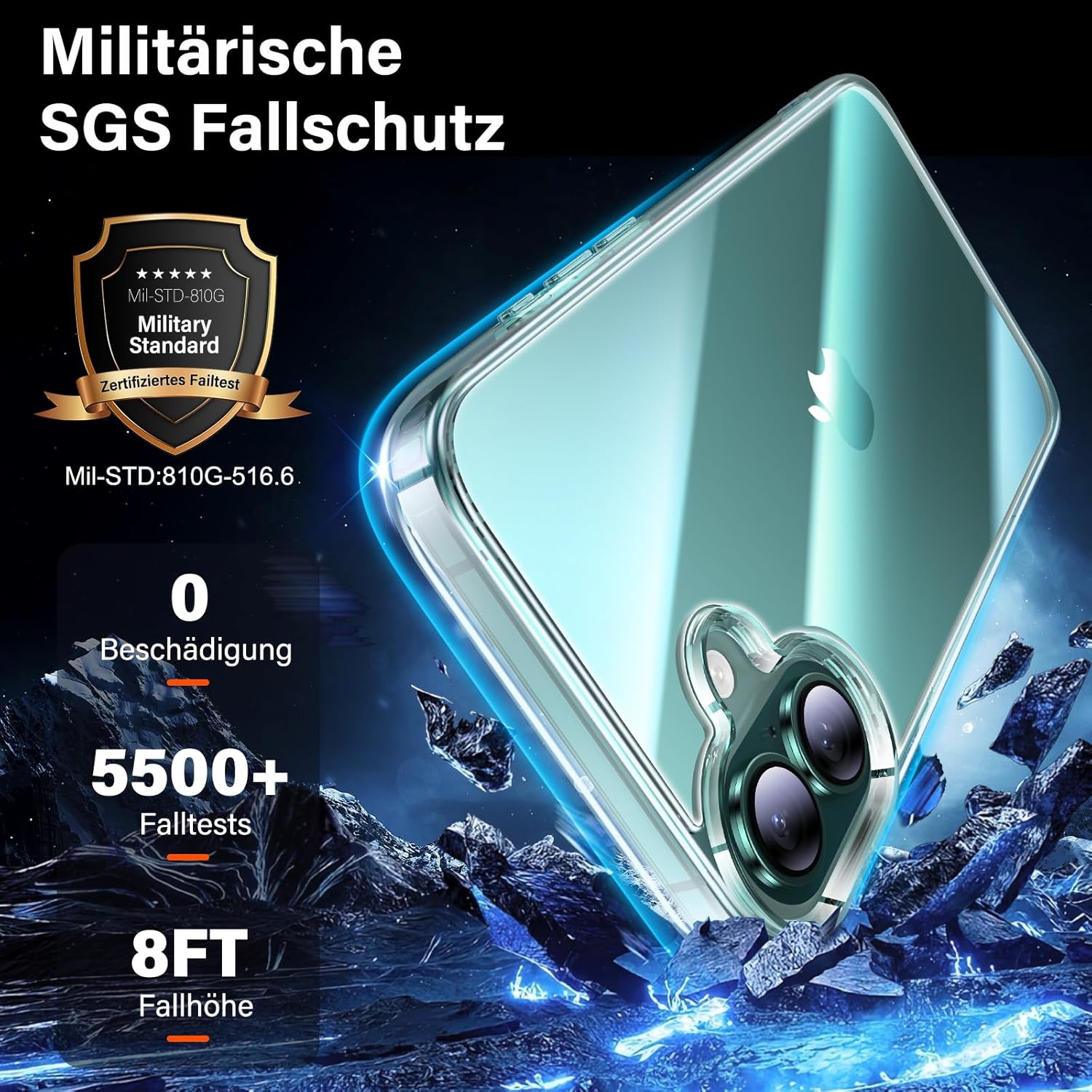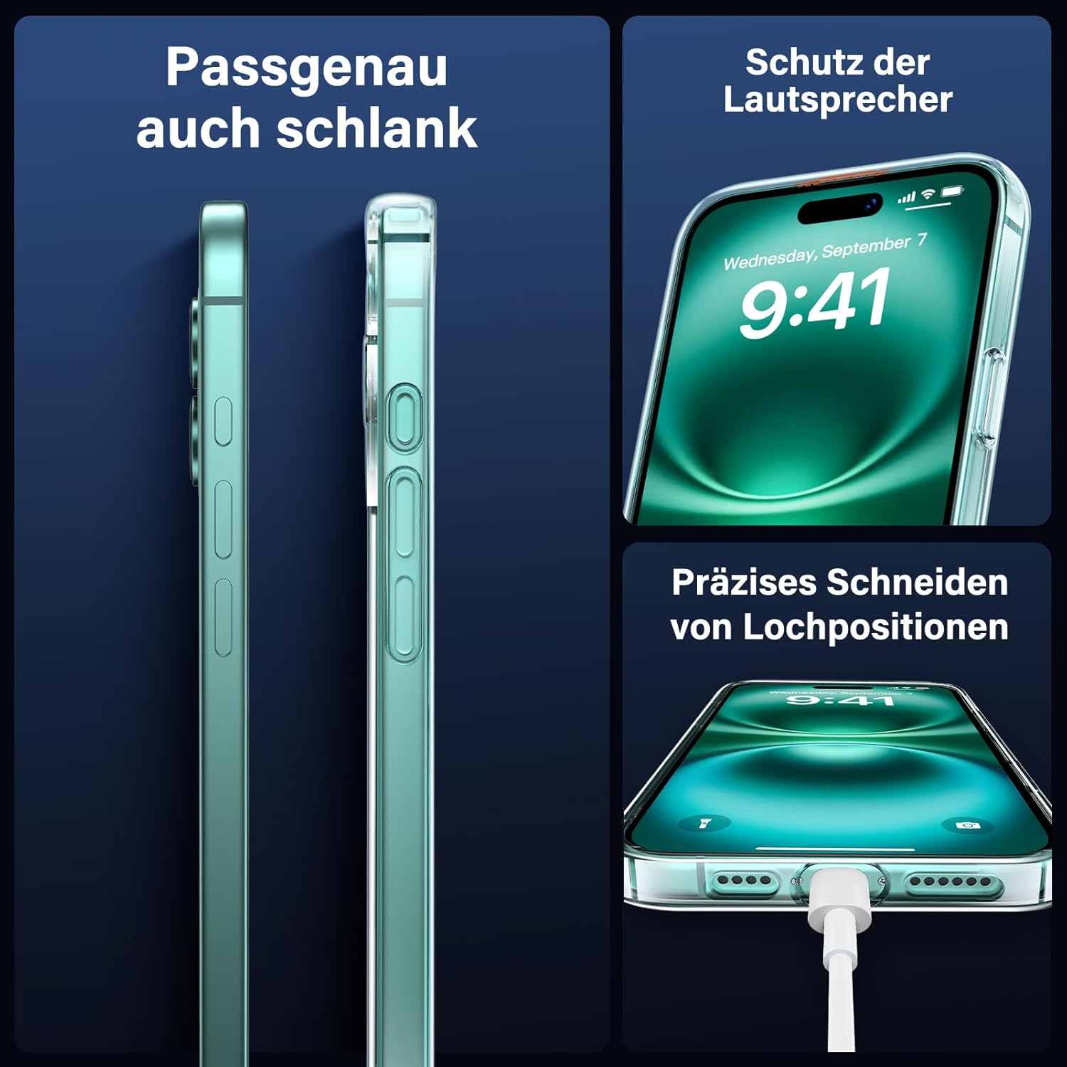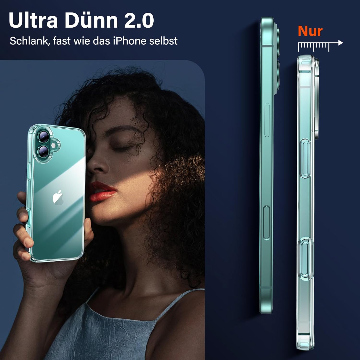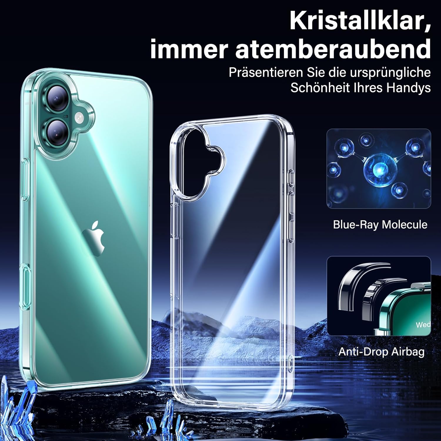 UniqueMe калъф за iPhone 16, комплект 5 в 1, калъф за мобилен телефон за iPhone 16, защитен калъф от всички страни, 1 калъф за мобилен телефон и 2 протектора за екран и 2 протектора за камера, прозрачен