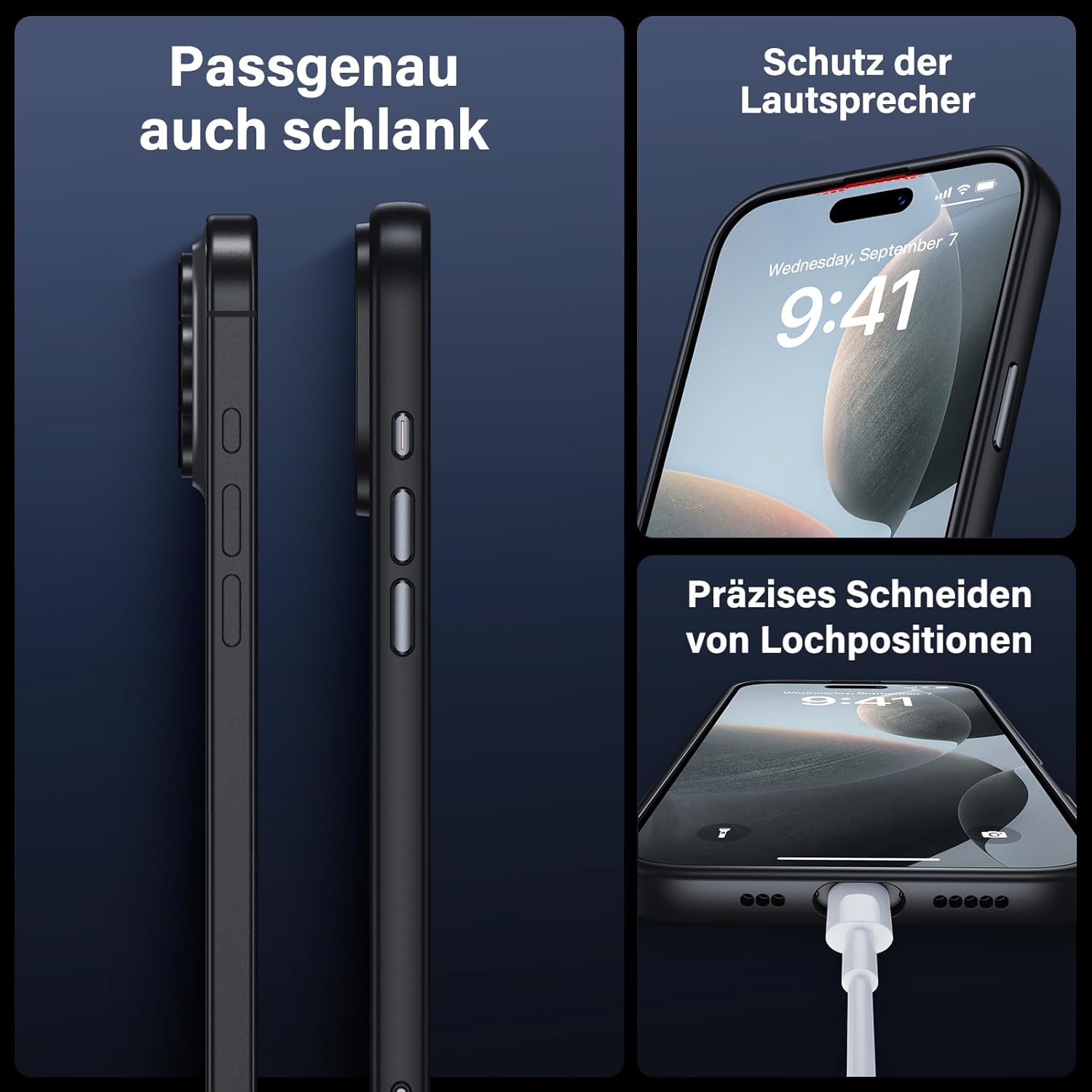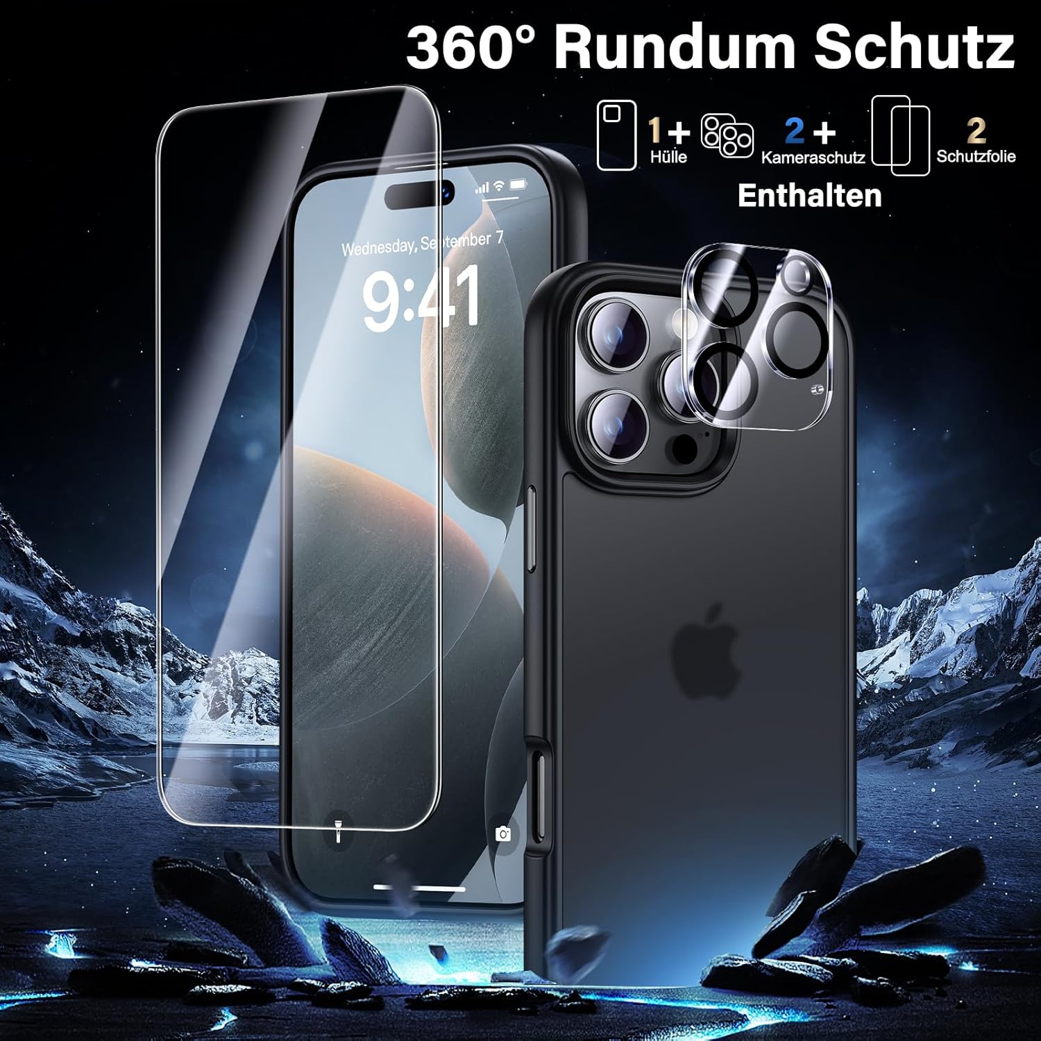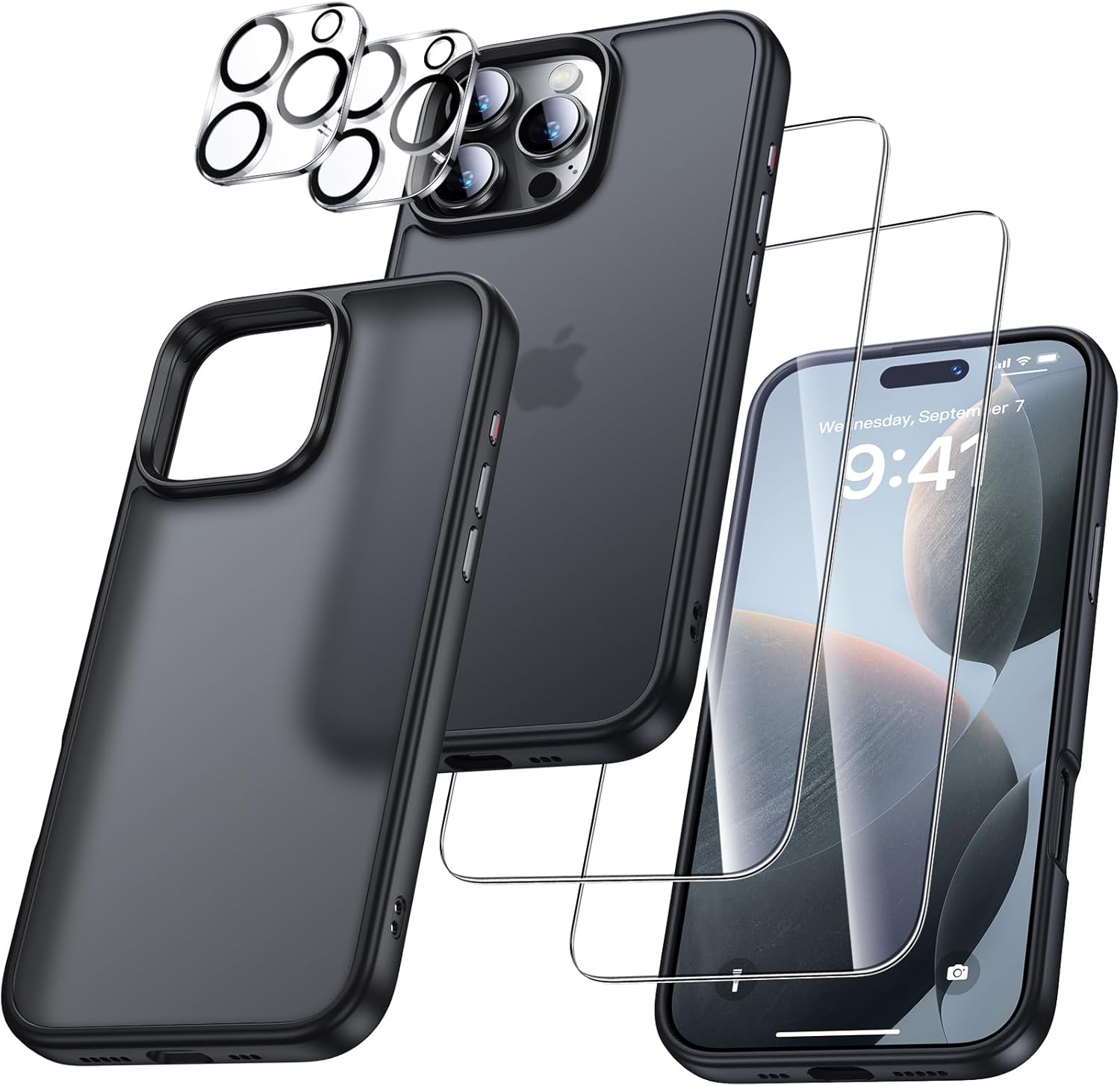 UniqueMe калъф за iPhone 16 Pro, комплект 5 в 1, калъф за мобилен телефон за iPhone 16 Pro, защитен калъф от всички страни, 1 калъф за мобилен телефон и 2 протектора за екран и 2 протектора за камера, матово черно