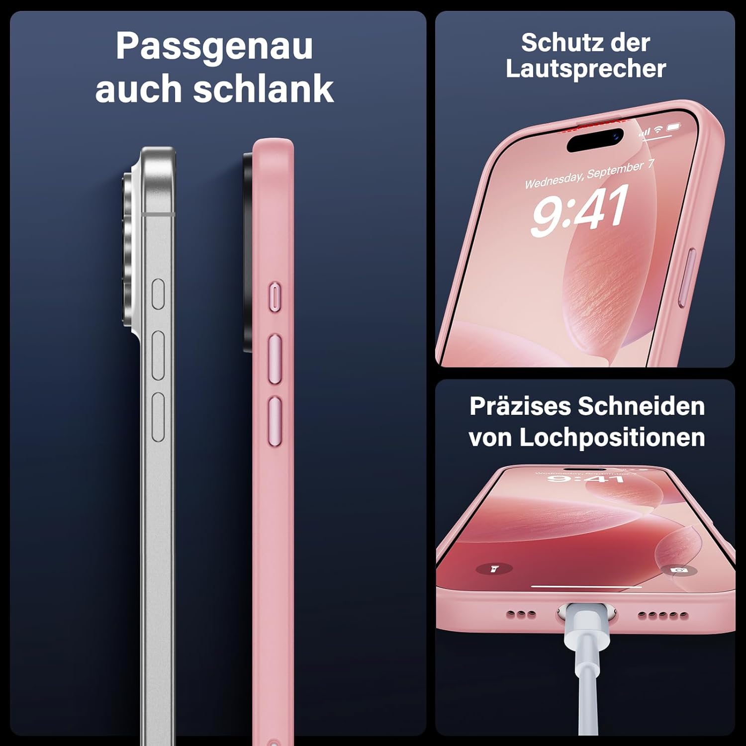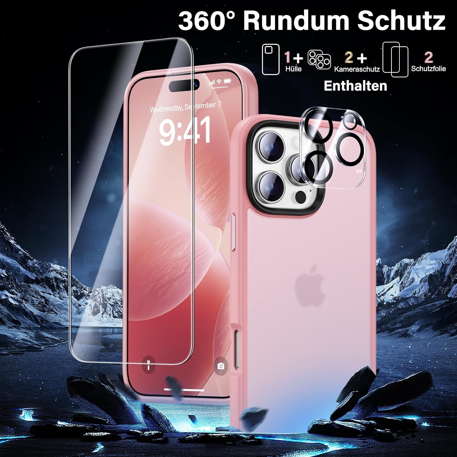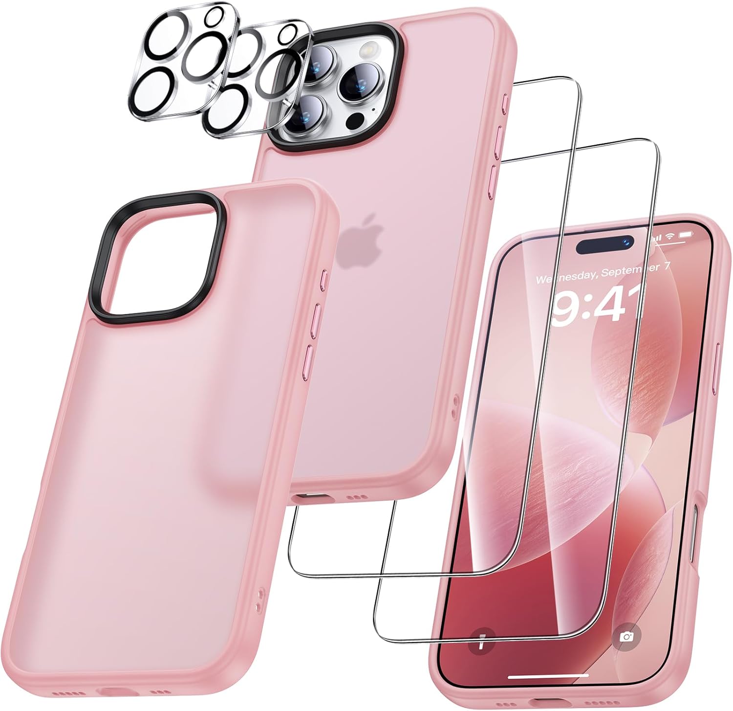 UniqueMe калъф за iPhone 16 Pro, комплект 5 в 1, калъф за мобилен телефон за iPhone 16 Pro, защитен калъф от всички страни, 1 калъф за мобилен телефон и 2 протектора за екран и 2 протектора за камера, матово розов