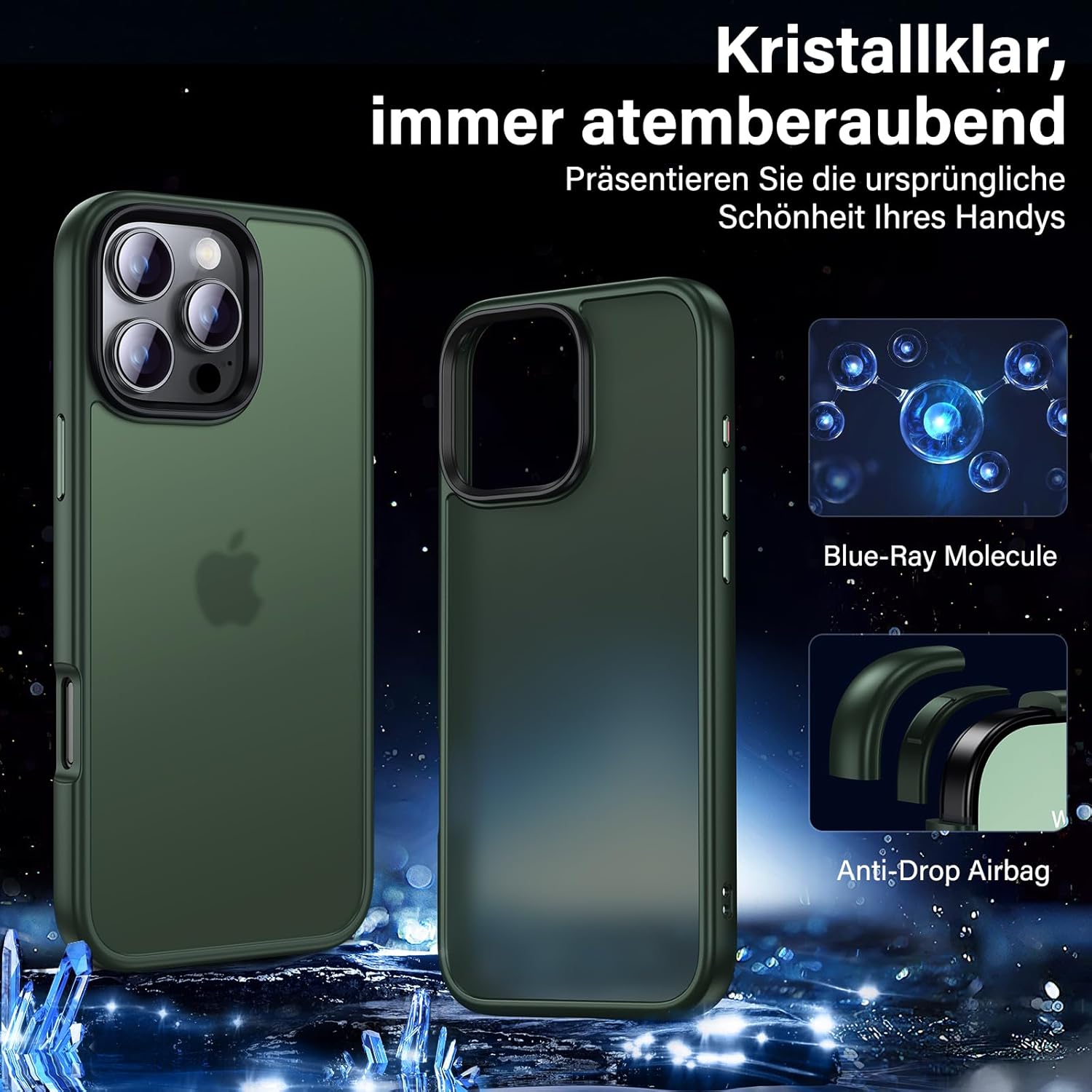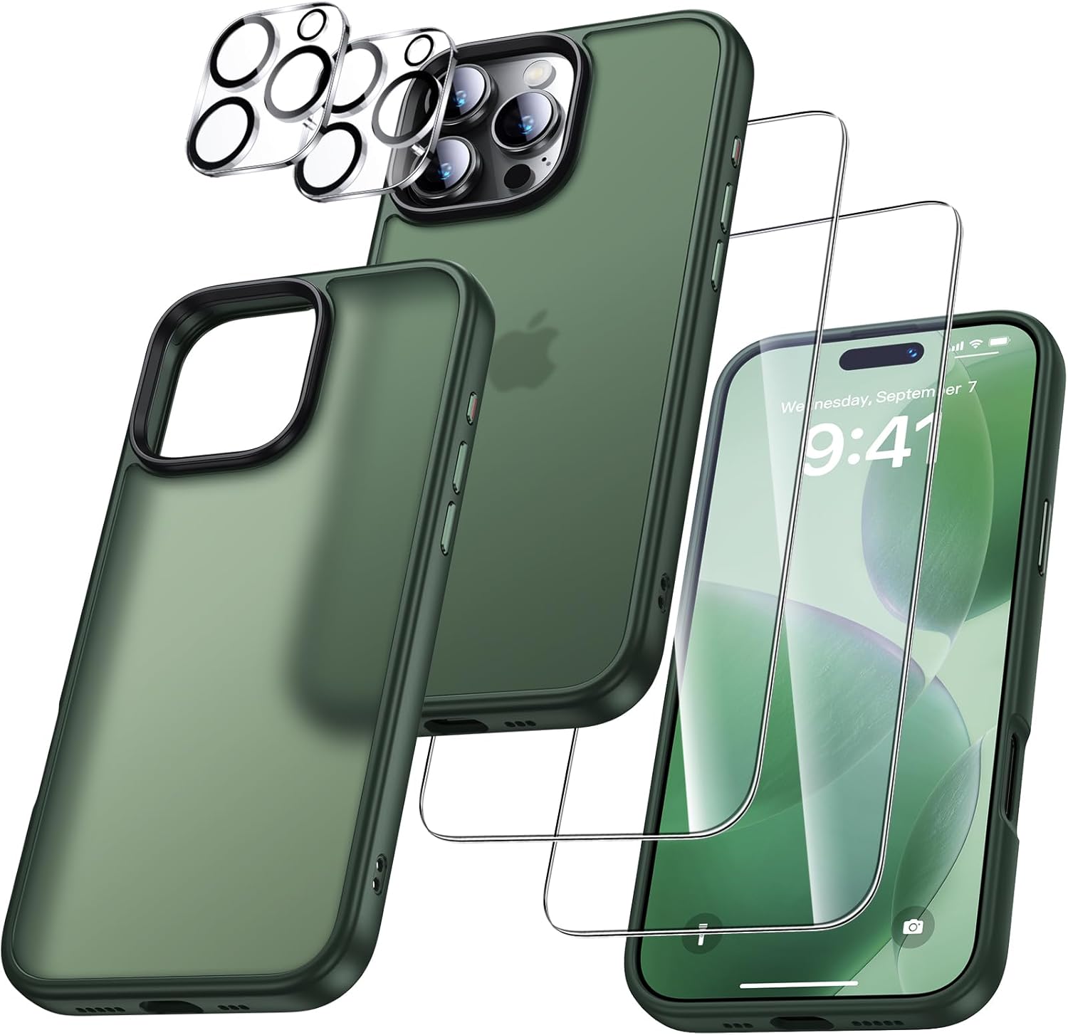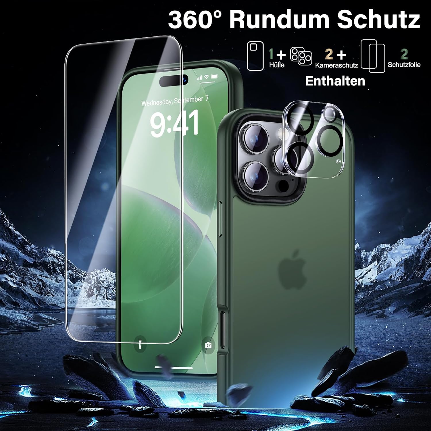 UniqueMe калъф за iPhone 16 Pro, комплект 5 в 1, калъф за мобилен телефон за iPhone 16 Pro, защитен калъф от всички страни, 1 калъф за мобилен телефон и 2 протектора за екран и 2 протектора за камера, матово зелен