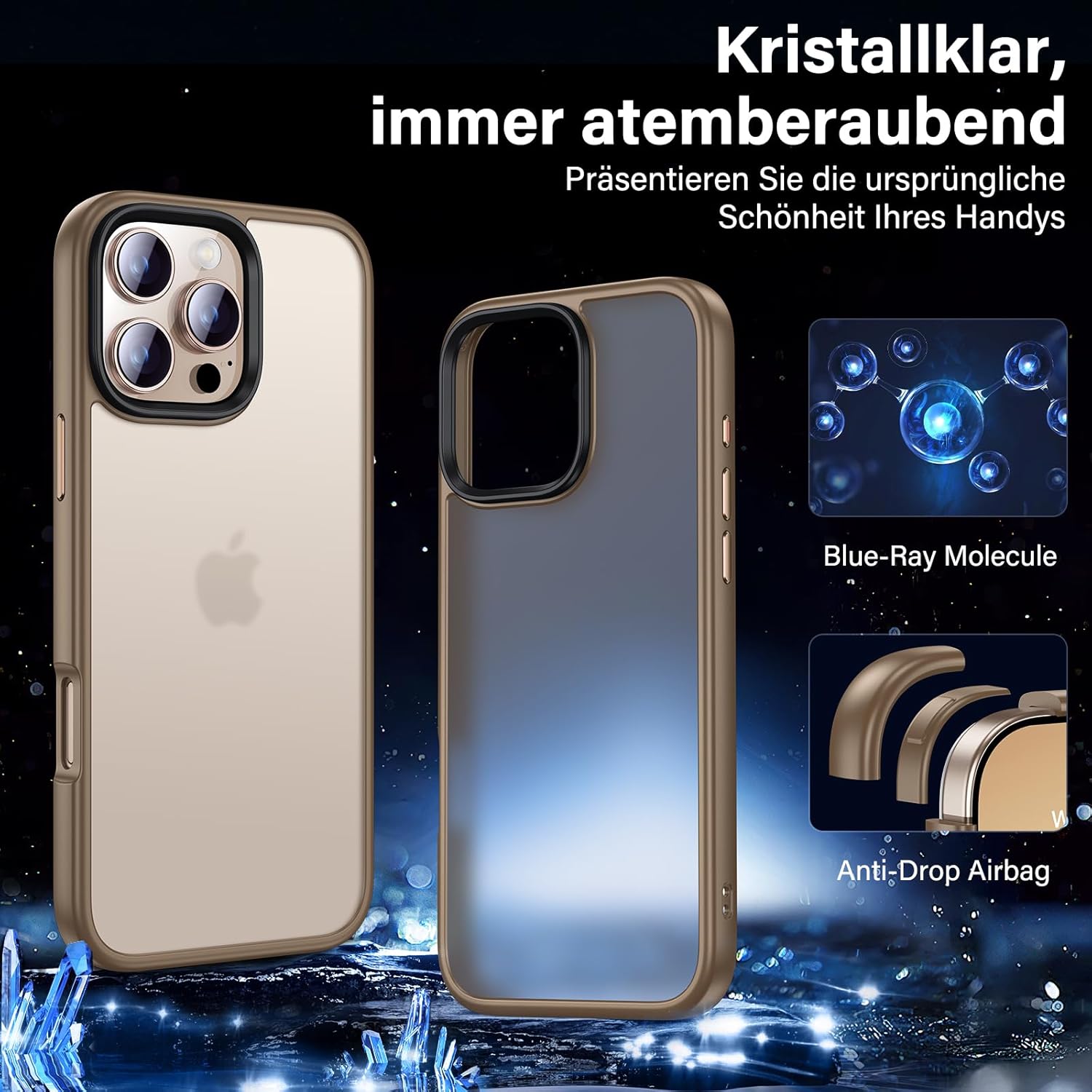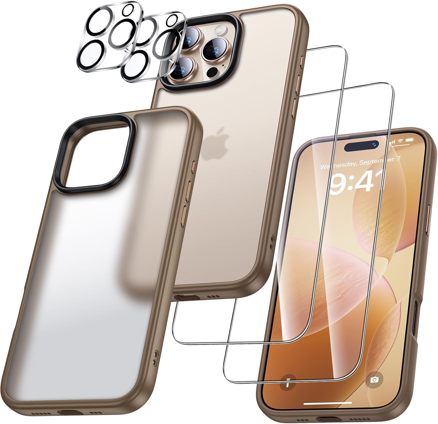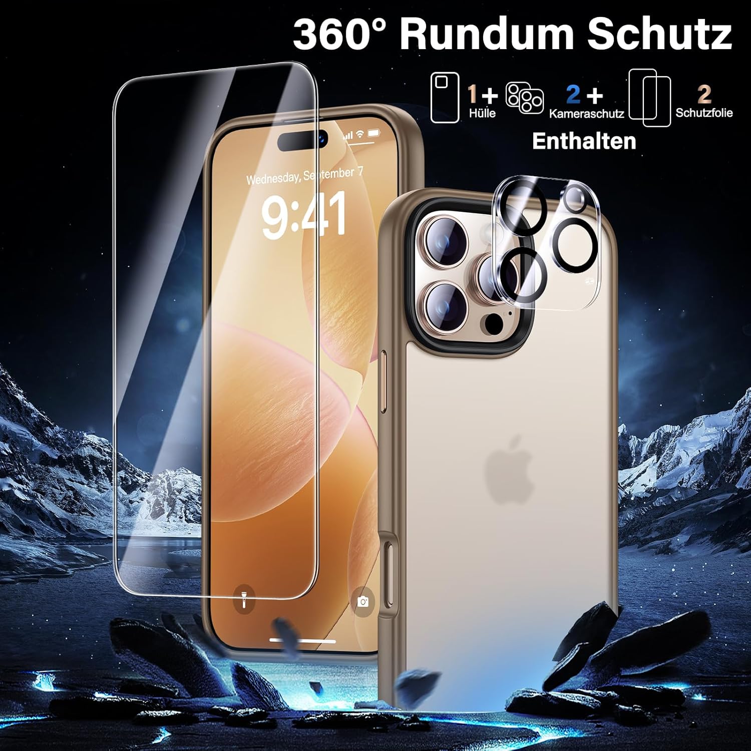 UniqueMe калъф за iPhone 16 Pro, комплект 5 в 1, калъф за мобилен телефон за iPhone 16 Pro, защитен калъф от всички страни, 1 калъф за мобилен телефон и 2 протектора за екран и 2 протектора за камера, матово златист