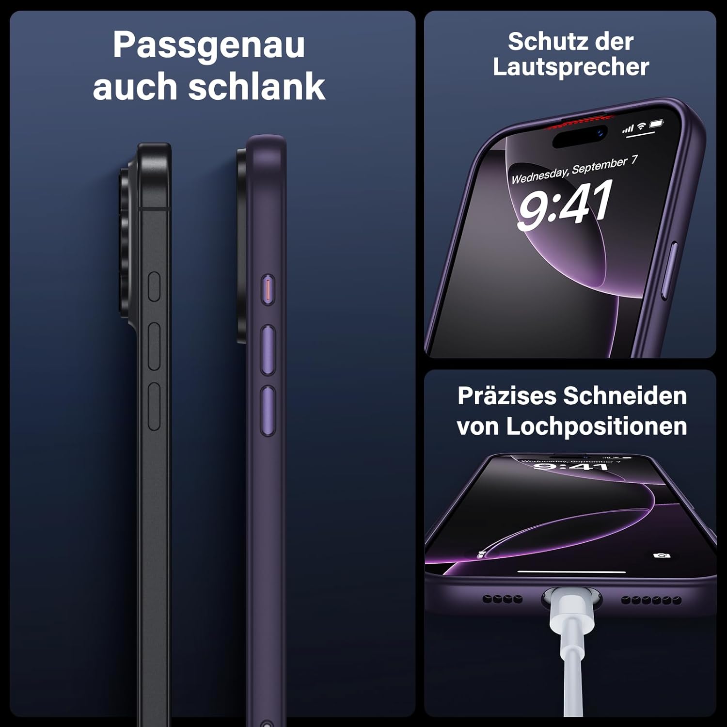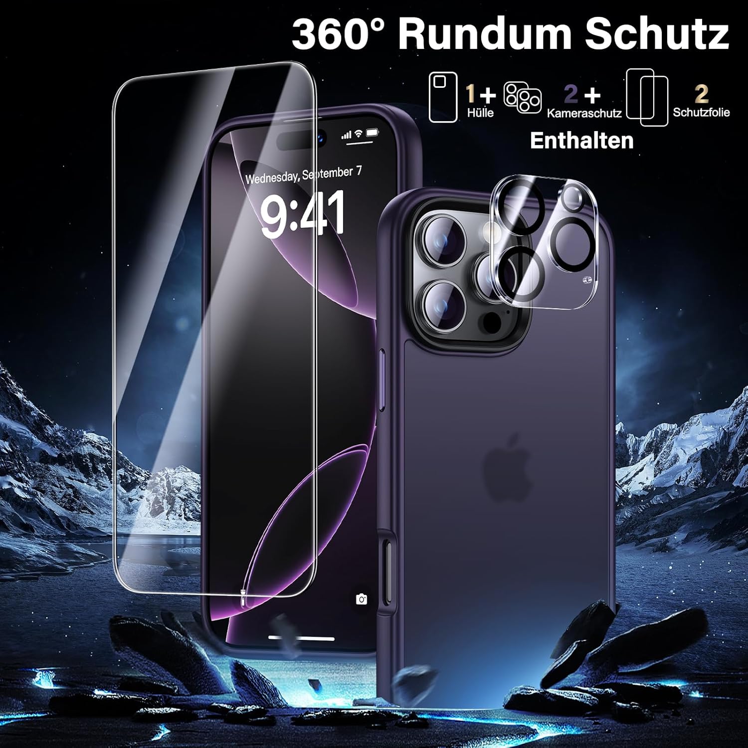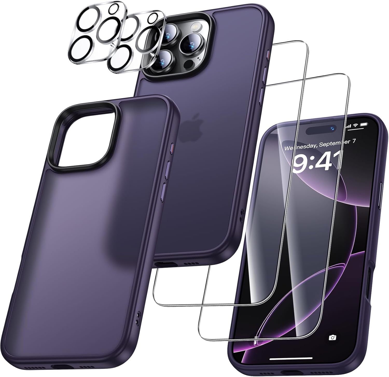UniqueMe калъф за iPhone 16 Pro Max, комплект 5 в 1, калъф за мобилен телефон за iPhone 16 Pro Max, защитен калъф от всички страни, 1 калъф за мобилен телефон и 2 протектора за екран и 2 протектора за камера, матово лилав