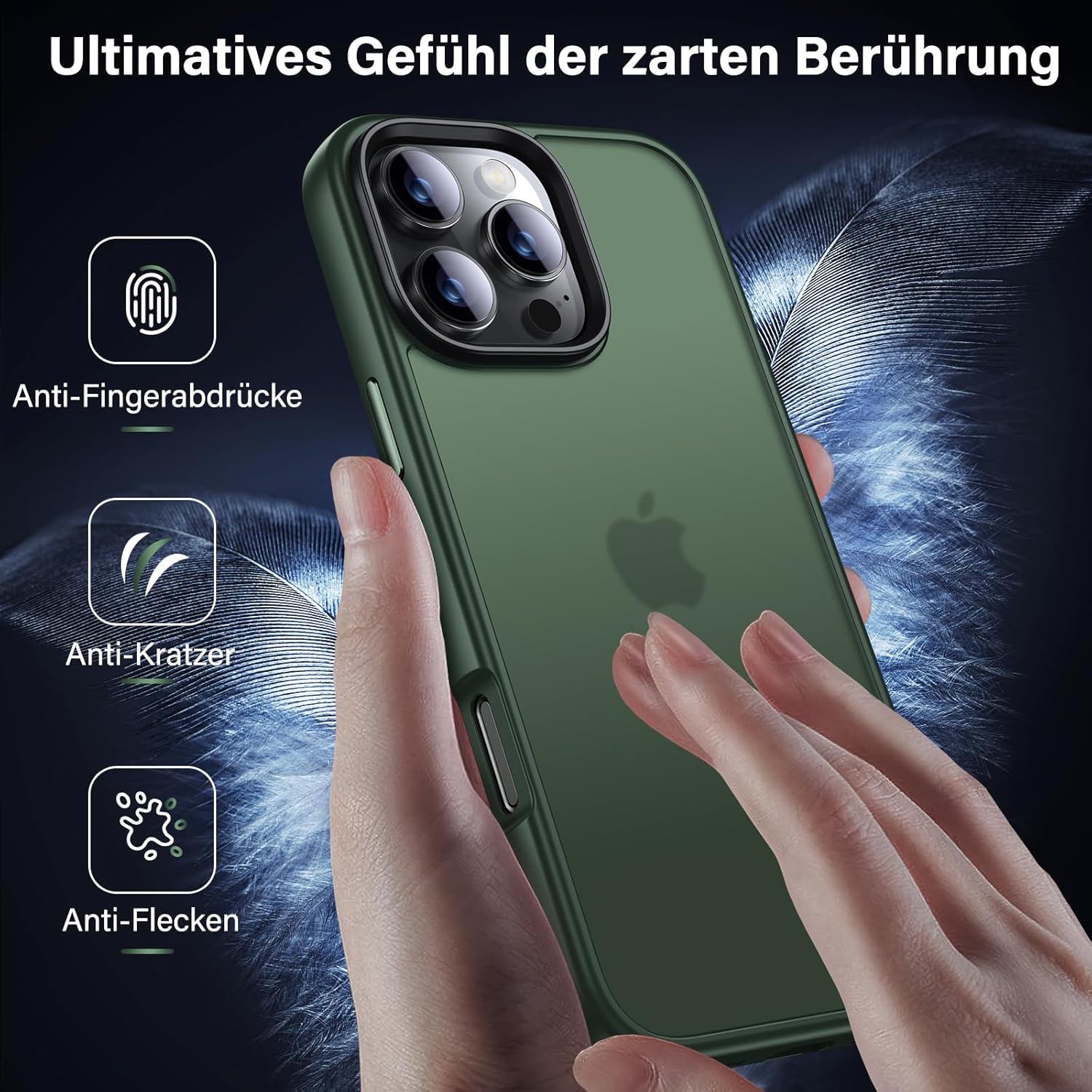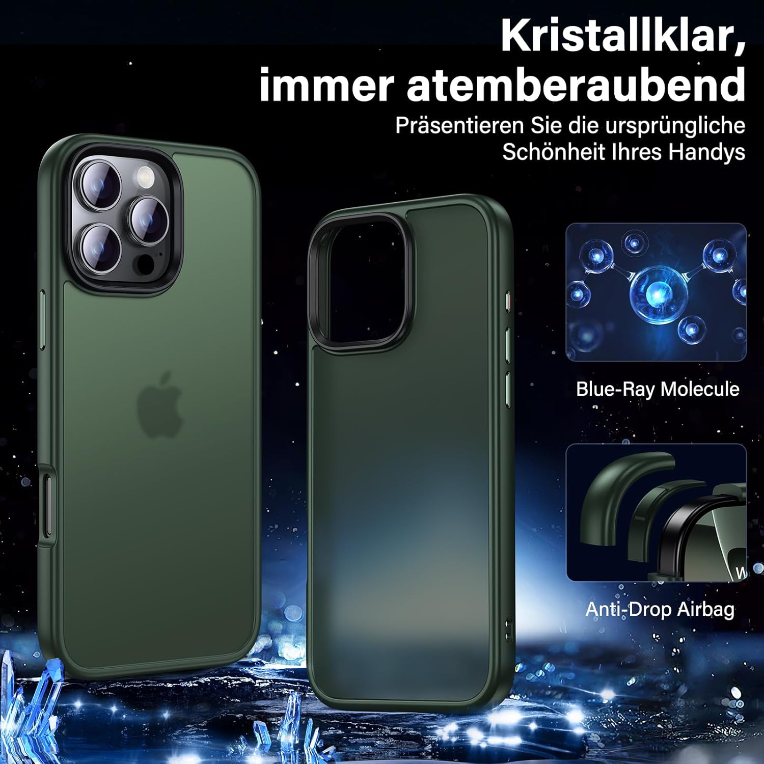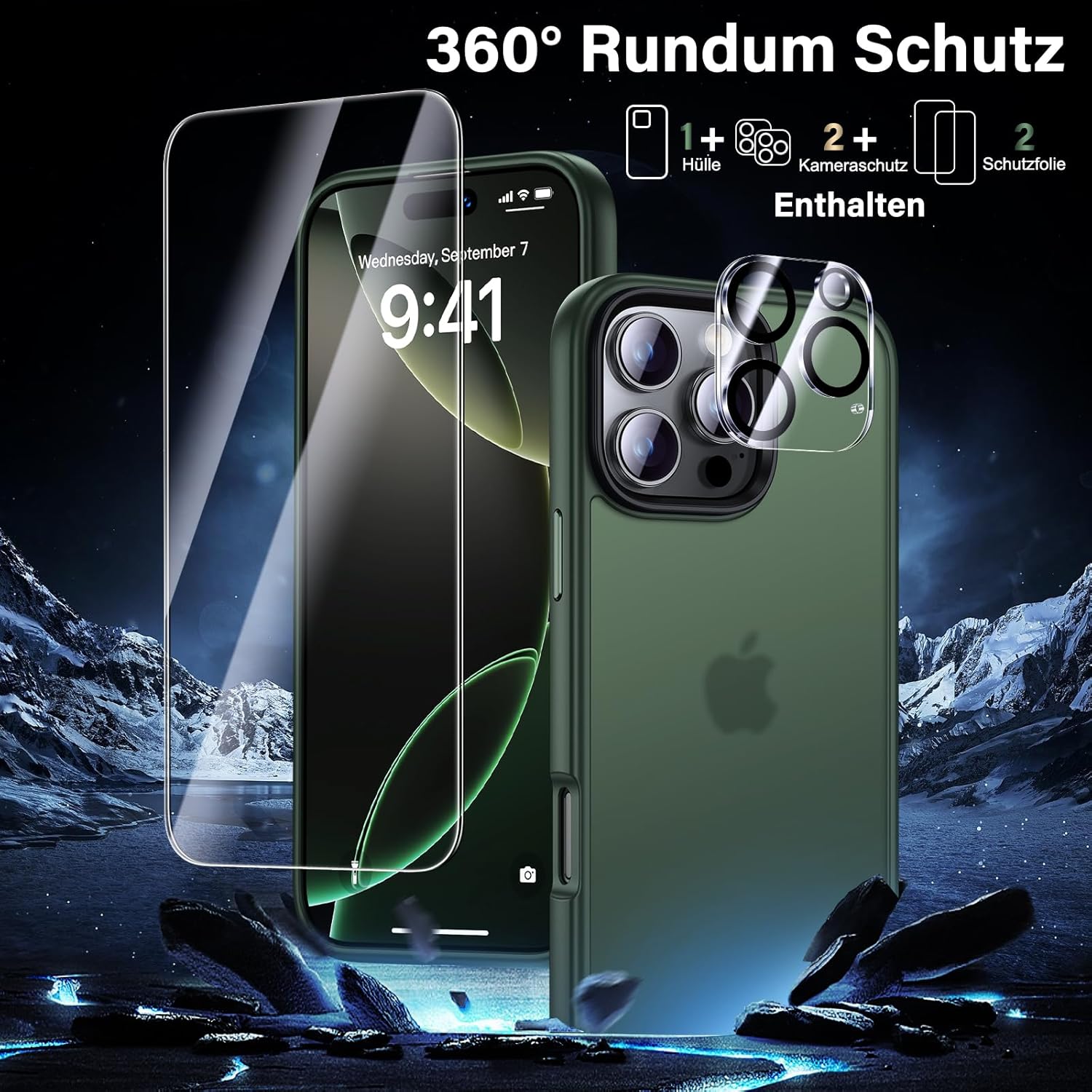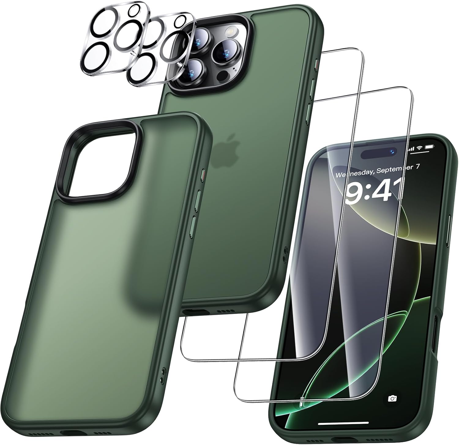UniqueMe калъф за iPhone 16 Pro Max, комплект 5 в 1, калъф за мобилен телефон за iPhone 16 Pro Max, защитен калъф от всички страни, 1 калъф за мобилен телефон и 2 протектора за екран и 2 протектора за камера, матово зелен