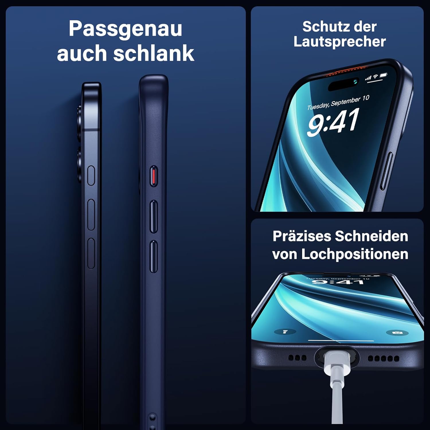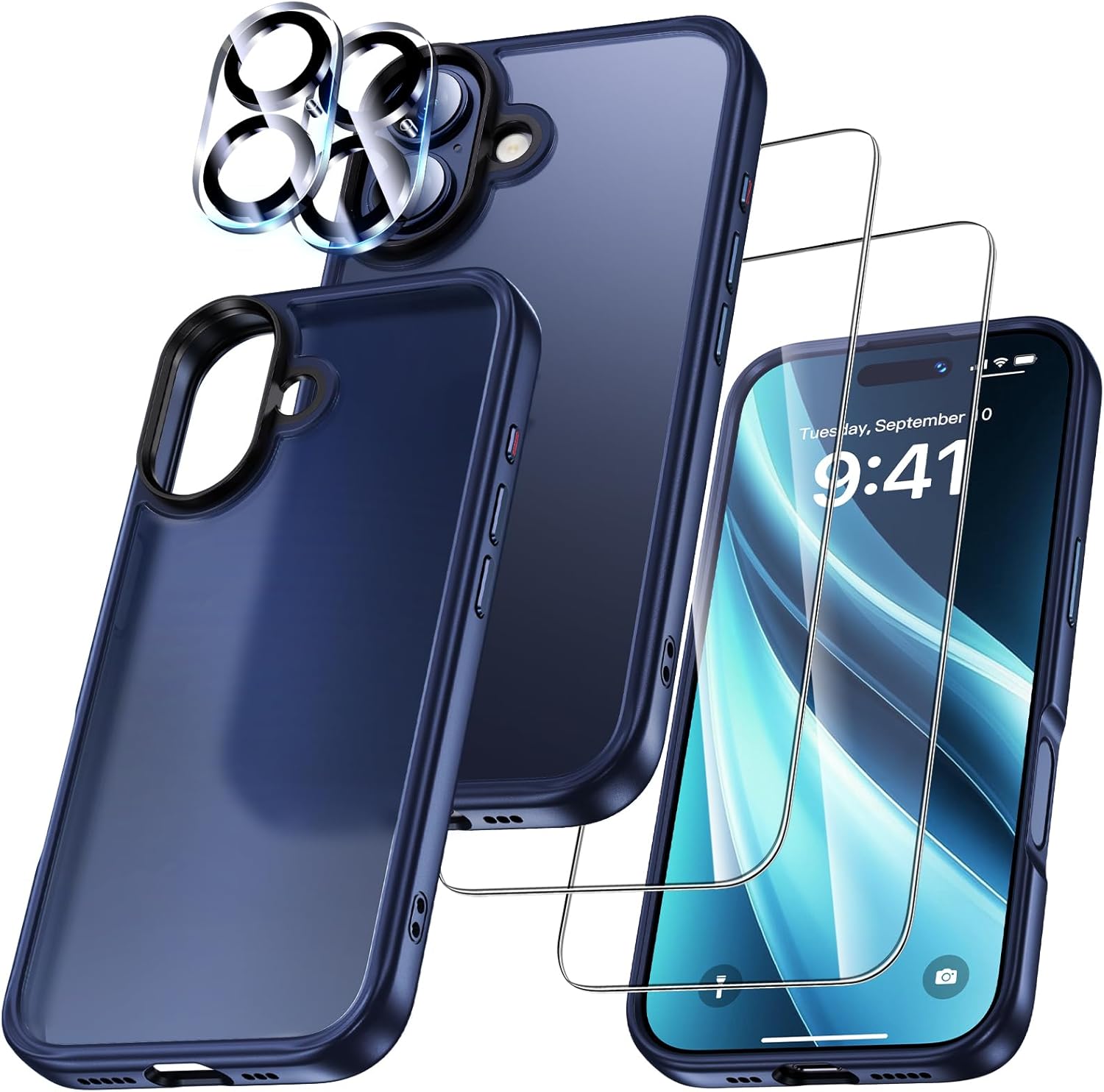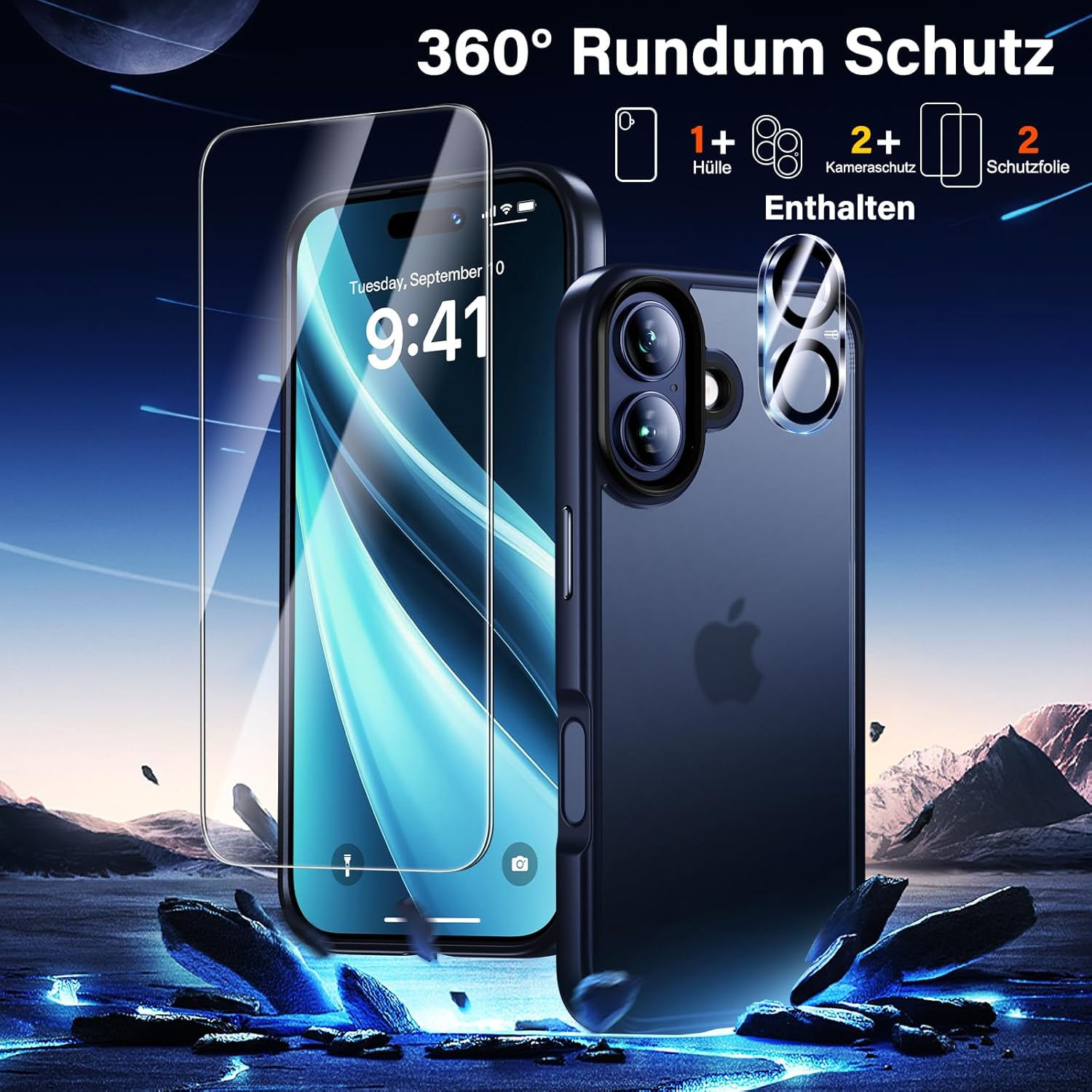 UniqueMe калъф за iPhone 17 - Калъф за мобилен телефон за iPhone 17, комплект 5 в 1, защитен калъф за цялостна защита, 1 калъф за мобилен телефон, 2 протектора за екран и 2 протектора за камера - матово син