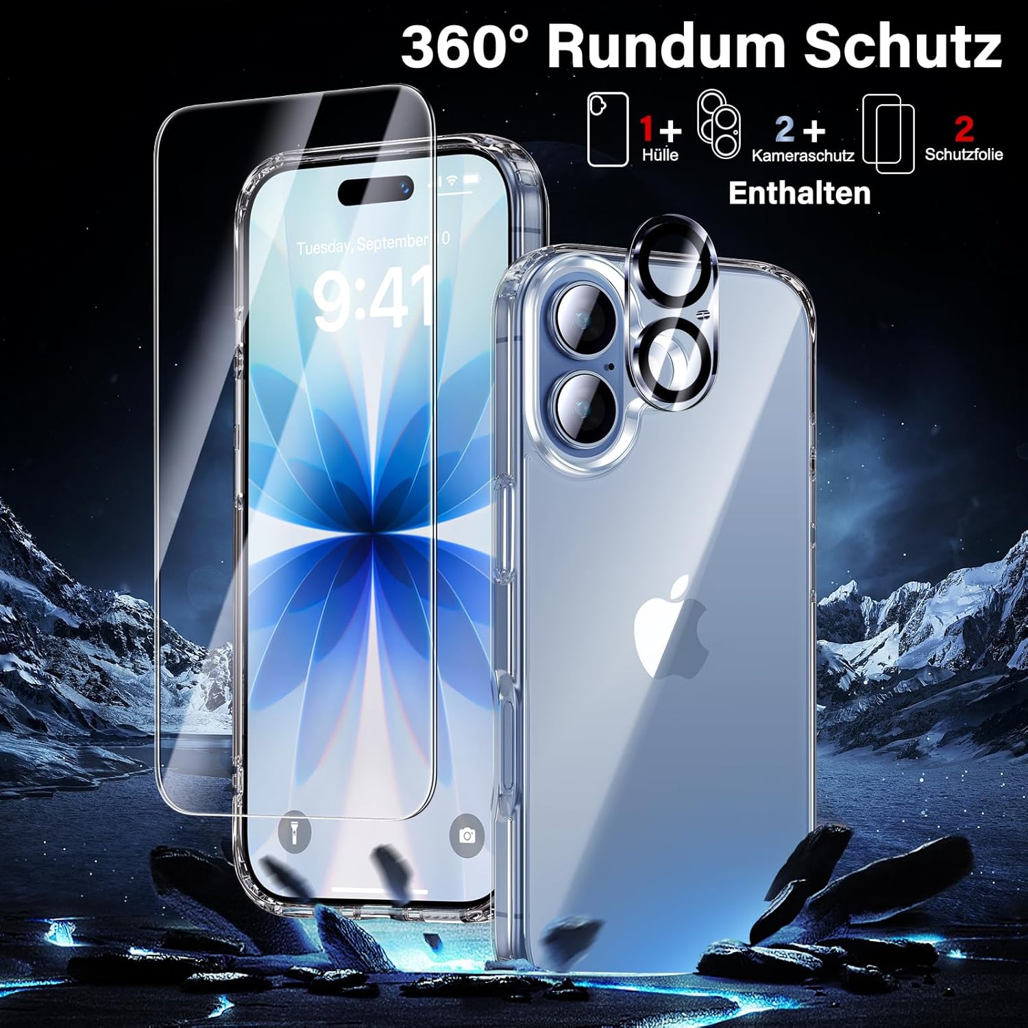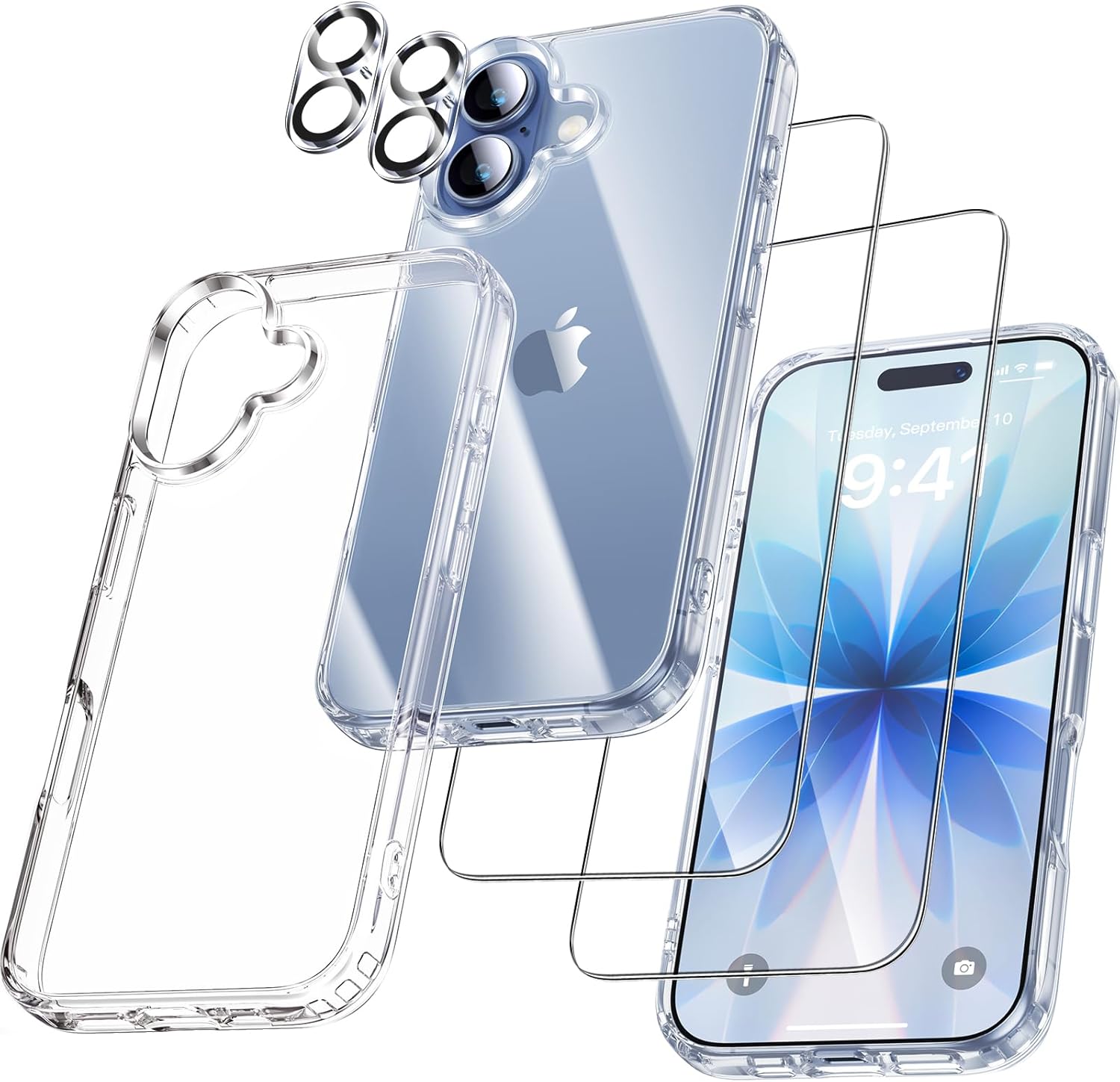 UniqueMe калъф за iPhone 17 - Калъф за мобилен телефон за iPhone 17, комплект 5 в 1, защитен калъф за цялостна защита, 1 калъф за мобилен телефон, 2 протектора за екран и 2 протектора за камера - прозрачен