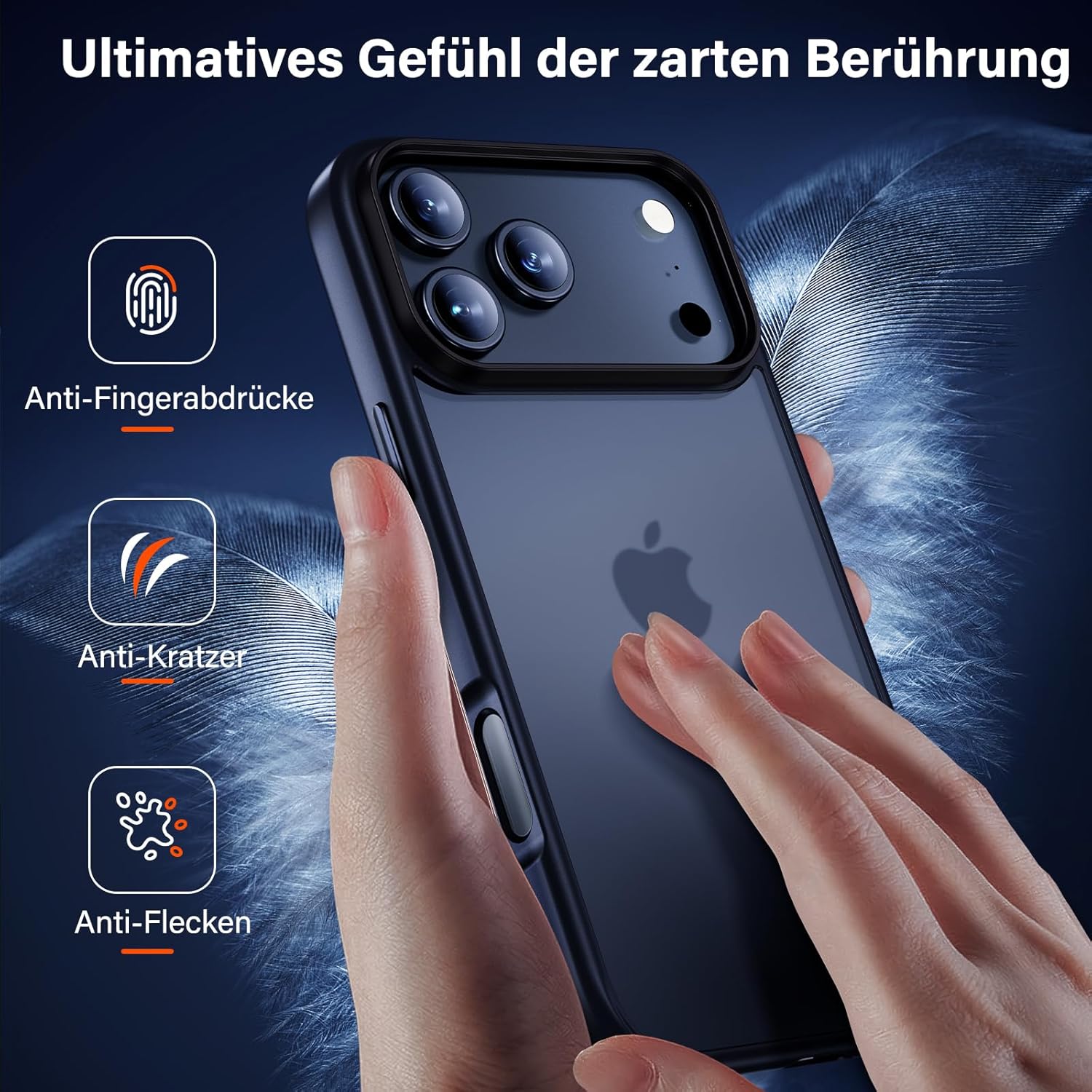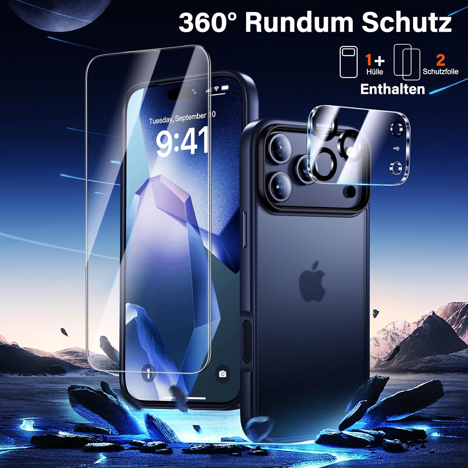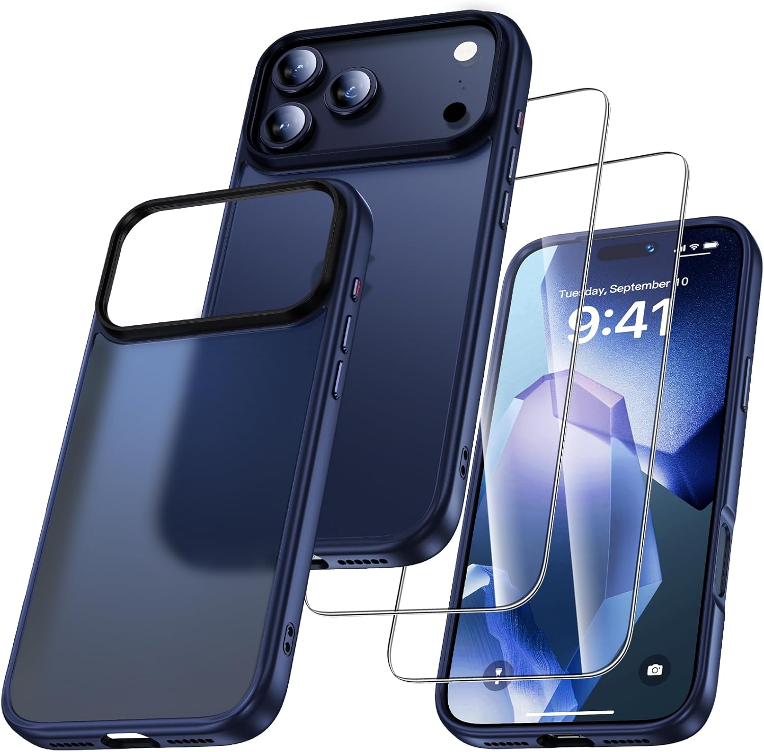 UniqueMe калъф за iPhone 17 Pro - калъф за мобилен телефон за iPhone 17 Pro, комплект калъфи за цялостна защита, защитен калъф, 1 калъф за мобилен телефон и 2 протектора за екран - матово син