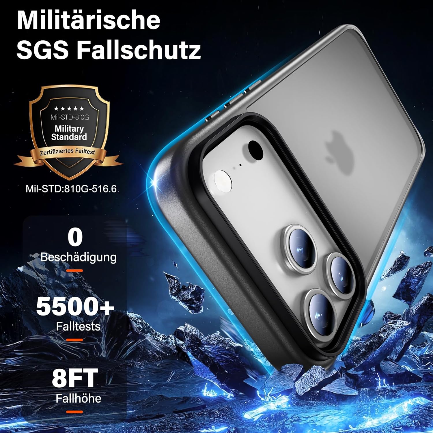 • 8-футова военна защита: този калъф за мобилен телефон за iPhone 17 е изработен от висококачествен, уникален антишоков дизайн на всичките четири ъгъла на калъфа и предпазва телефона ви от случайни падания, удари и драскотини.