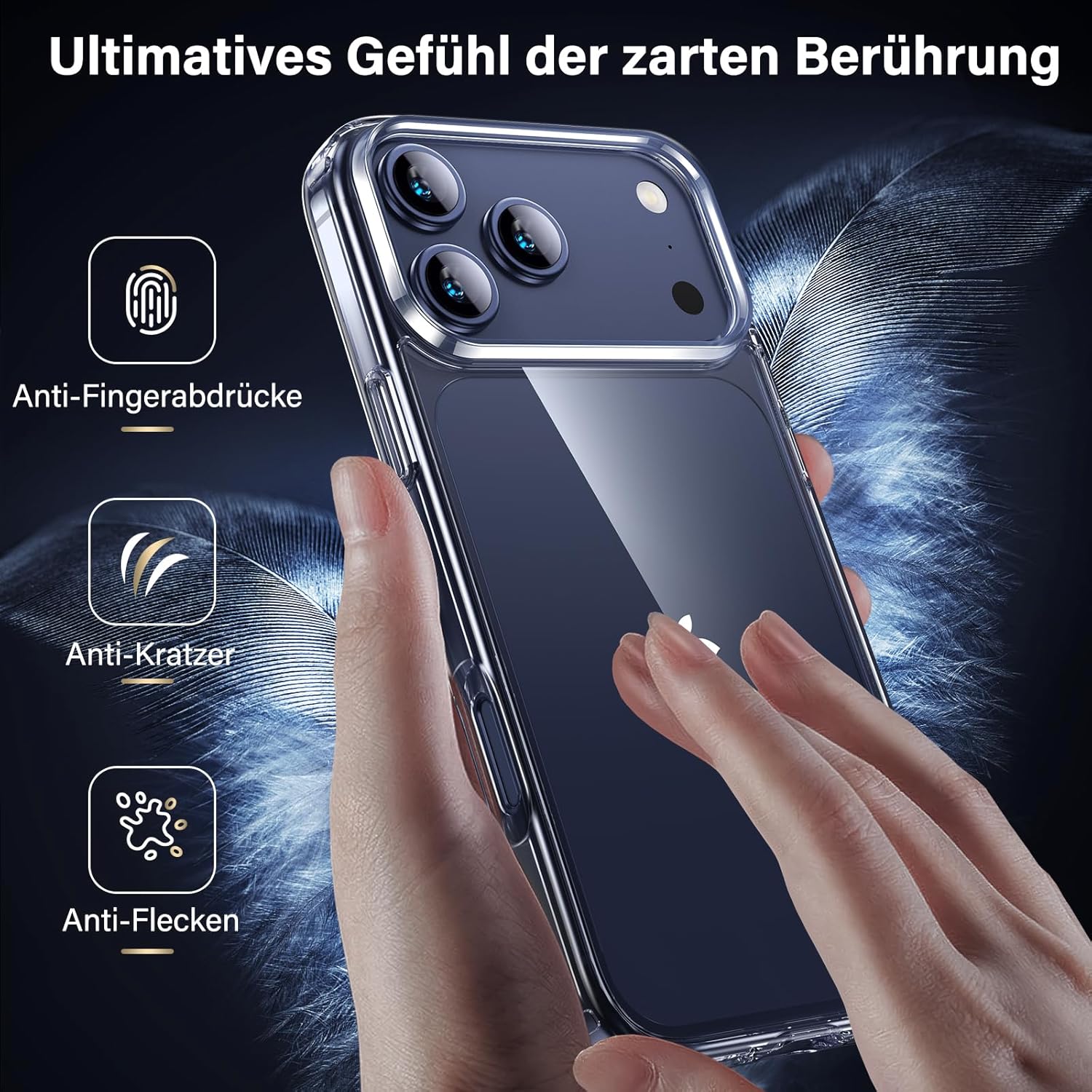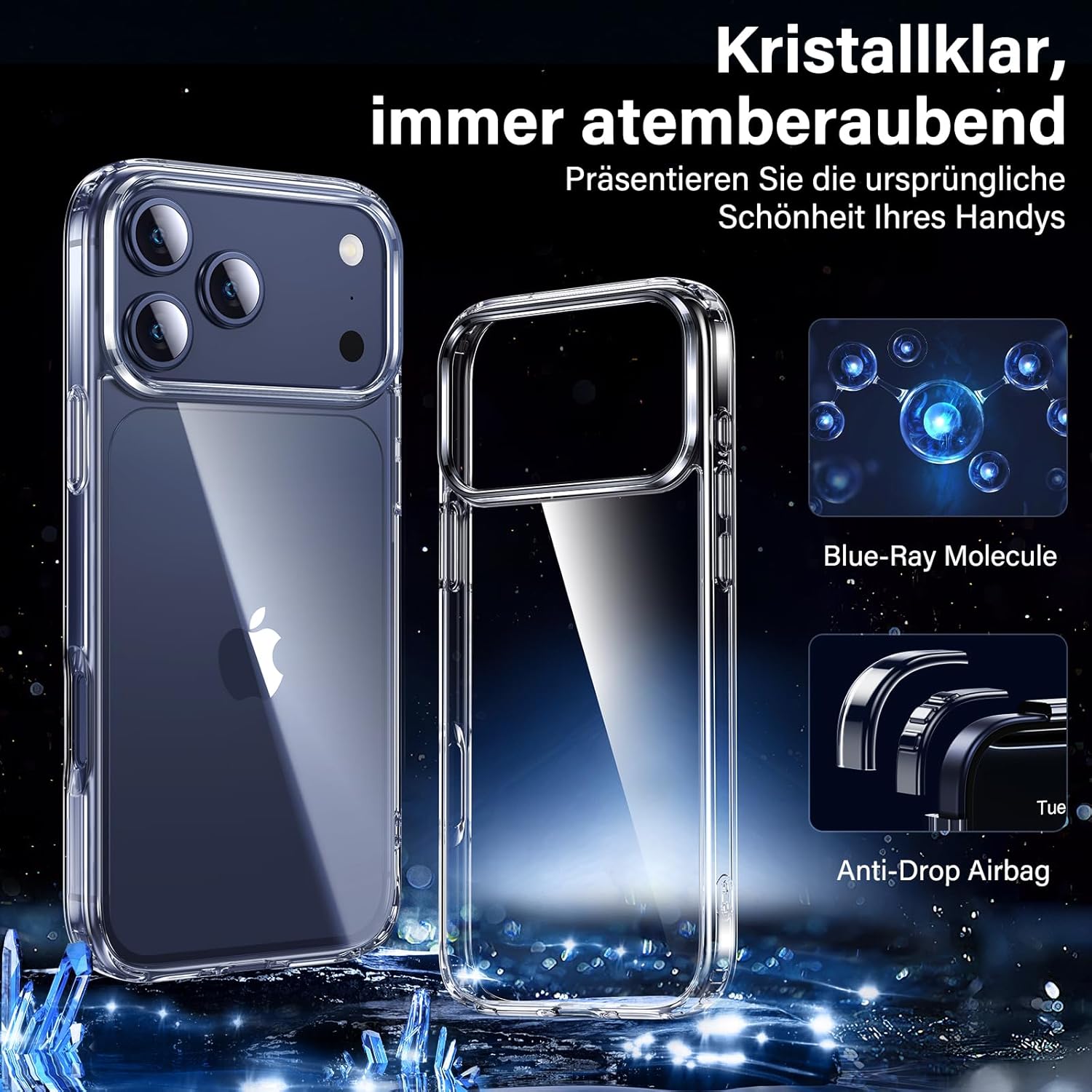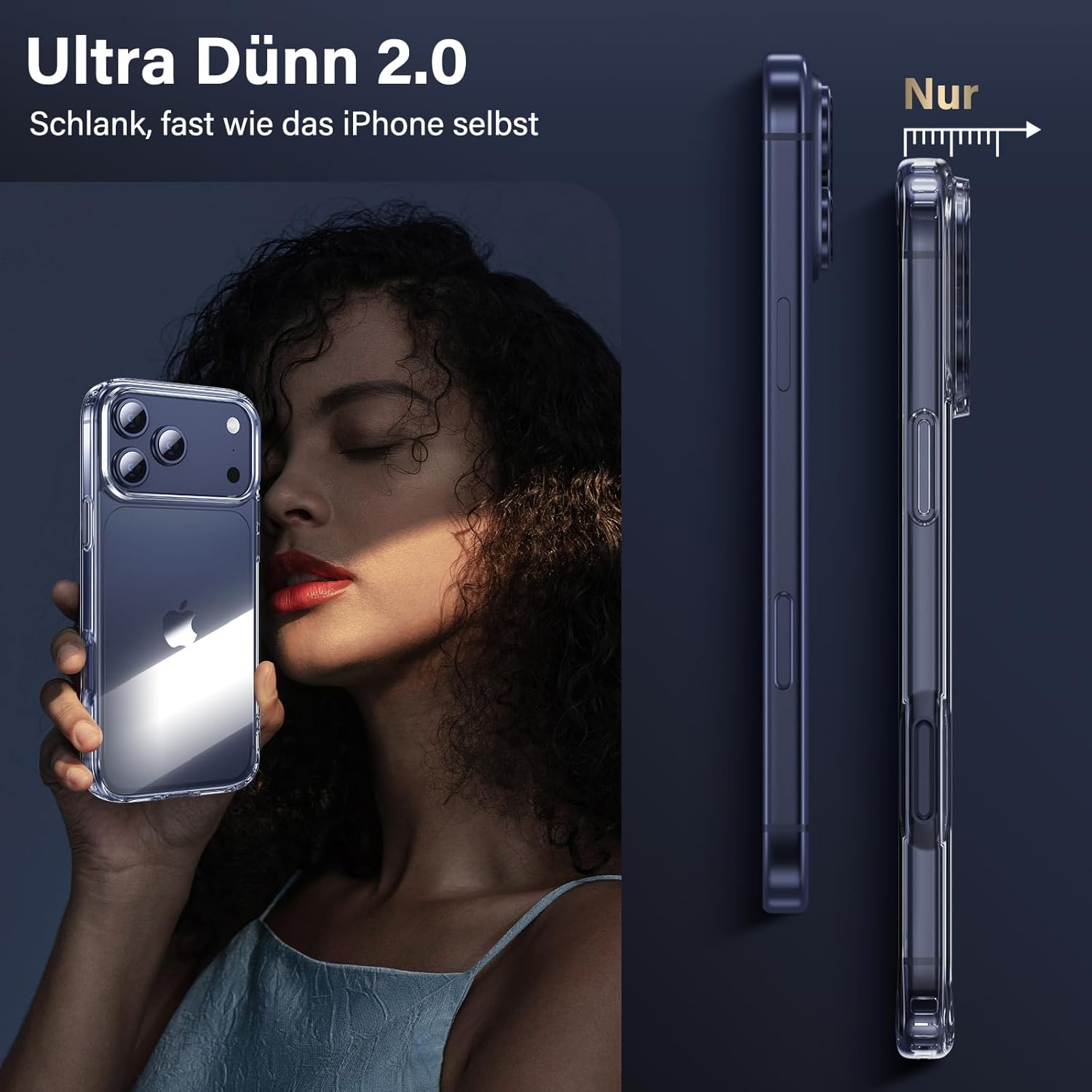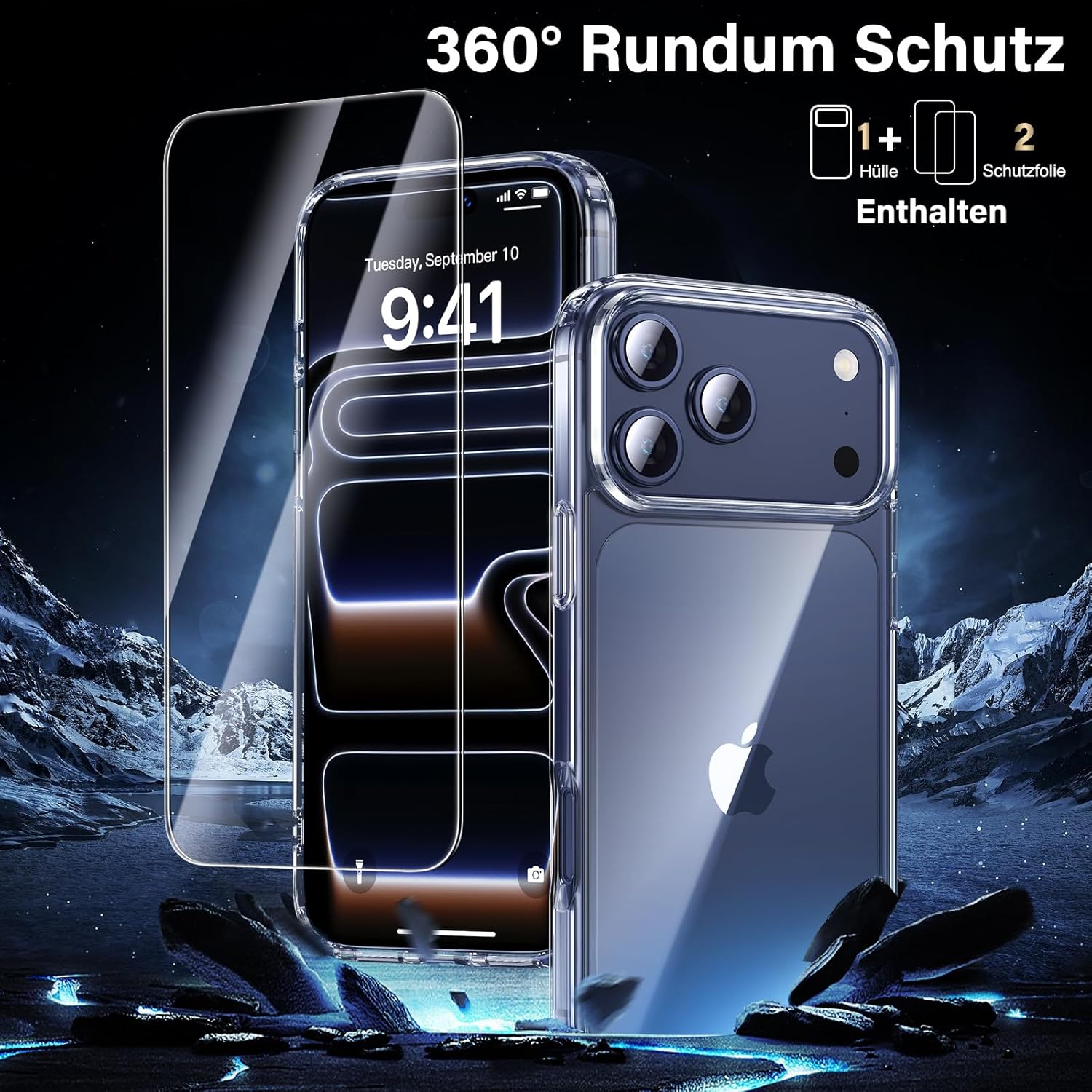 UniqueMe калъф за iPhone 17 Pro Max - калъф за мобилен телефон за iPhone 17 Pro Max, комплект калъфи за цялостна защита, защитен калъф, 1 калъф за мобилен телефон и 2 протектора за екран - прозрачен