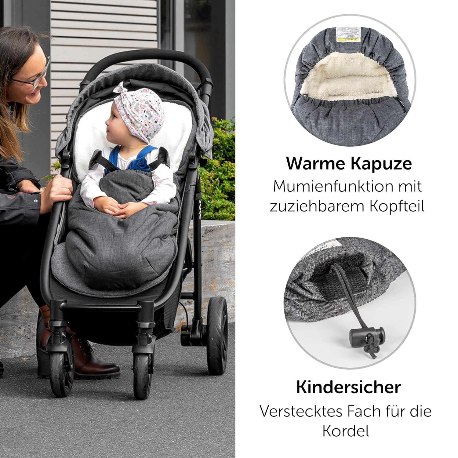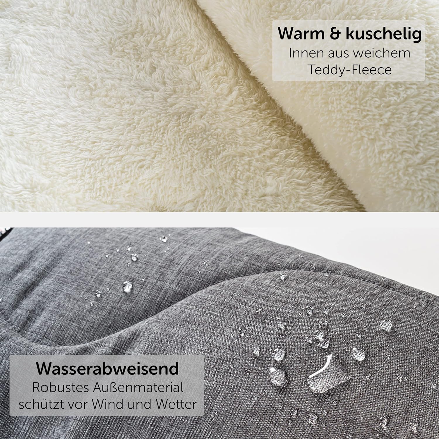 • Гъвкава употреба: мекият чувал за крачета за бебето топли детето ви от раждането му в бебешката вана, столчето за кола или първите месеци в количката. Водоотблъскващият материал предпазва от сняг и дъжд.
