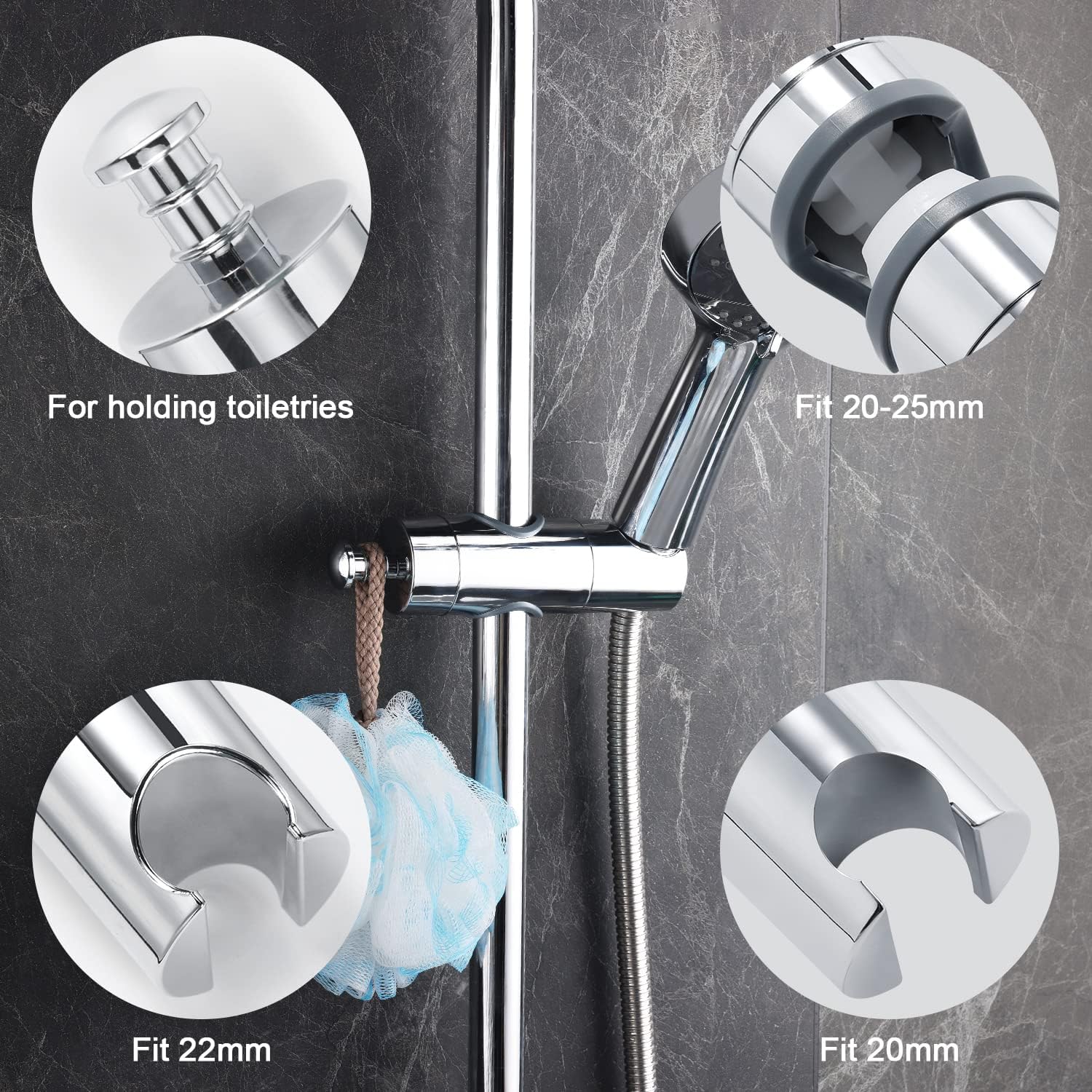Универсален държач за ръчен душ Joyoldelf, регулируем държач за душ, държач за душ глава, въртящ се на 360° държач за душ за плъзгаща се дръжка, външен диаметър 20-25 мм, хромиран държач за душ