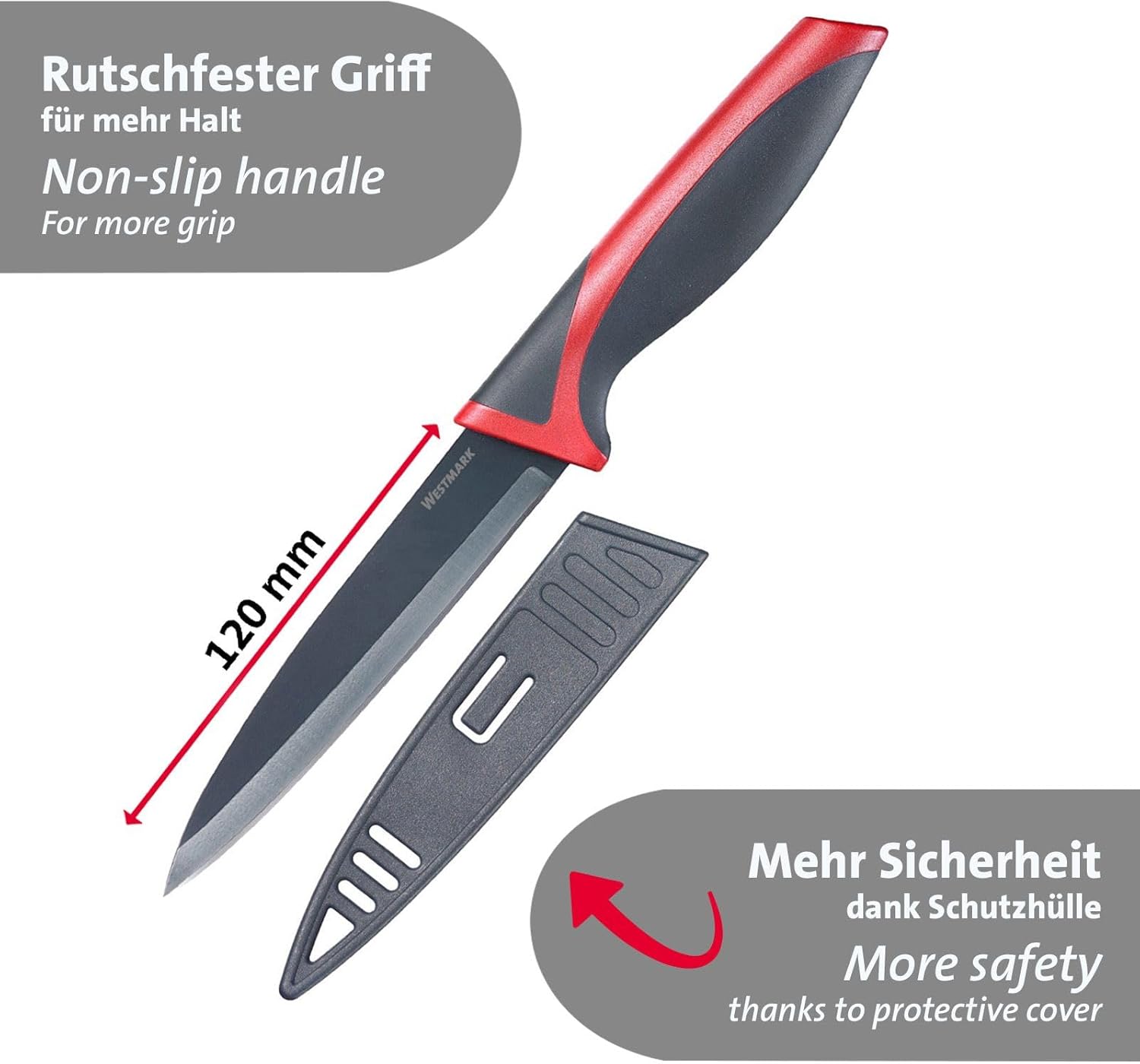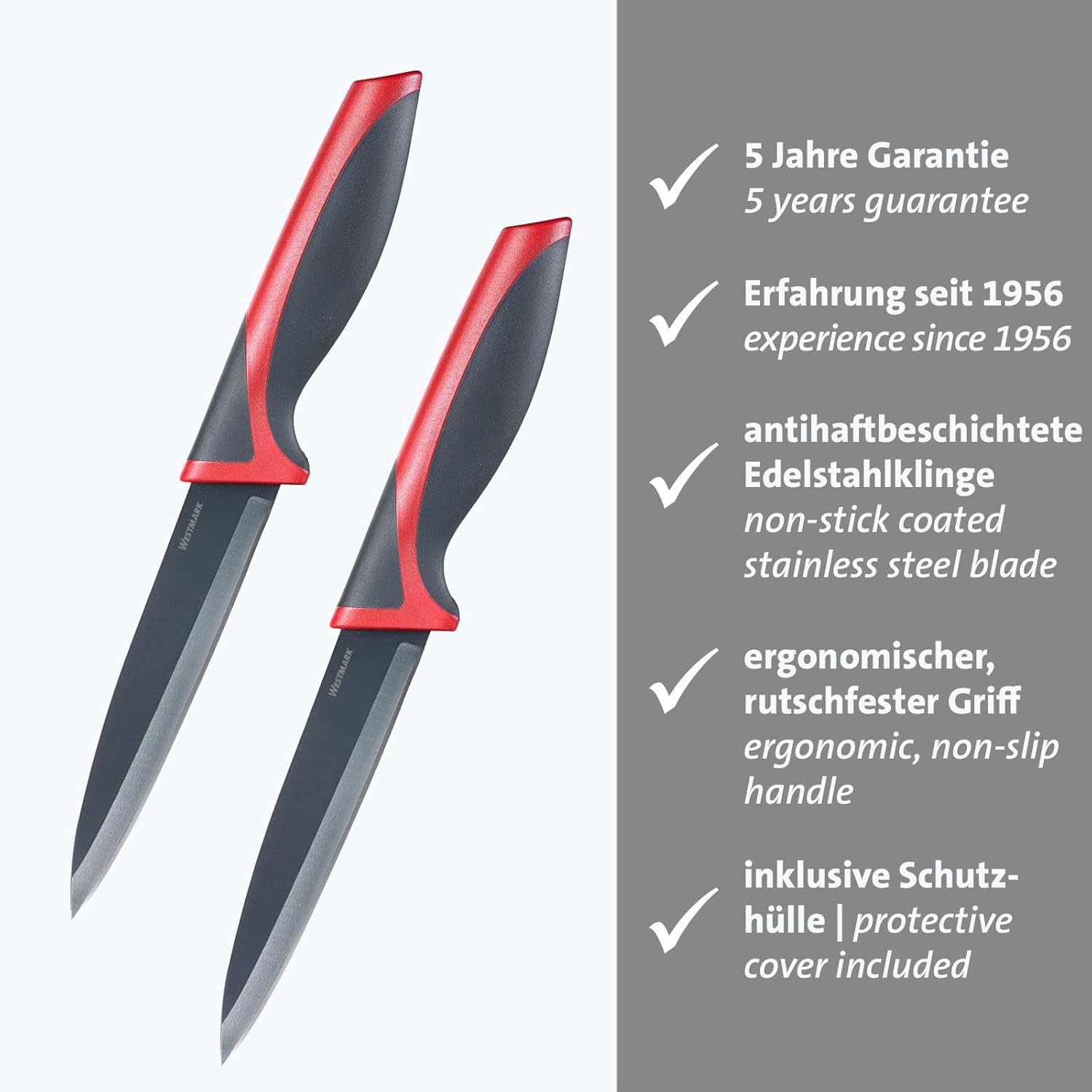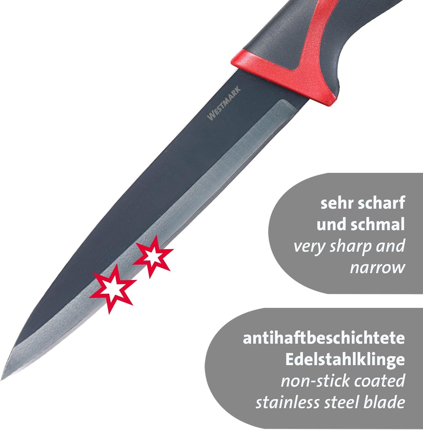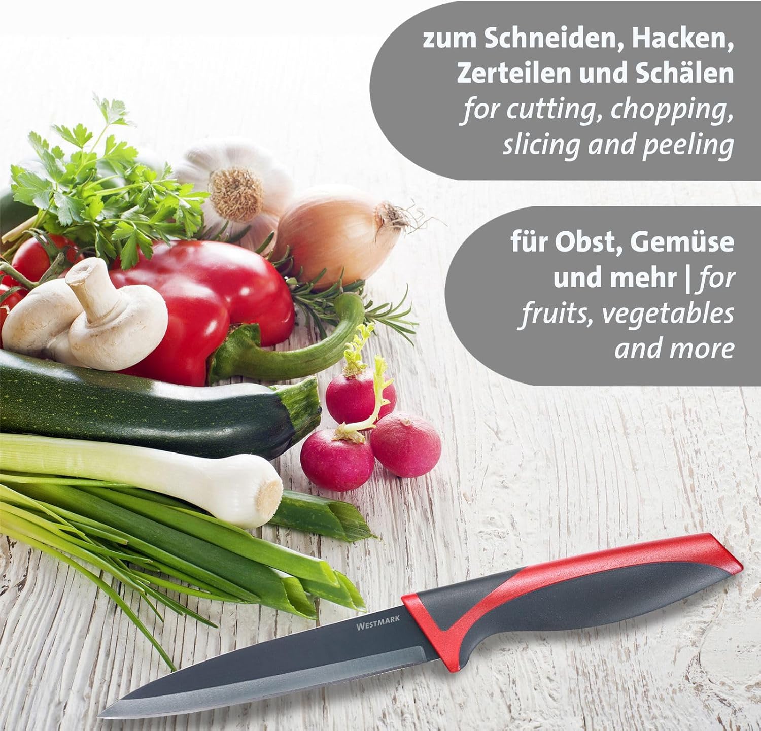 Надеждни и висококачествени кухненски помощнициПрактичните ножове Westmark са идеални помощници във всяка кухненска ситуация. Те са с остриета от неръждаема стомана, неръждаеми, и режат хляб, месо, зеленчуци или плодове бързо и прецизно. Ергономично оформените и лесни за хващане дръжки осигуряват сигурен и неплъзгащ се захват.
