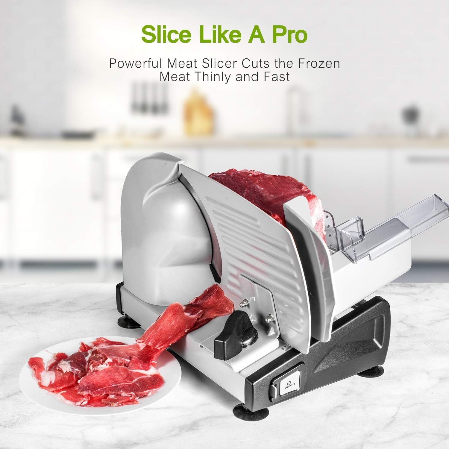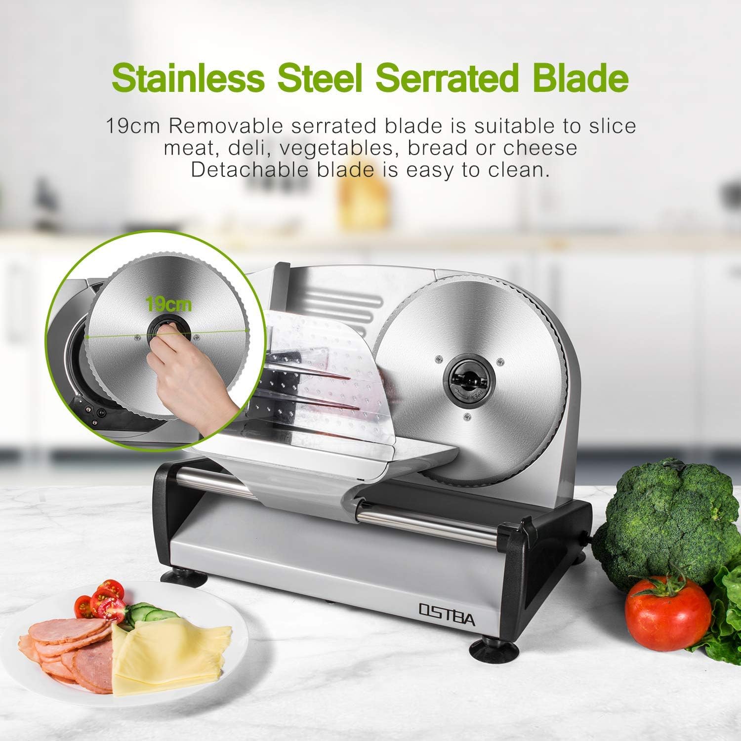 • Универсално острие от неръждаема стомана - Месорезачката Ostba е оборудвана с назъбено острие с дължина 19 см (7,5 инча), изработено от неръждаема стомана, и се захранва от мощна режеща мощност от 150 вата с висока ефективност. Това означава, че можете лесно да постигнете гладко и остро рязане.
