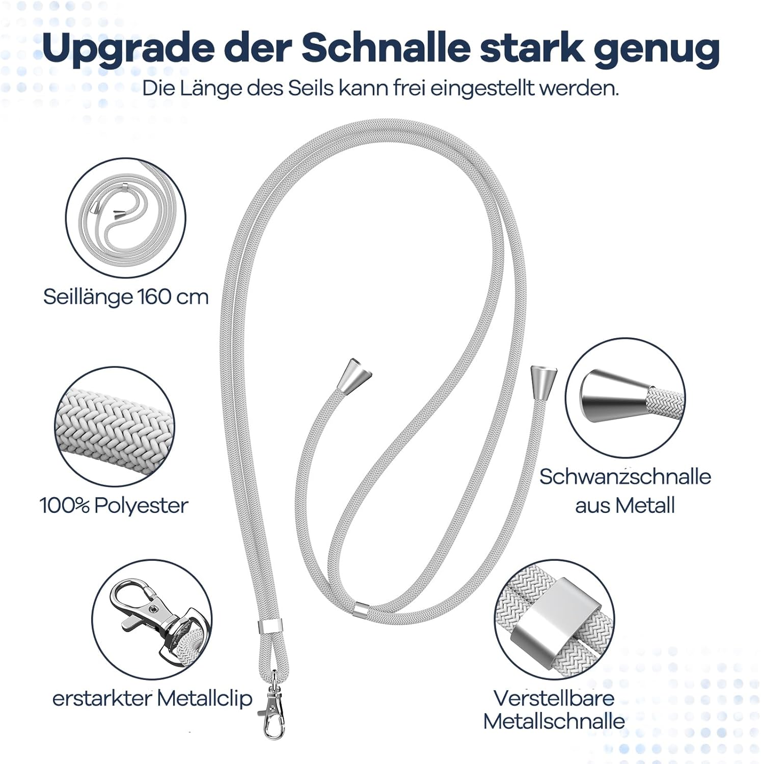 • Висококачествен материал: въжето е изтъкано от 100% полиестер, лентата е с дължина 1,6 метра и е регулируема, издръжлива и без мирис. Мекият полиестерен шнур осигурява комфорт на врата. Прибираща се дължина и подвижна катарама, можете да го използвате както желаете.