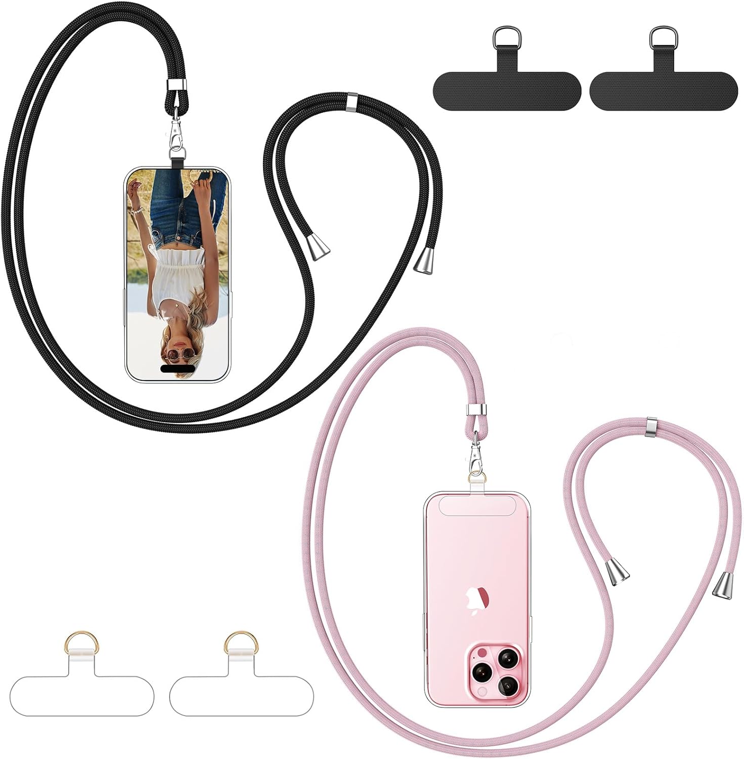 Универсална каишка за мобилен телефон, пакет от 2 каишки за мобилен телефон и 4 универсални подложки, каишка за мобилен телефон с калъф, регулируема и сваляща се, черно + розово злато