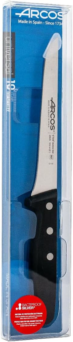 • Универсален нож за сьомга Arcos с висококачествено острие от неръждаема стомана за кухнята. Този нож ви позволява да нарязвате сьомга на парчета с всякаква дебелина и да се наслаждавате на изискания ѝ вкус. Вдлъбнатината на острието осигурява по-чисти разрези и предотвратява залепването на остатъци от храна по ножа.