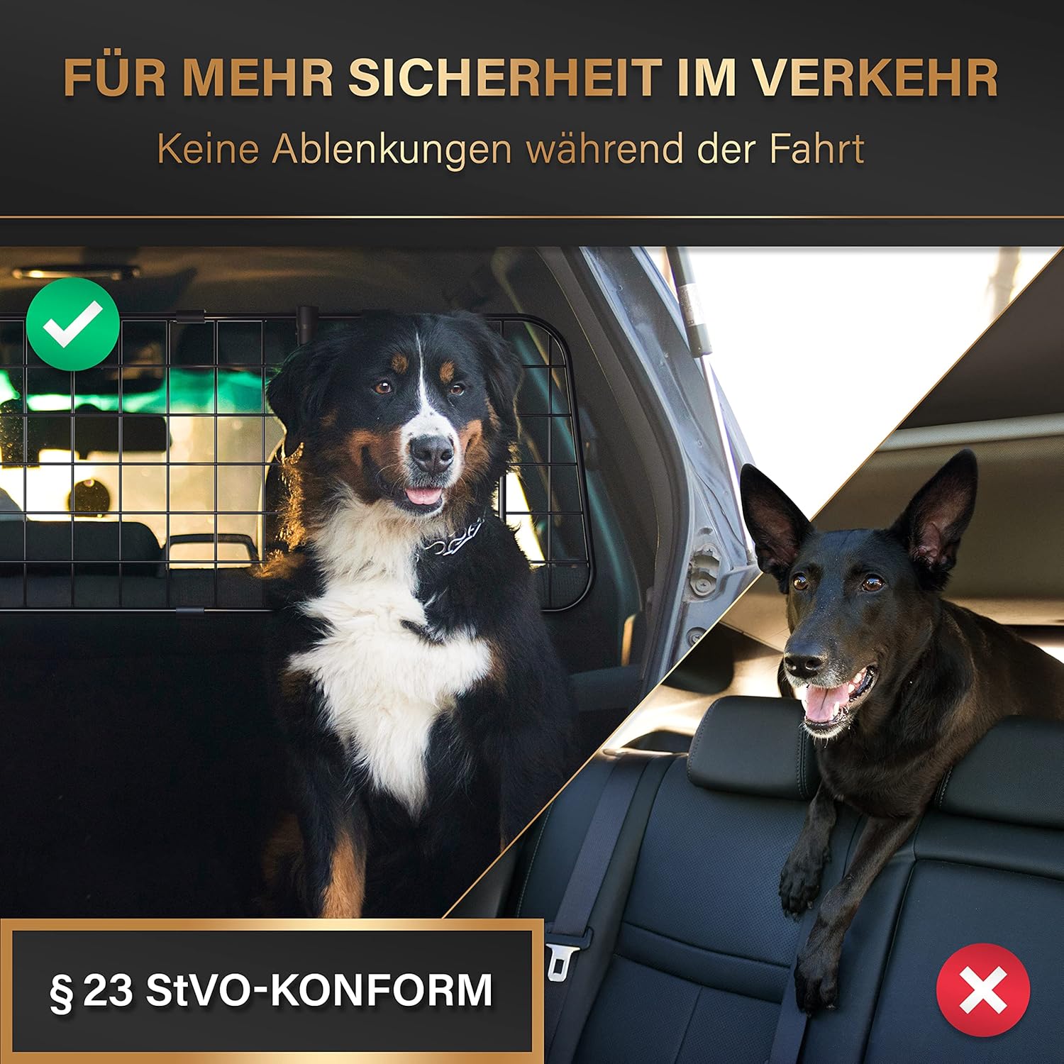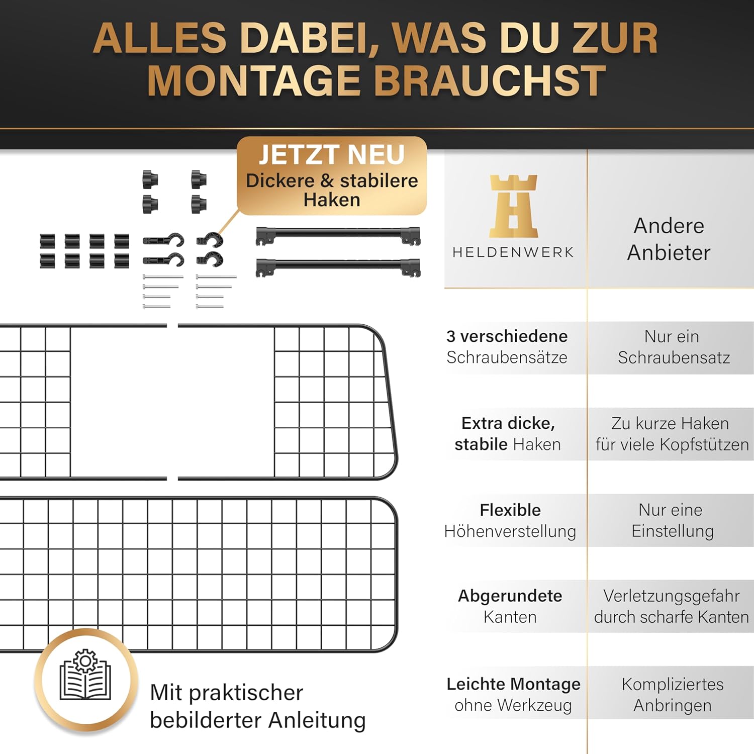 • Пълна безопасност - решетката за кучета Heldenwerk отговаря на §23 от немския Правилник за движение по пътищата и гарантира вашата безопасност в движението: Те не могат да бъдат разсеяни, а кучето ви е защитено и от летящи предмети. Защото безопасността винаги е приоритет както за хората, така и за кучетата.