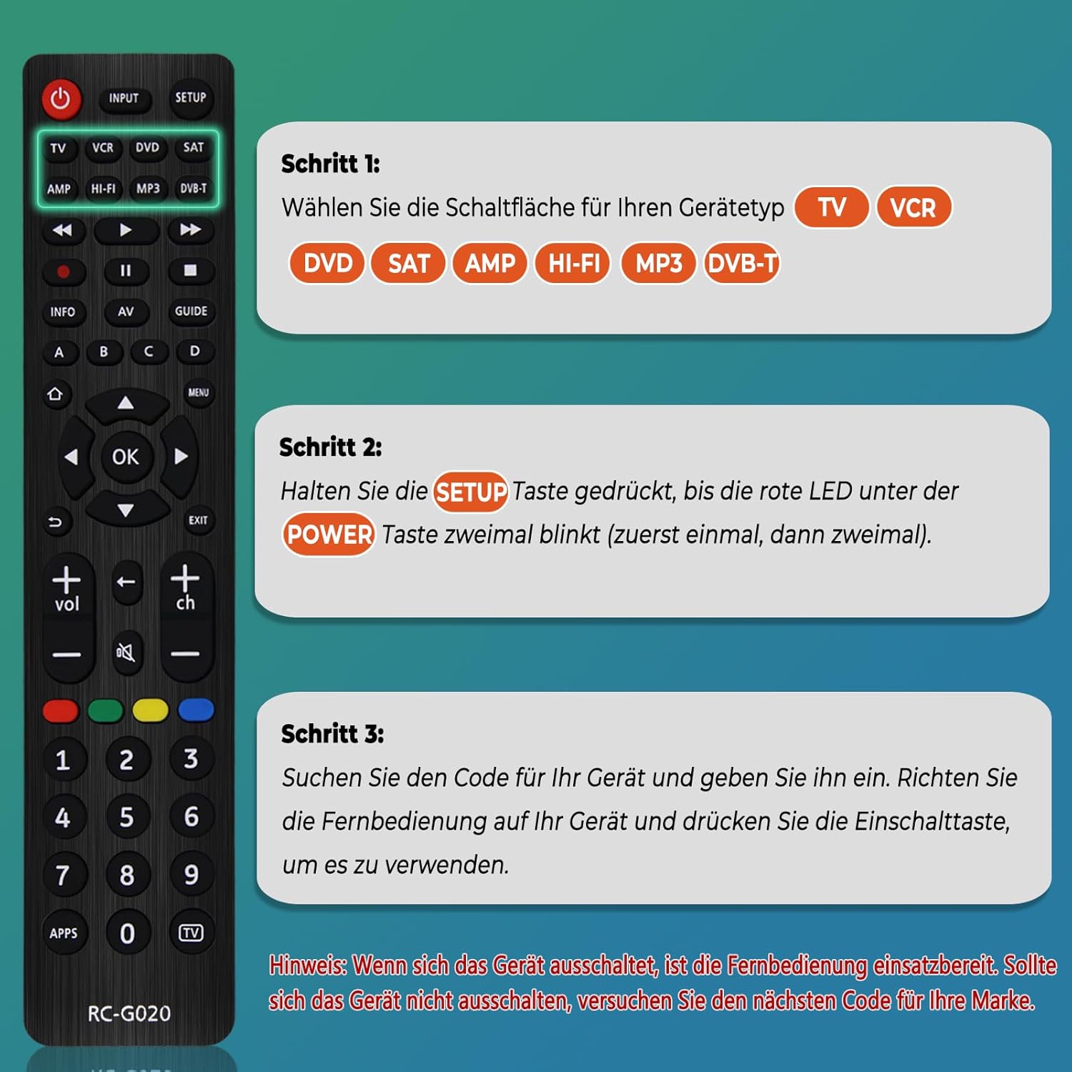 • Лесно за употреба и работи чудесно: настройването на това универсално дистанционно управление е бързо и лесно: 1. Натиснете бутона на устройството (напр. телевизор, видеорекордер, DVD, сателит...). 2. Натиснете и задръжте бутона за настройка, докато бутонът за захранване мигне два пъти. 3. Въведете първия 4-цифрен код за вашето устройство. 4. ТЕСТВАЙТЕ БУТОНИТЕ - Ако не работят, повторете стъпките със следващия код. Нуждаете се от помощ? Свържете се с нас по всяко време!
